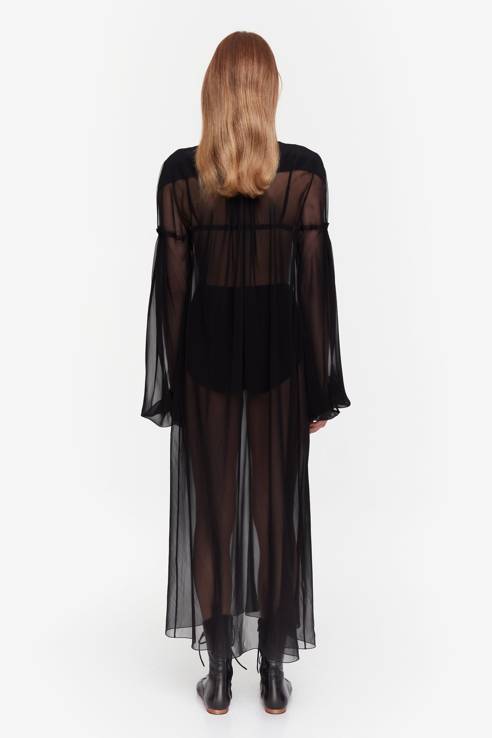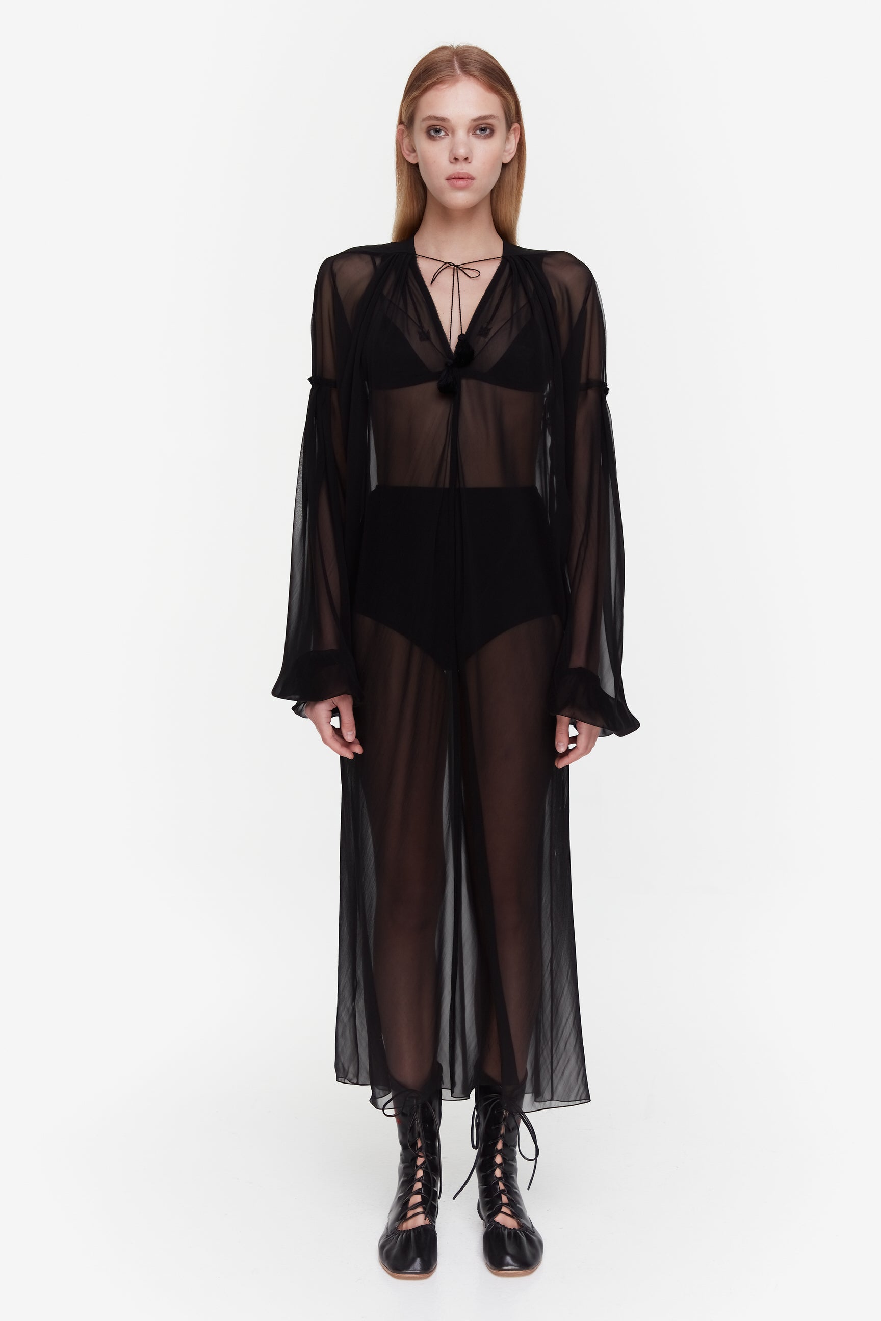 A LOOSE-FITTING DRESS REMINISCENT OF TRADITIONAL UKRAINIAN SHIRTS. IT IS ADORNED WITH CROSS-STITCH EMBROIDERY IN THE SAME TONE AS THE DRESS. THE EMBROIDERY PATTERN, CRAFTED BY HAND, RESEMBLES A CARNATION FLOWER.