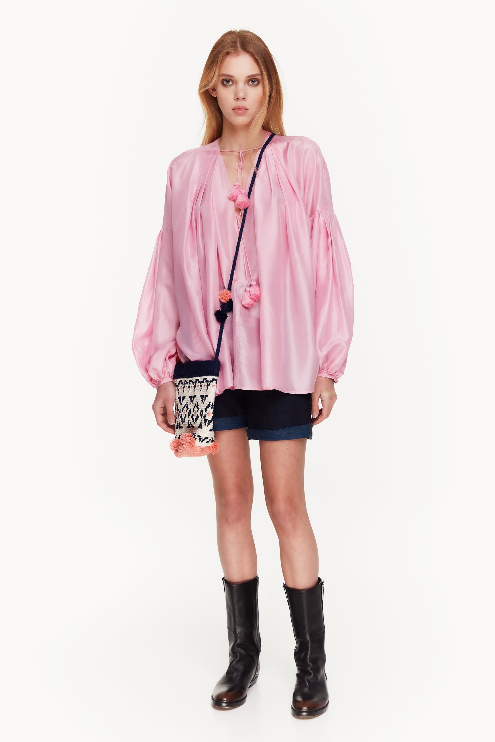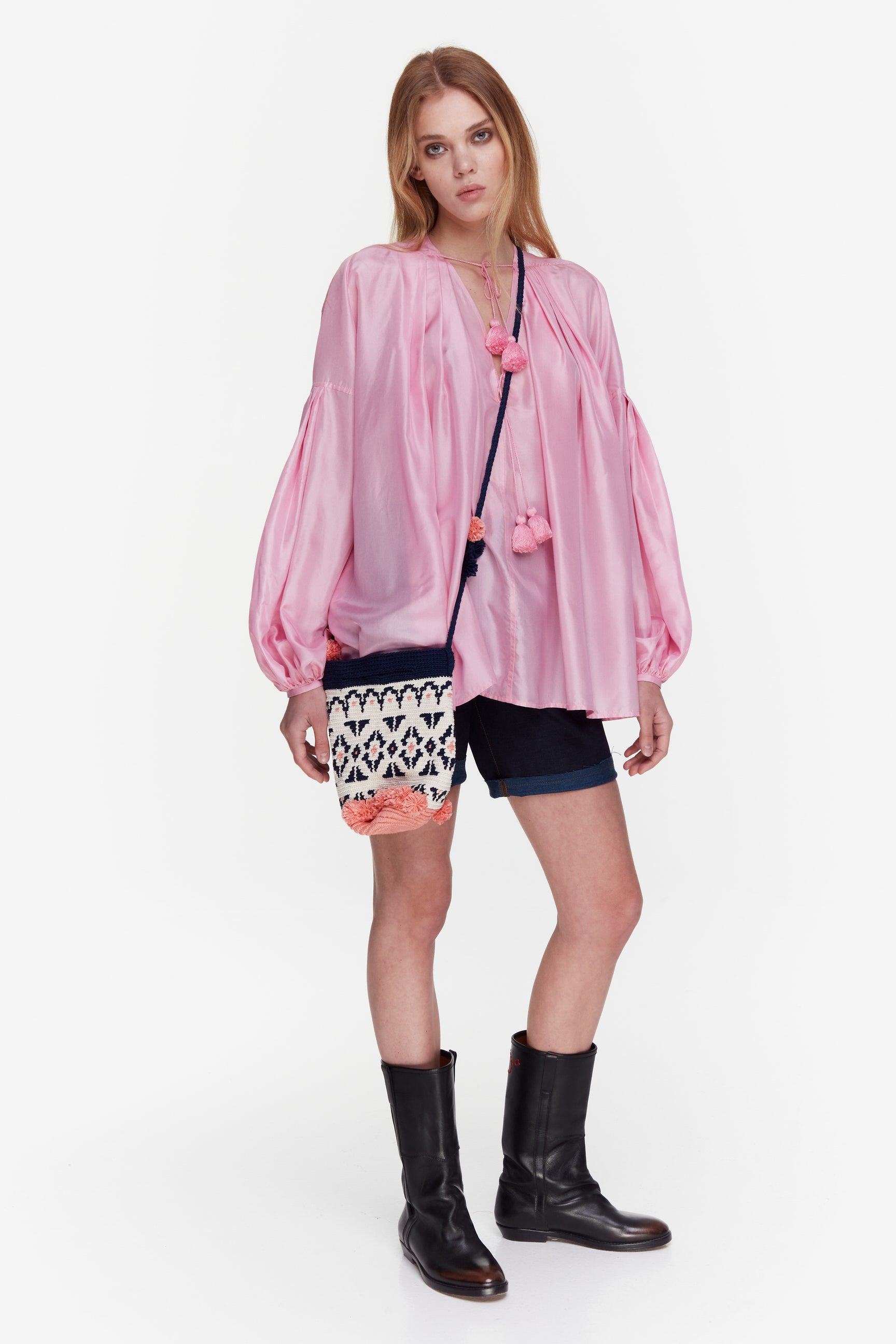 LUVI HAS BEEN RESEARCHING TRADITIONAL KNITTED MOTIVES TO CREATE ACCESSORIES. THIS VERSION OF THE FOLK-INSPIRED BAG IS DESIGNED WITH COLORFUL ORNAMENTS THAT MAKE IT PARTICULARLY DISTINCT. MADE FROM COTTON YARN, IT HAS A LONG STRAP WITH POMPONS THAT ALLOWS YOU TO WEAR IT CROSS-BODY.
