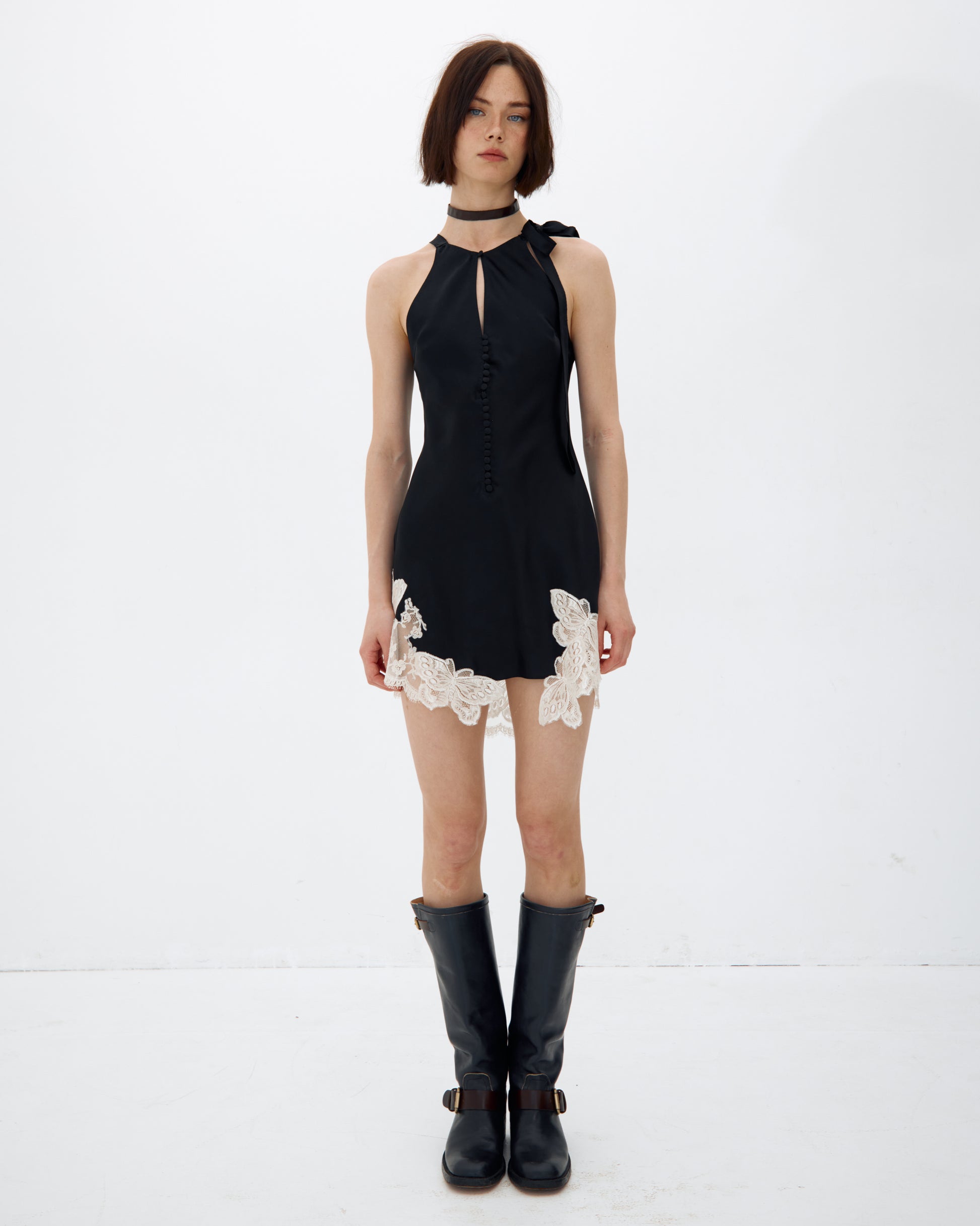 A FITTED MINI-LENGTH DRESS. IT FEATURES A LONG FRONT SLIT THAT IS HALF-FASTENED WITH SMALL BUTTONS. THE HEM IS ADORNED WITH WHITE LACE BUTTERFLIES. THERE IS ALSO A DECORATIVE ELEMENT ON THE LEFT SHOULDER IN THE SHAPE OF A BOW.