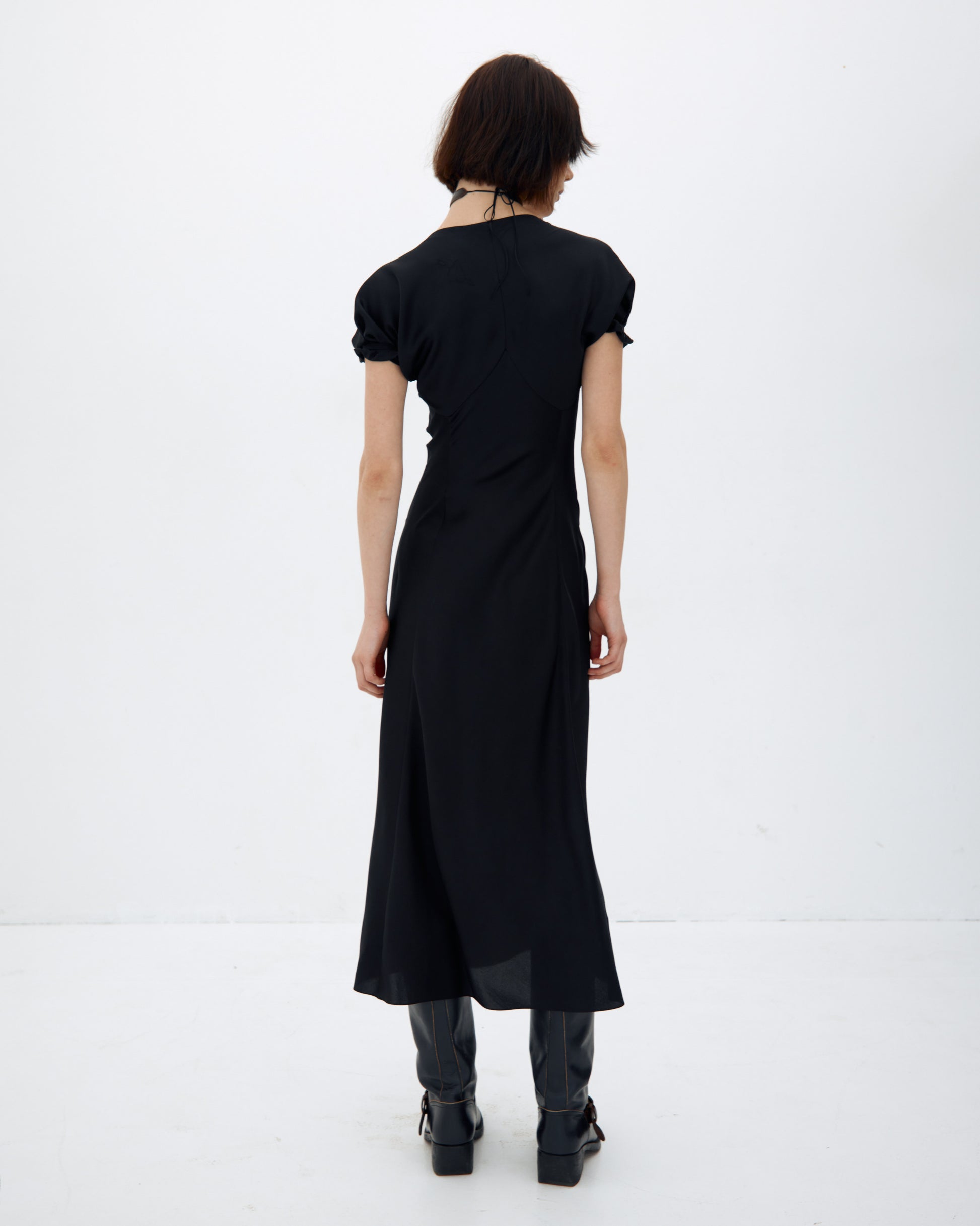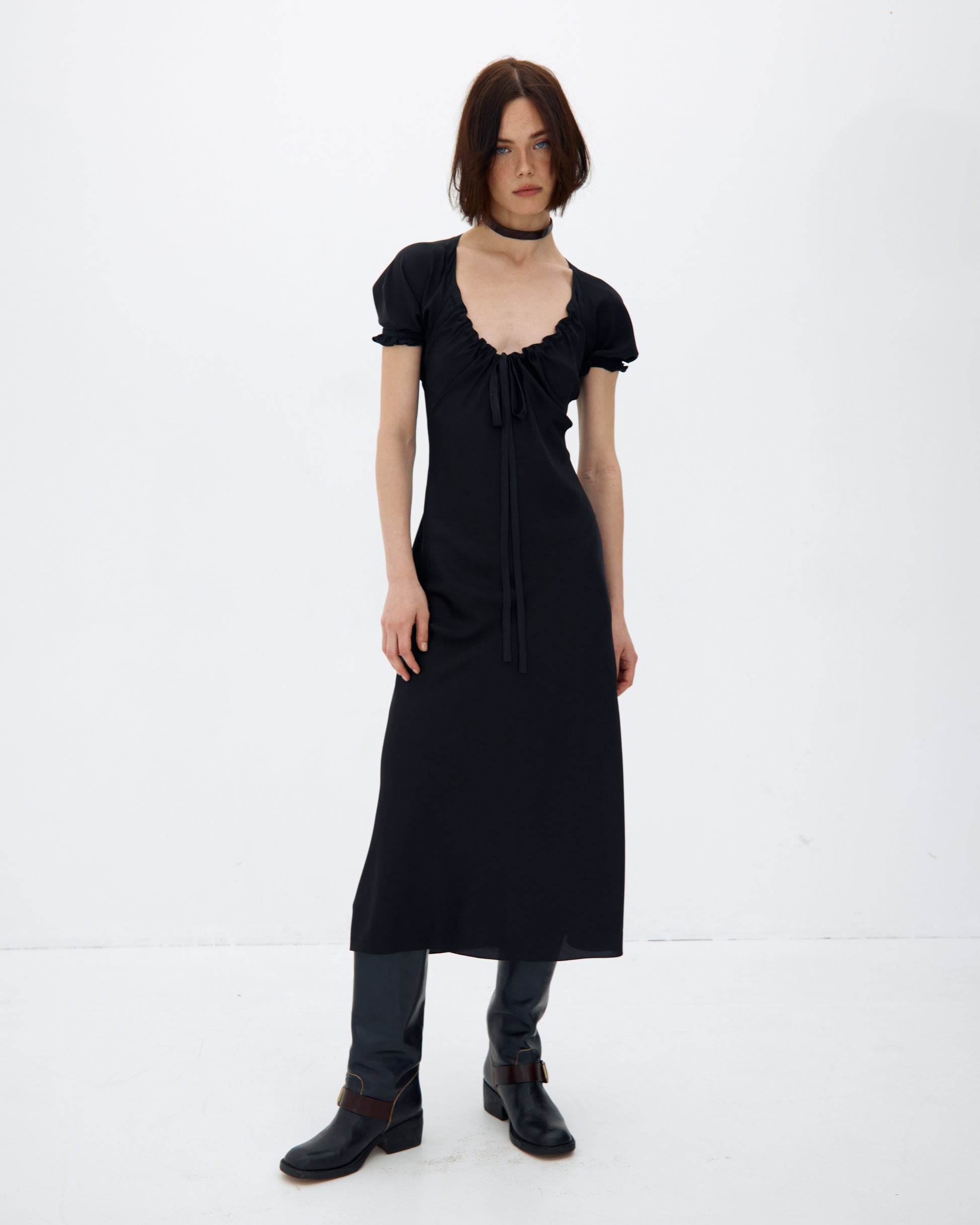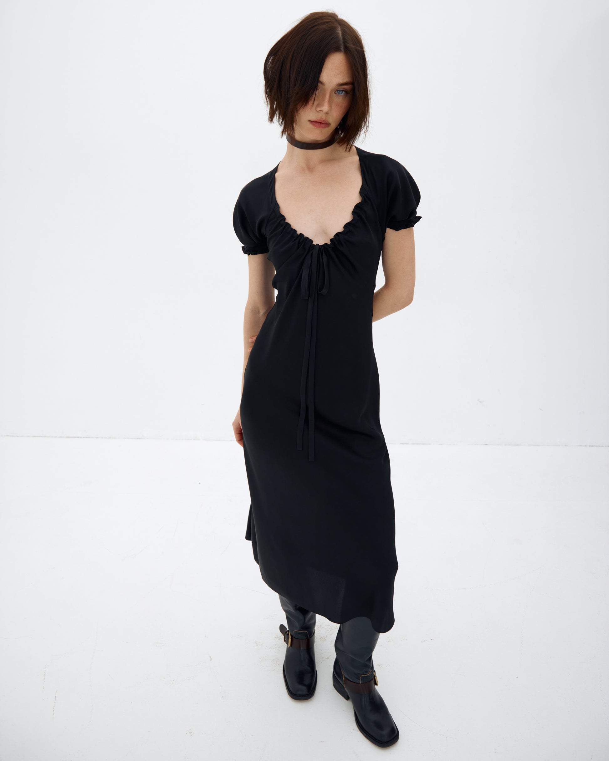 ДОВГА ПРИТАЛЕНА СУКНЯ З ГЛИБОКИМ ДЕКОЛЬТЕ ТА РУКАВАМИ-ЛІХТАРИКАМИ. ПО ДЕКОЛЬТЕ — КУЛІСКА З ЗАВ’ЯЗКОЮ У ВИГЛЯДІ БАНТА, ЗА ДОПОМОГОЮ ЯКОЇ МОЖНА РЕГУЛЮВАТИ ОБ’ЄМ. СУКНЯ СКРОЄНА ПО КОСІЙ.