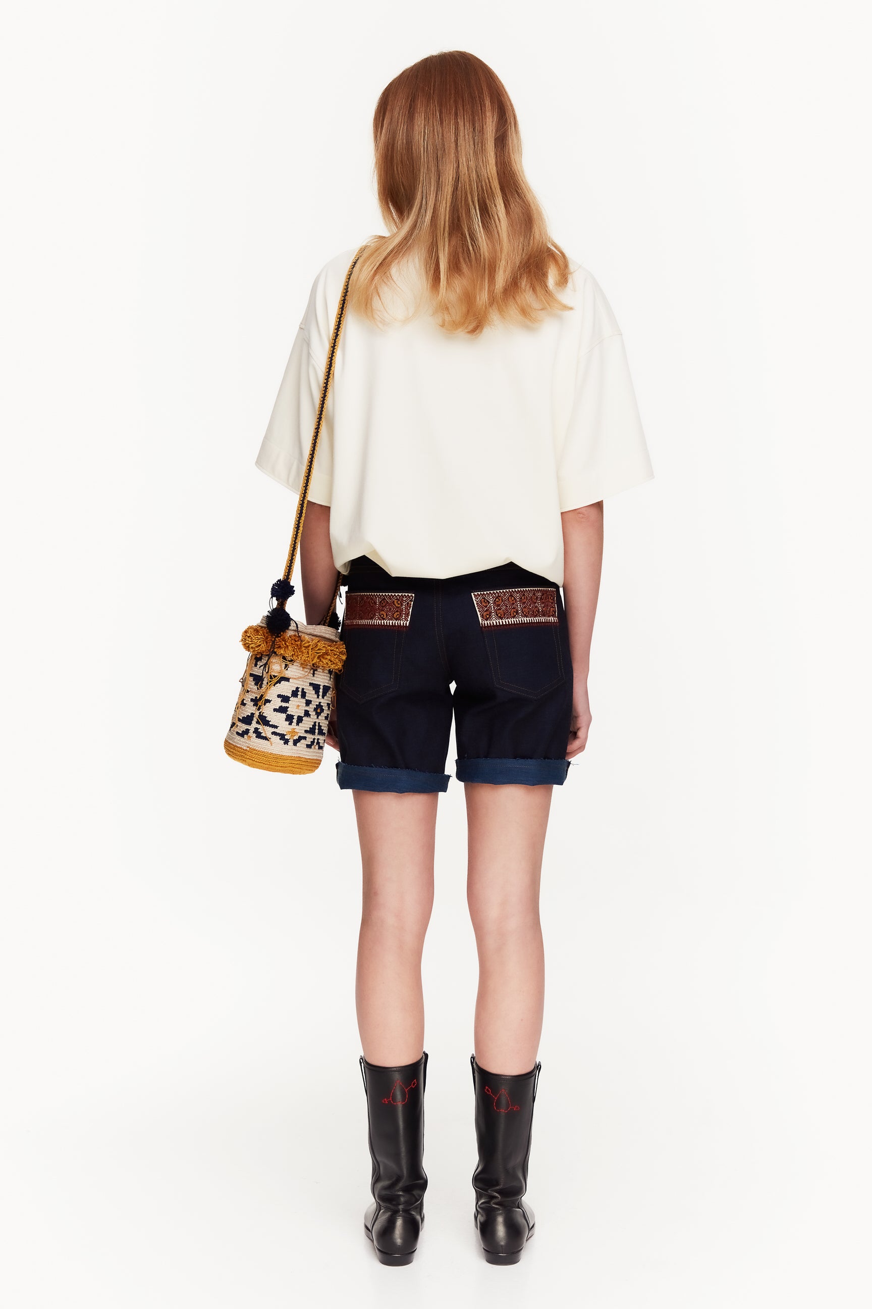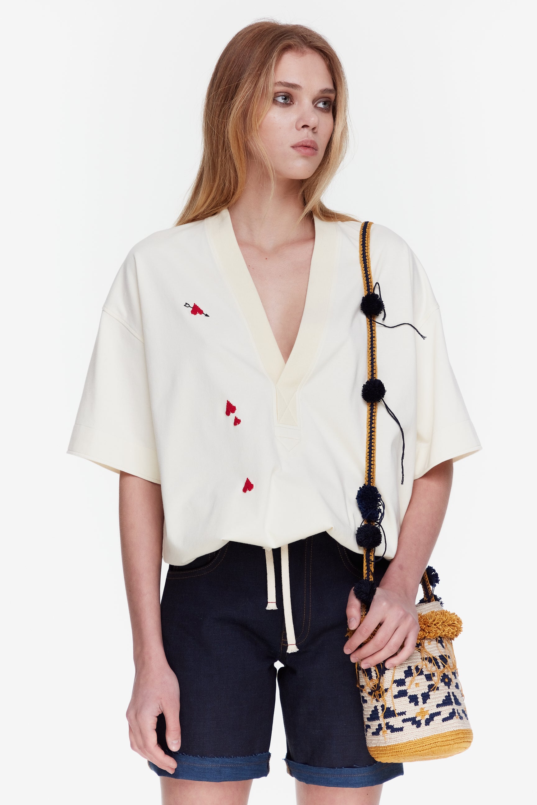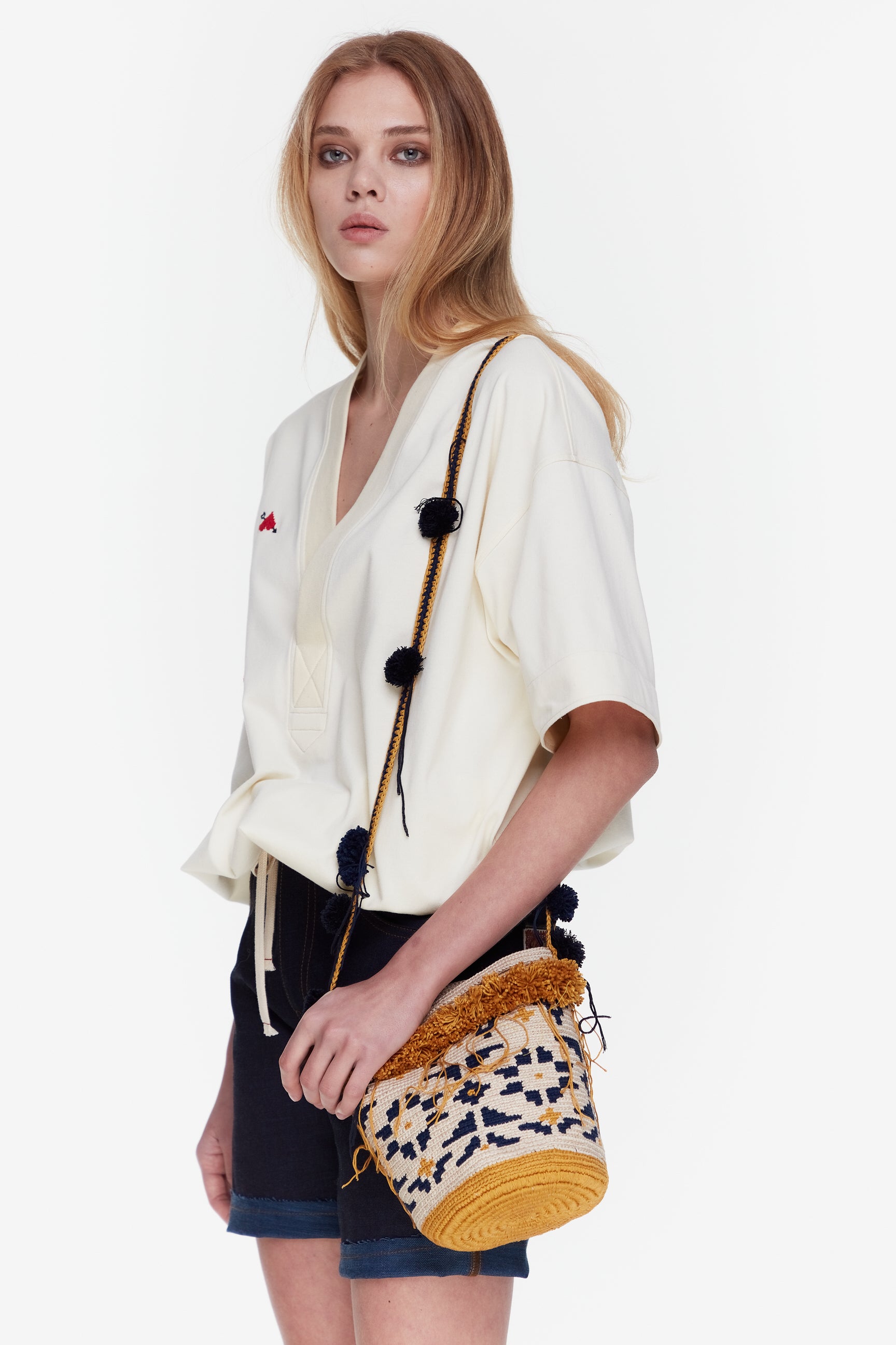 LUVI ДОСЛІДЖУЄ ТРАДИЦІЙНІ В'ЯЗАНІ МОТИВИ ДЛЯ СТВОРЕННЯ АКСЕСУАРІВ. ЦЯ ВЕРСІЯ СУМКИ В НАРОДНОМУ СТИЛІ РОЗРОБЛЕНА З РІЗНОКОЛЬОРОВИМИ ОРНАМЕНТАМИ, ЯКІ РОБЛЯТЬ ЇЇ ОСОБЛИВО ВИРАЗНОЮ. ВИГОТОВЛЕНА З БАВОВНЯНОЇ ПРЯЖІ, МАЄ ДОВГИЙ РЕМІНЕЦЬ, ЩО ДОЗВОЛЯЄ НОСИТИ ЙОГО ЧЕРЕЗ ПЛЕЧЕ.