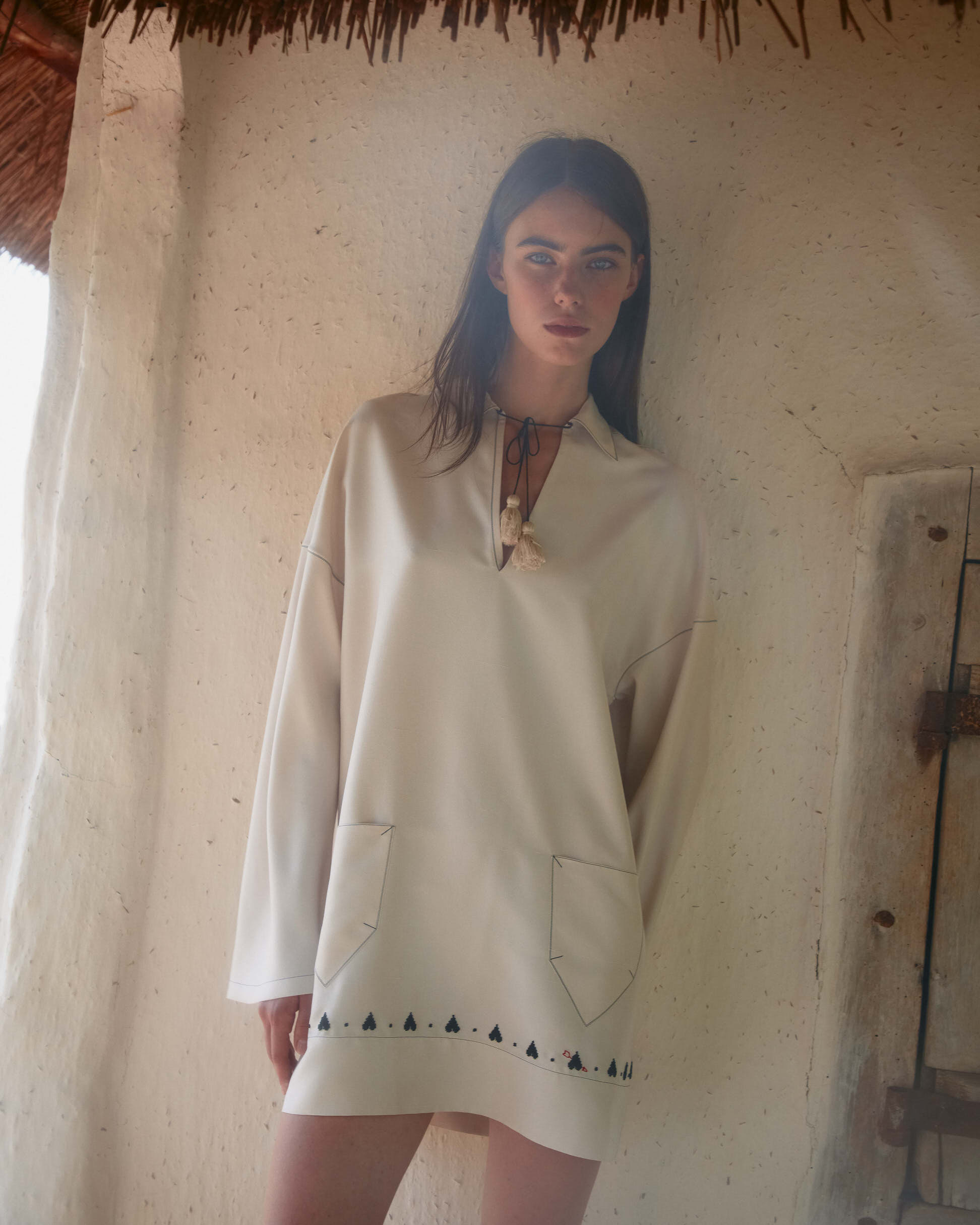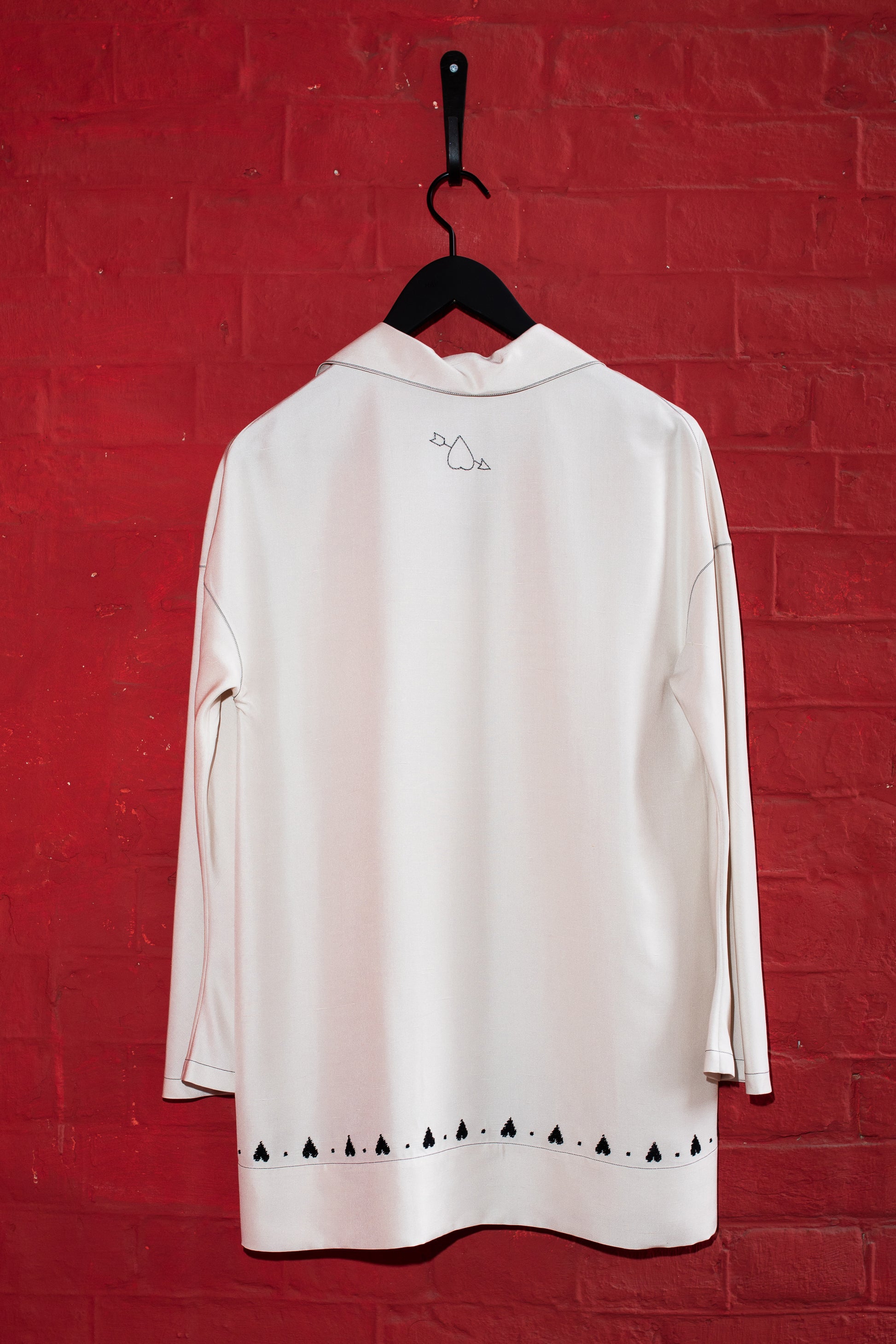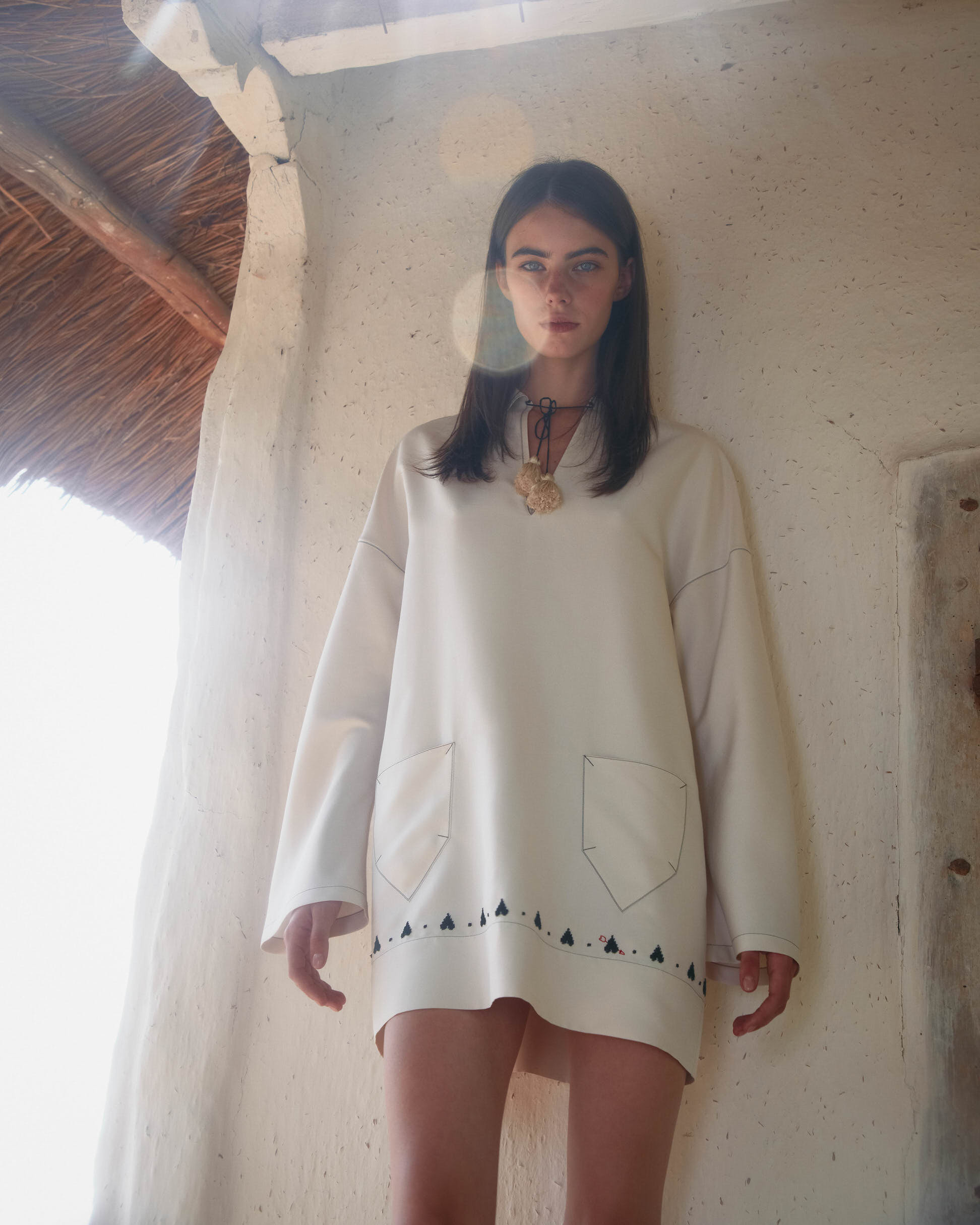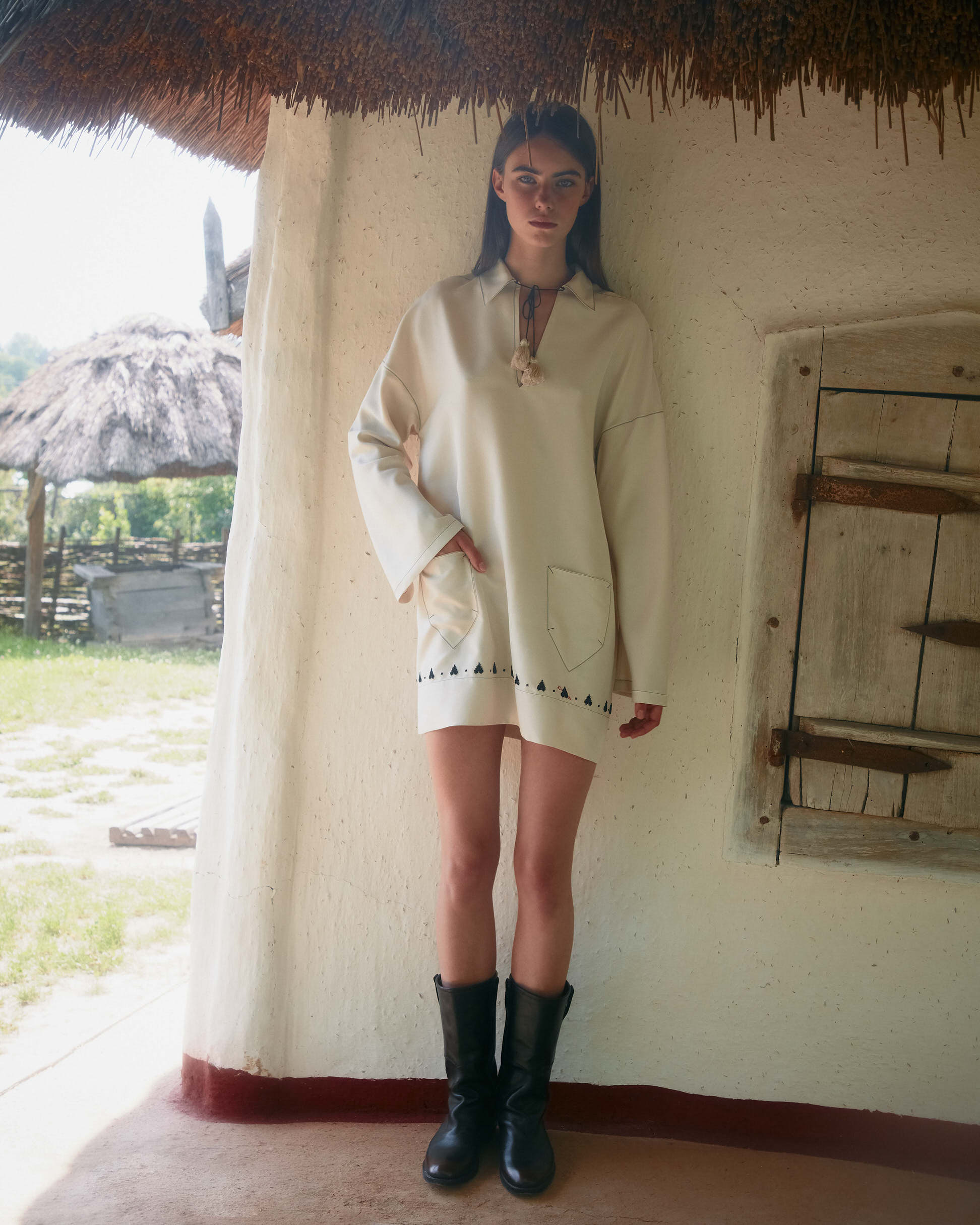 МАЛЕНЬКА СУКНЯ З ЧЕСУЧІ, ПРЯМОГО СИЛУЕТУ ЗІ СПУЩЕНОЮ ПРОЙМОЮ. ПРИКРАШЕНА ВИШИТИМИ СЕРДЕЧКАМИ. ПРИСВЯЧЕНА ДЖЕЙН БІРКІН ТА ЇЇ БЕЗДОГАННОМУ СМАКУ.
