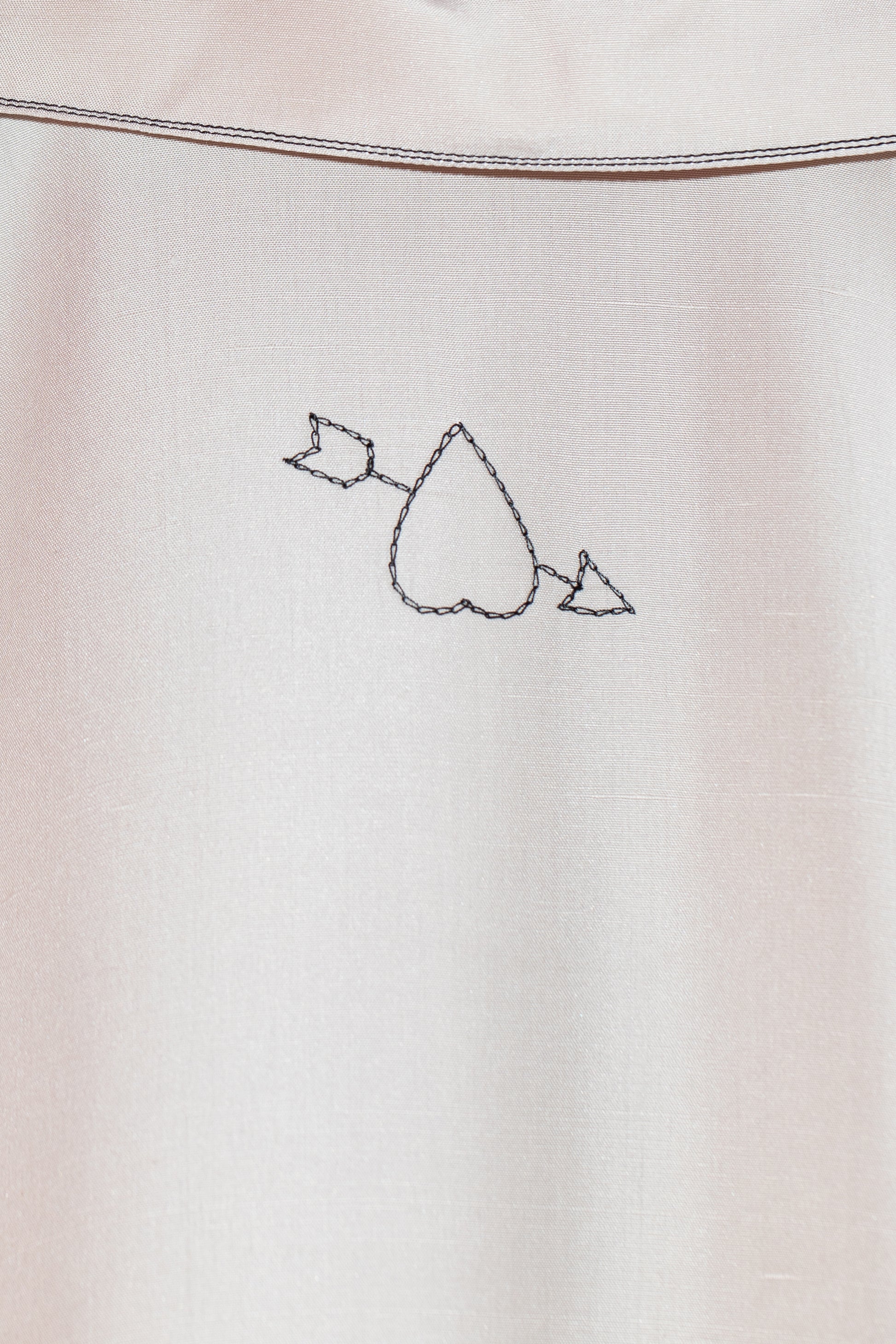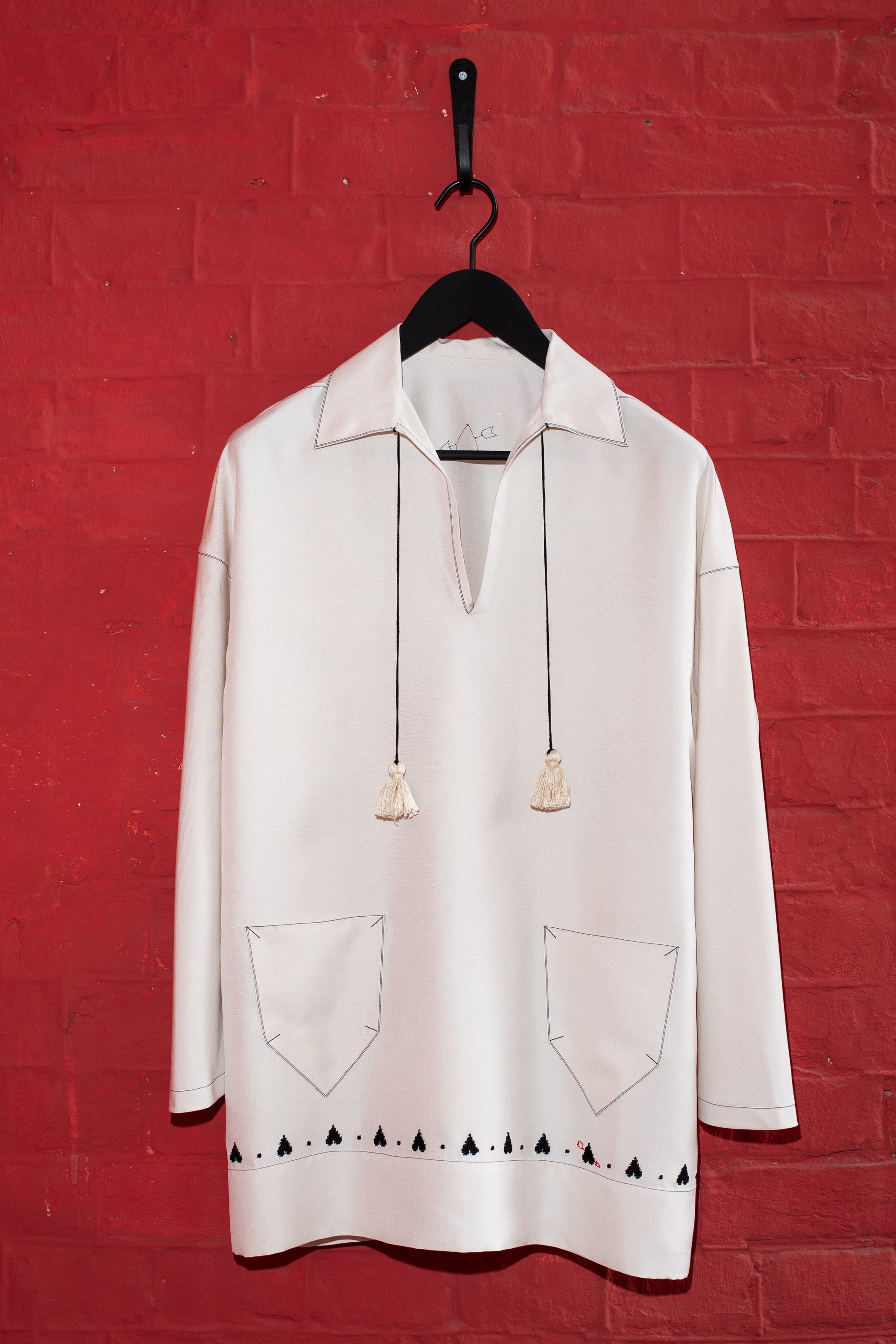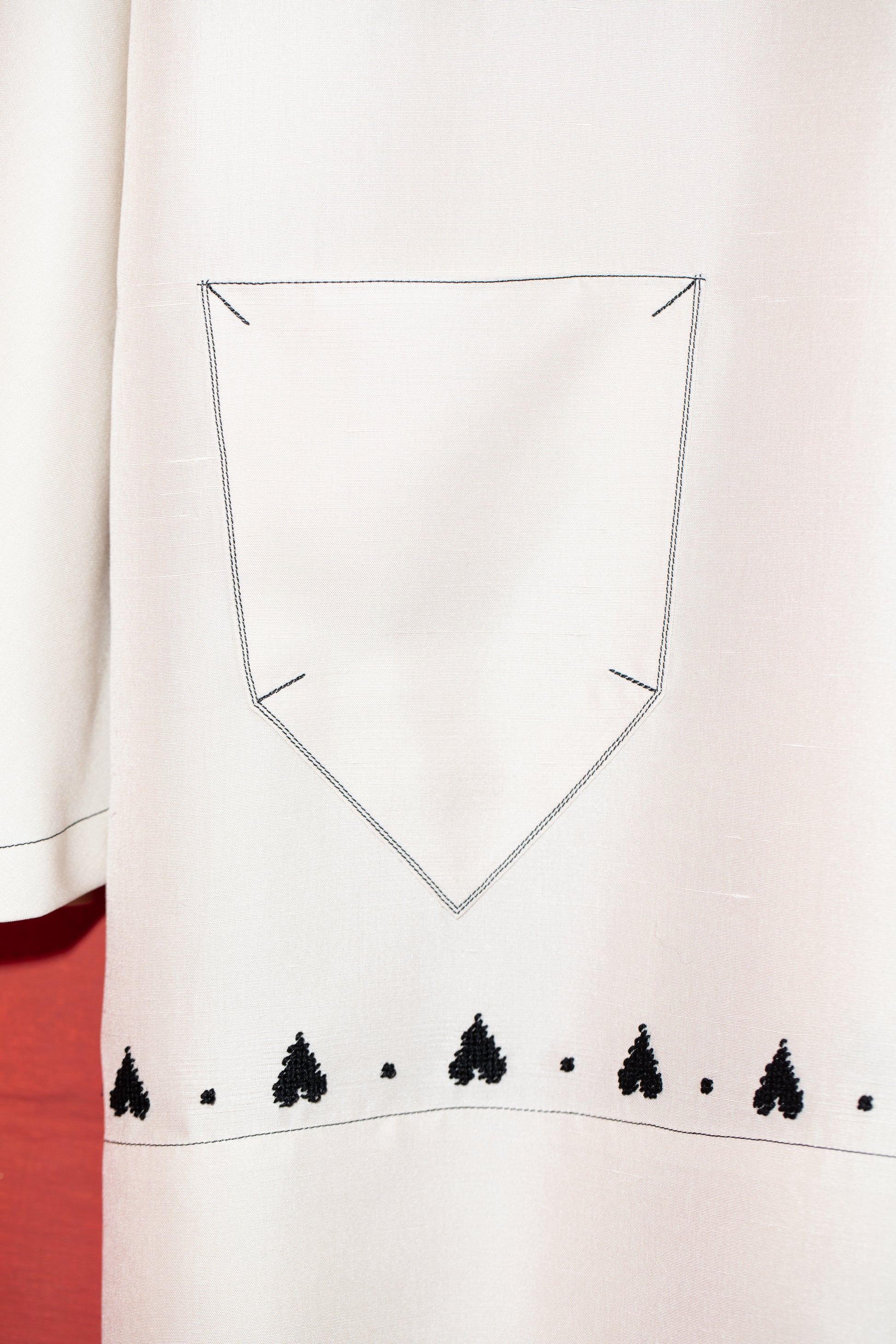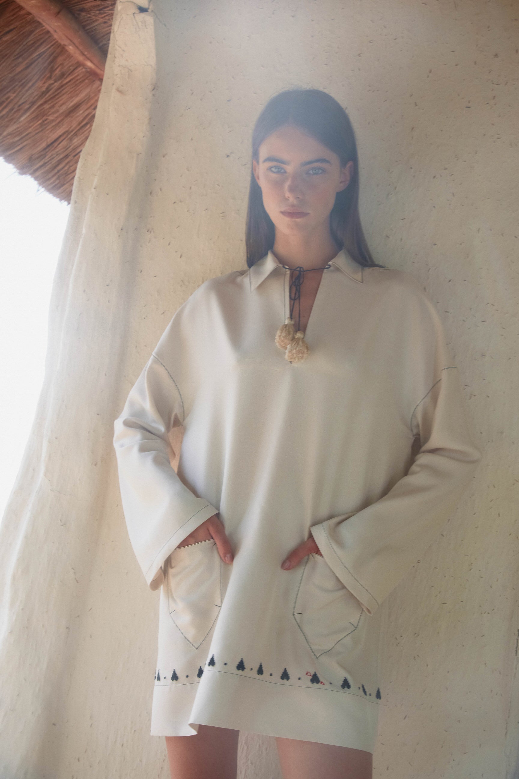 МАЛЕНЬКА СУКНЯ З ЧЕСУЧІ, ПРЯМОГО СИЛУЕТУ ЗІ СПУЩЕНОЮ ПРОЙМОЮ. ПРИКРАШЕНА ВИШИТИМИ СЕРДЕЧКАМИ. ПРИСВЯЧЕНА ДЖЕЙН БІРКІН ТА ЇЇ БЕЗДОГАННОМУ СМАКУ.