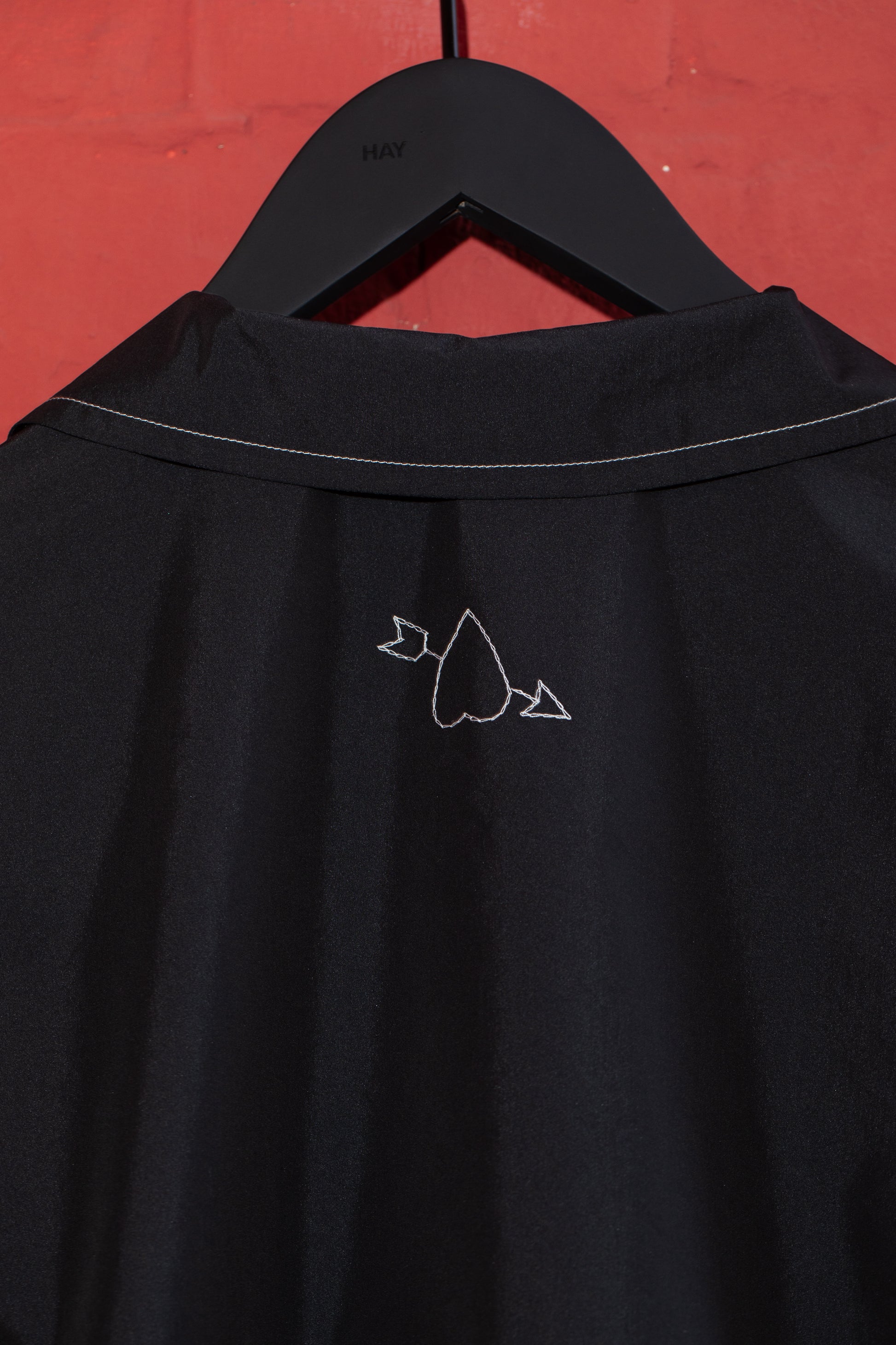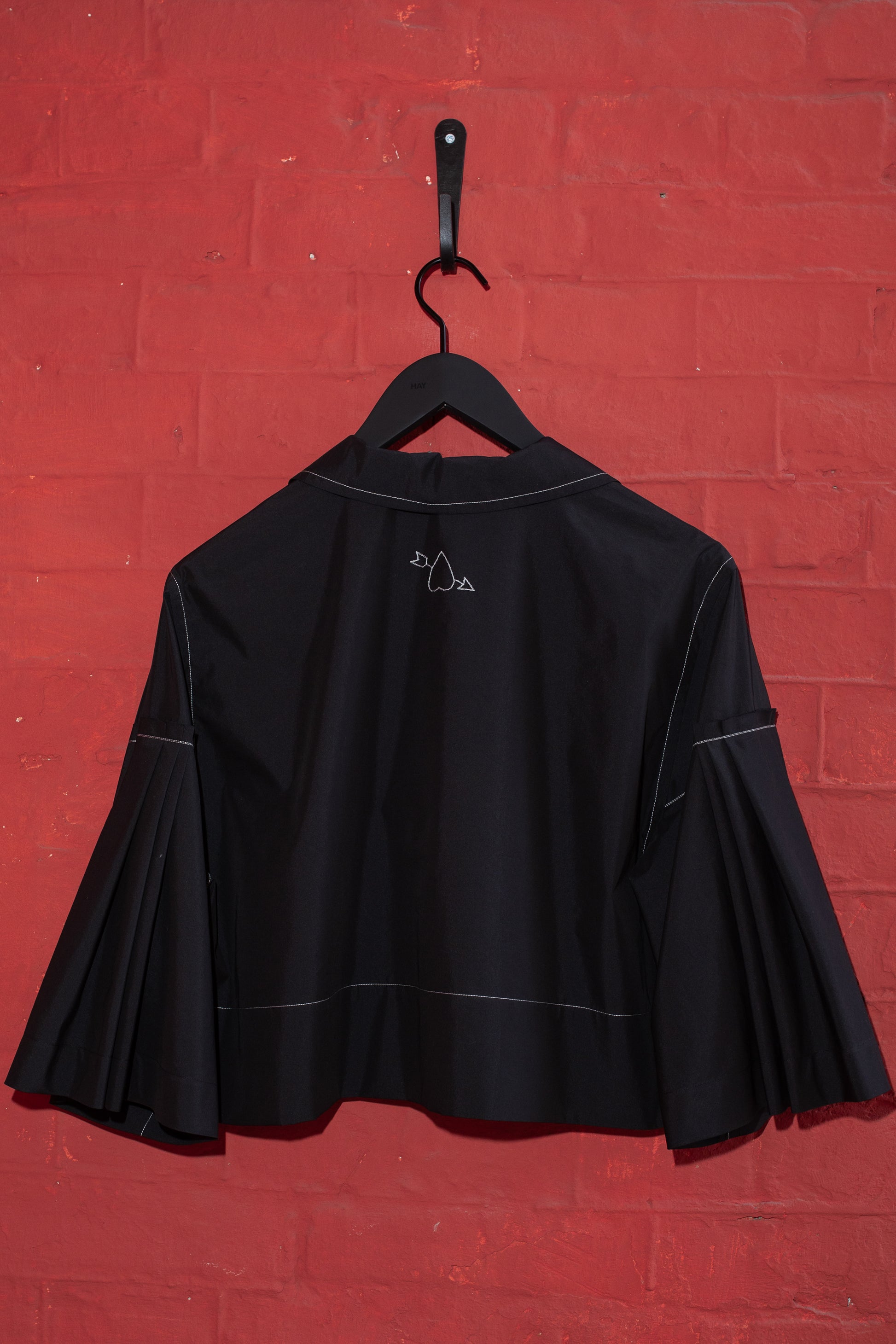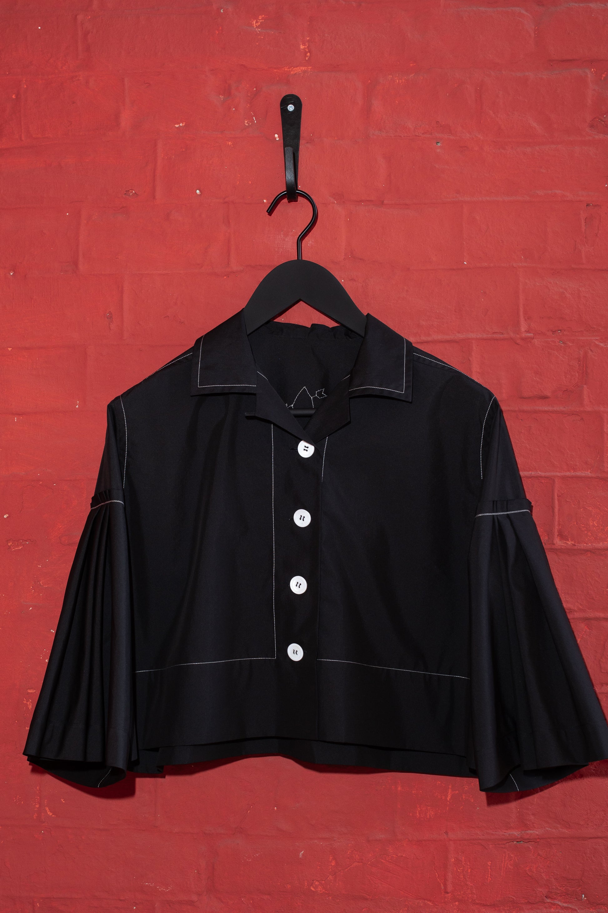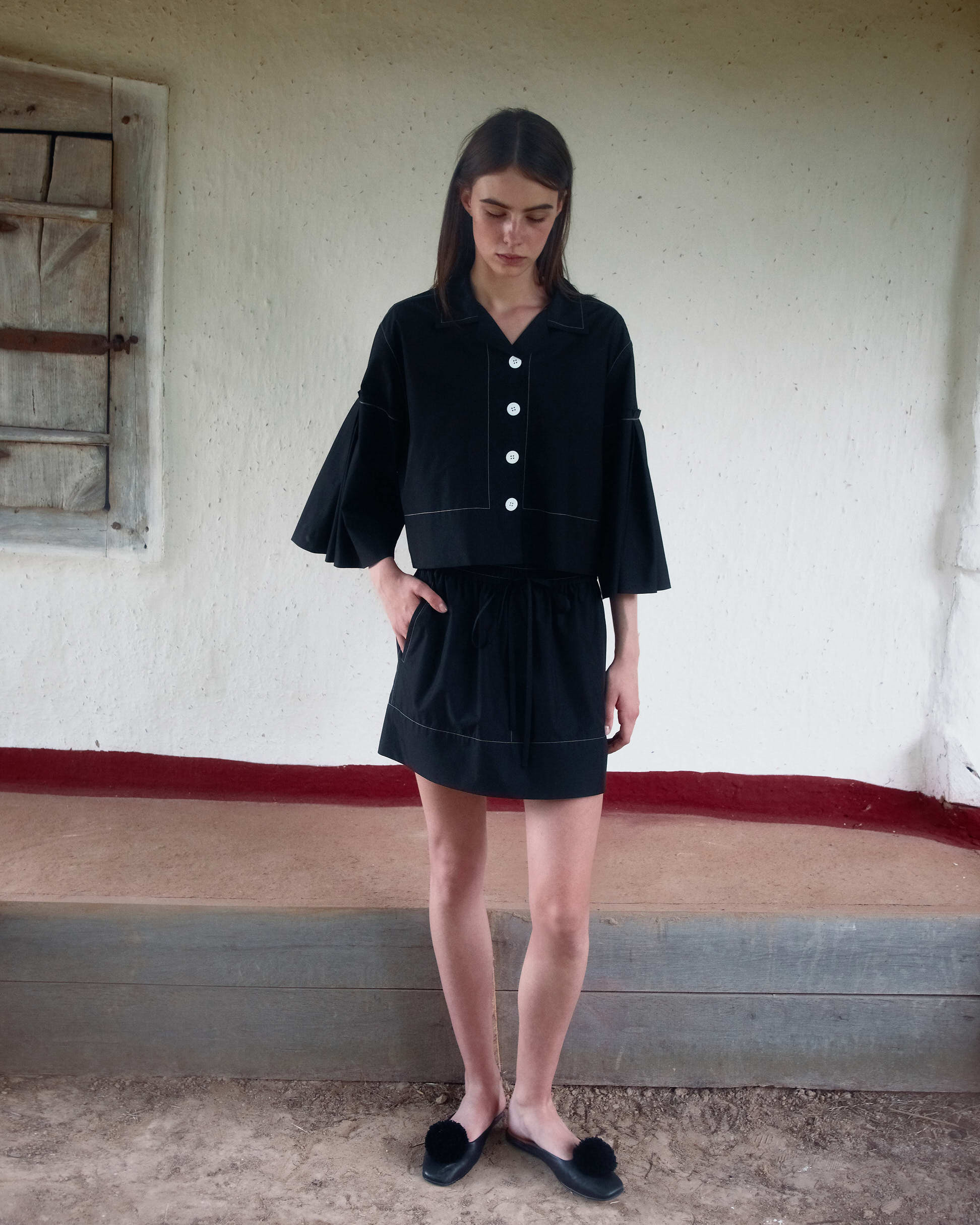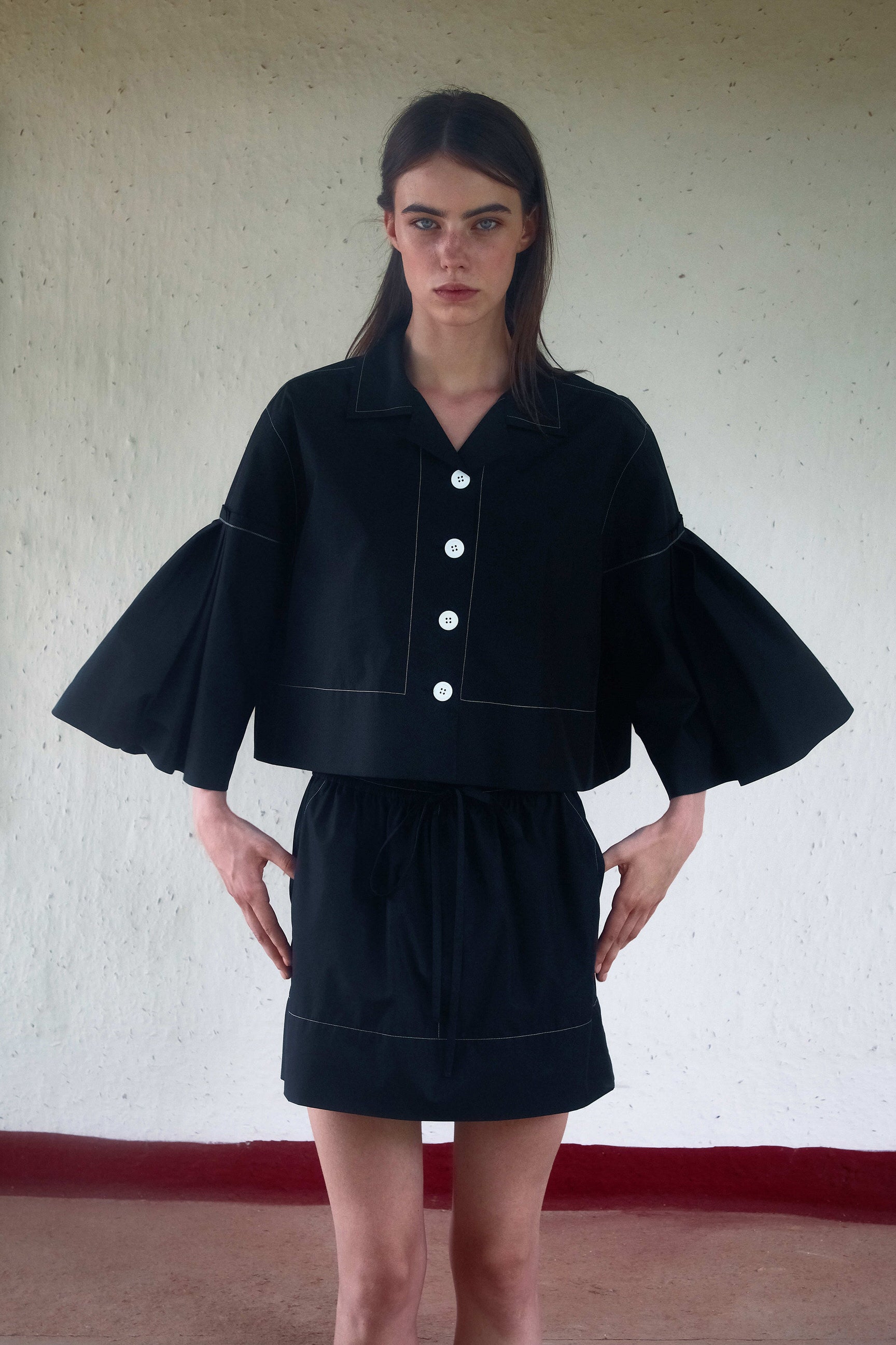 ВКОРОЧЕНА СОРОЧКА ОВЕРСАЙЗ З РУКАВОМ КЛЬОШ З ОБ'ЄМНИМИ СКЛАДАМИ ТА БІЛОЮ КОНТРАСТНОЮ СТРОЧКОЮ.