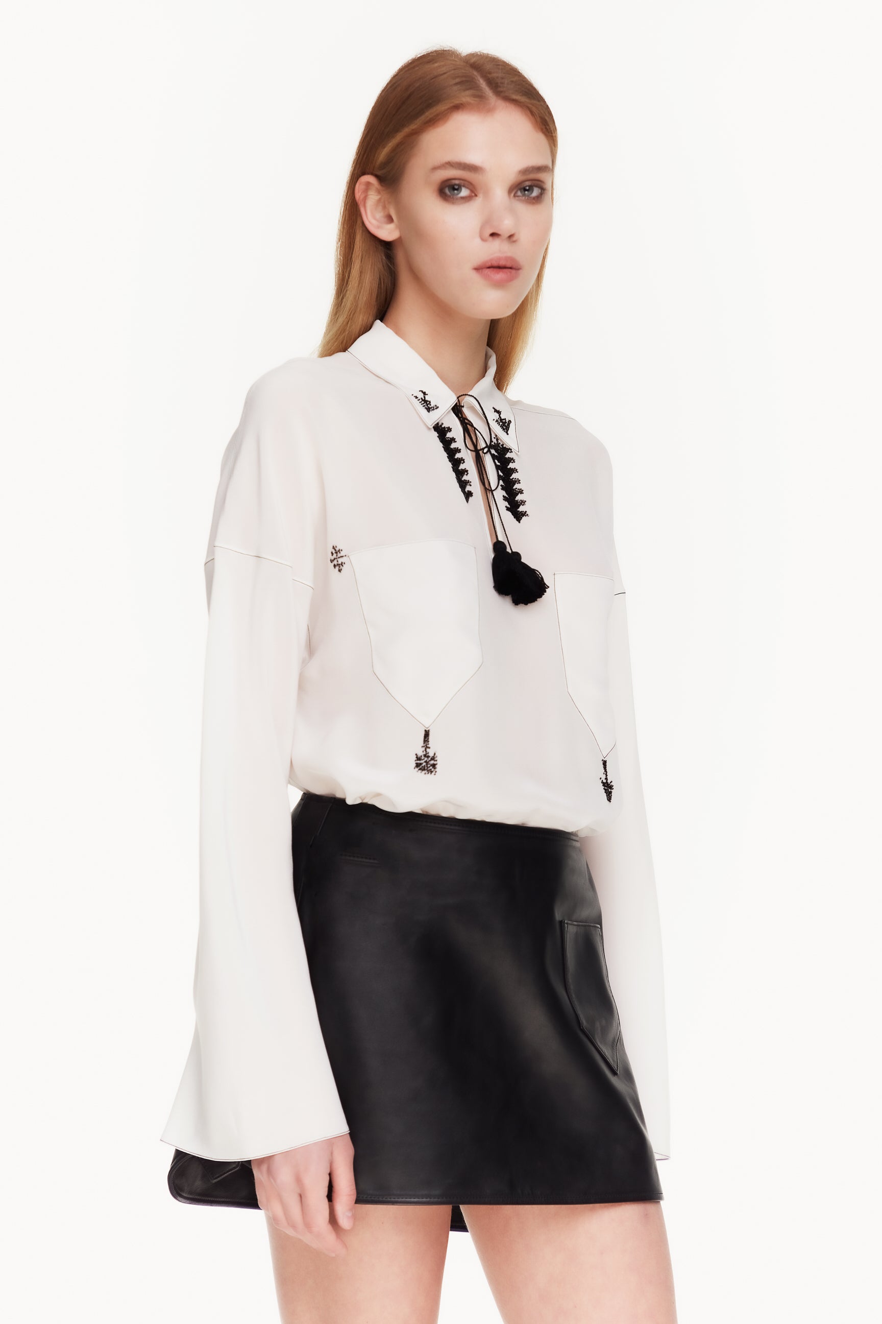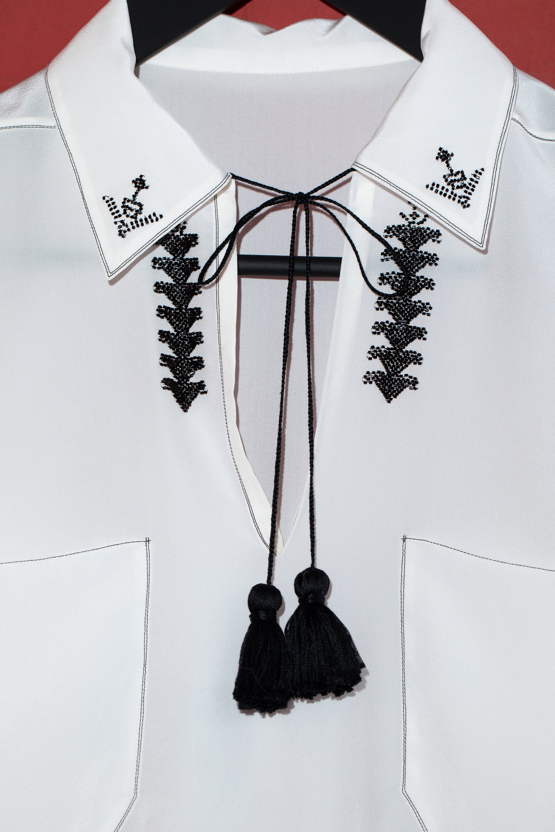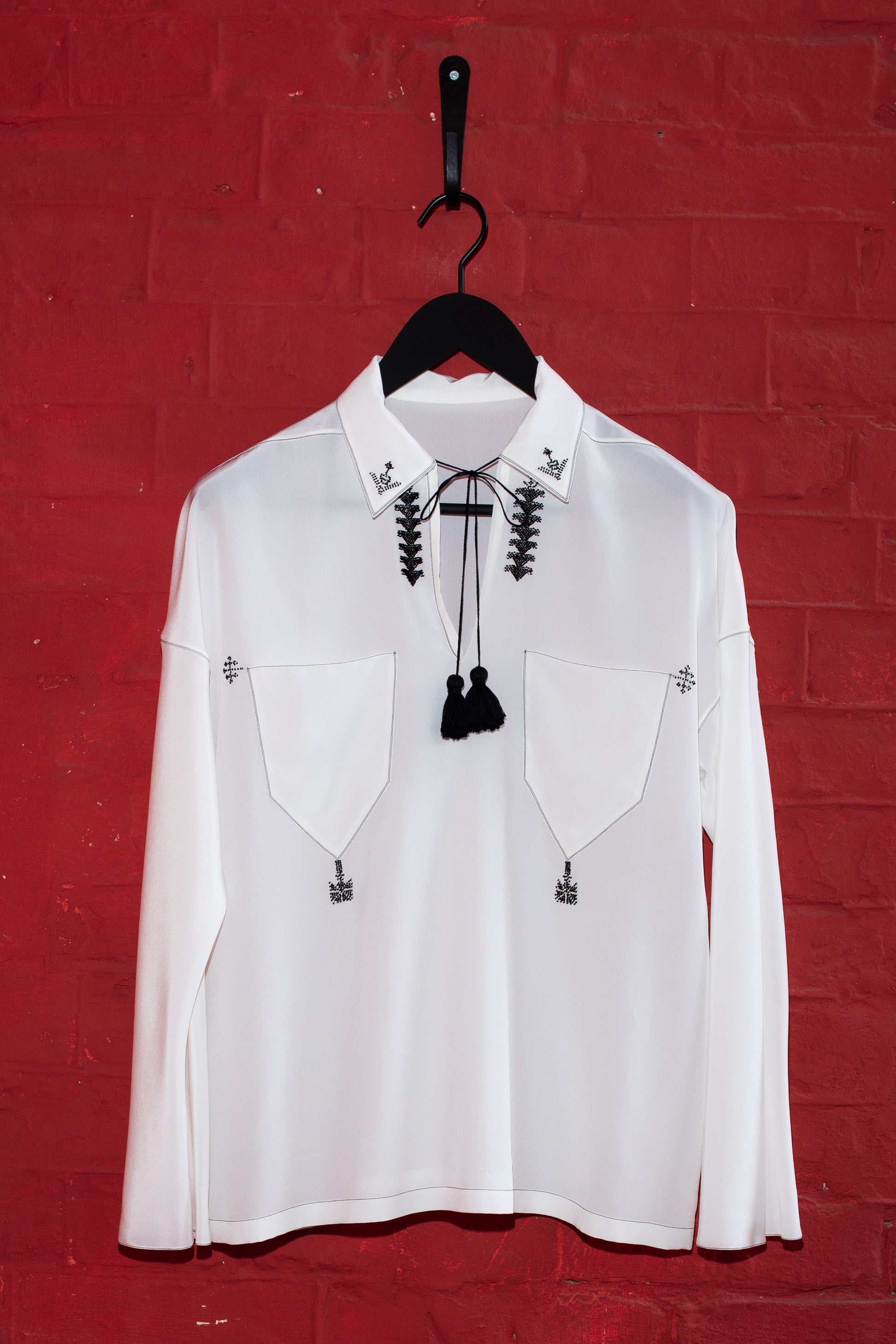 БІЛА ШОВКОВА СОРОЧКА З ДОВГИМ РУКАВОМ І ЗІ СПУЩЕНИМ ПЛЕЧЕМ. ВИШИТА ЧОРНИМ БІСЕРОМ. НАТХНЕННА ЕЛЕМЕНТАМИ ВИШИТОГО РУШНИКА (БОЖНИКА) З ХАРКІВЩИНИ.