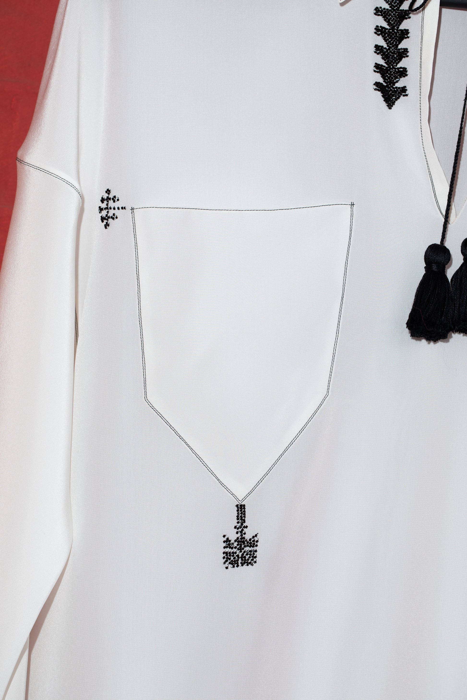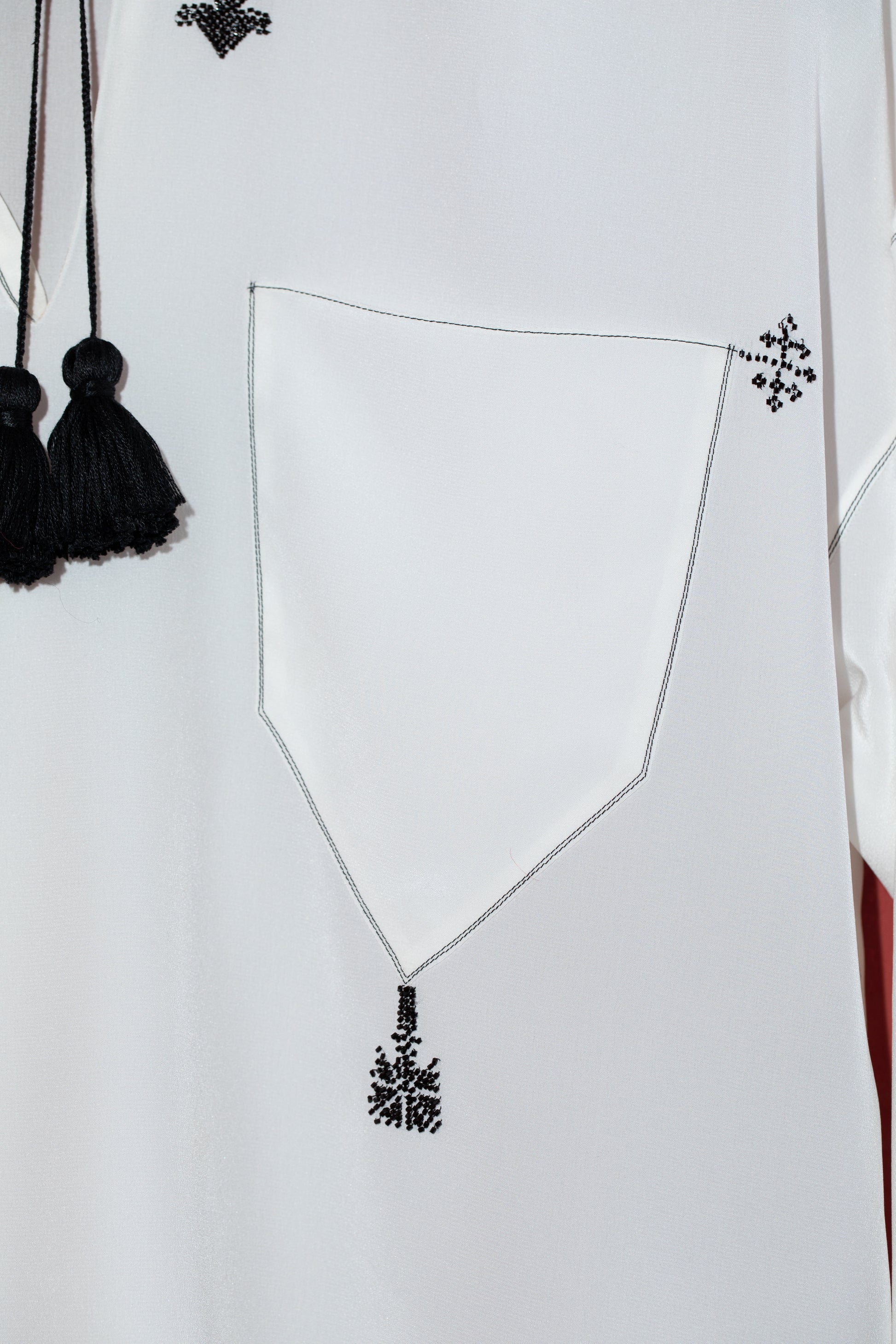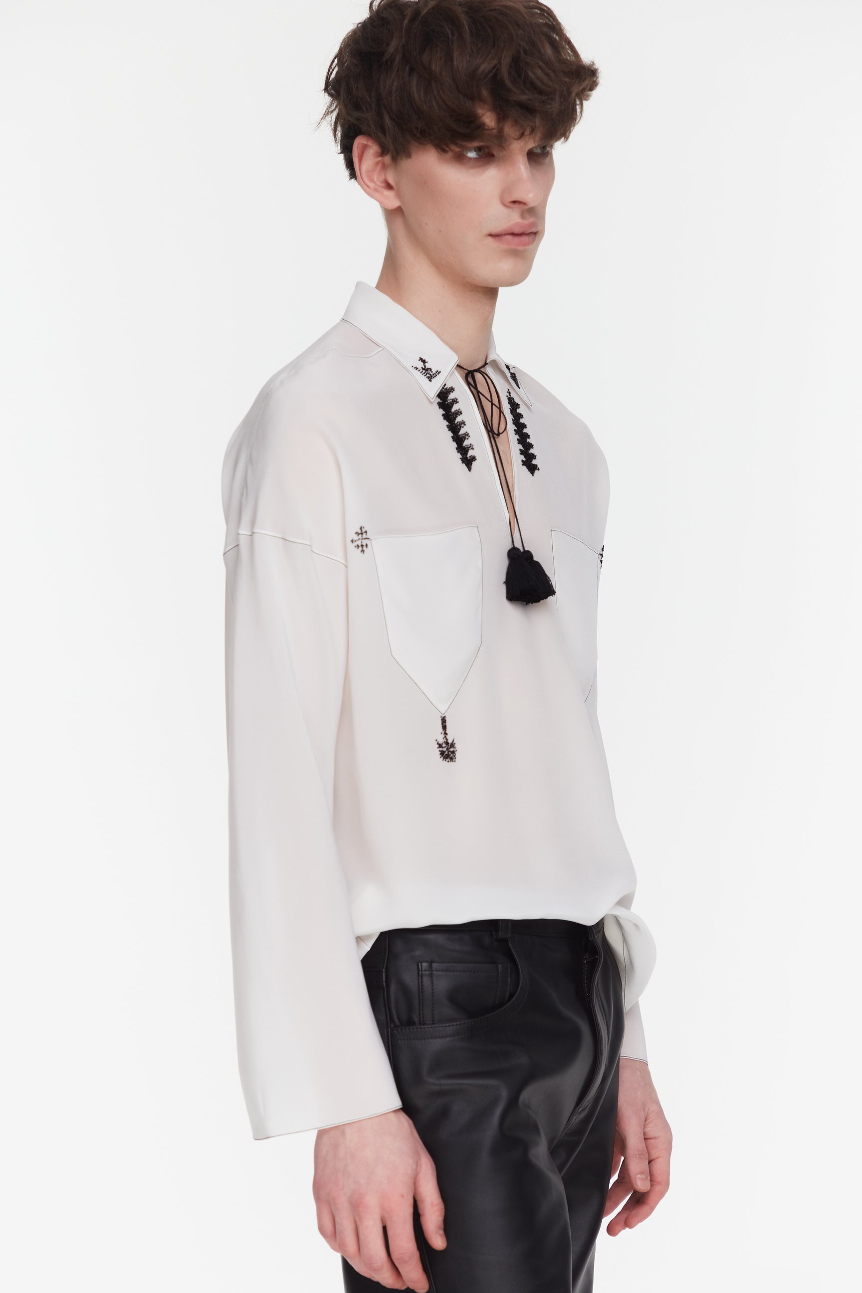БІЛА ШОВКОВА СОРОЧКА З ДОВГИМ РУКАВОМ І ЗІ СПУЩЕНИМ ПЛЕЧЕМ. ВРУЧНУ ВИШИТА БІСЕРОМ. НАТХНЕННА ЕЛЕМЕНТАМИ ВИШИТОГО РУШНИКА (БОЖНИКА) З ХАРКІВЩИНИ.