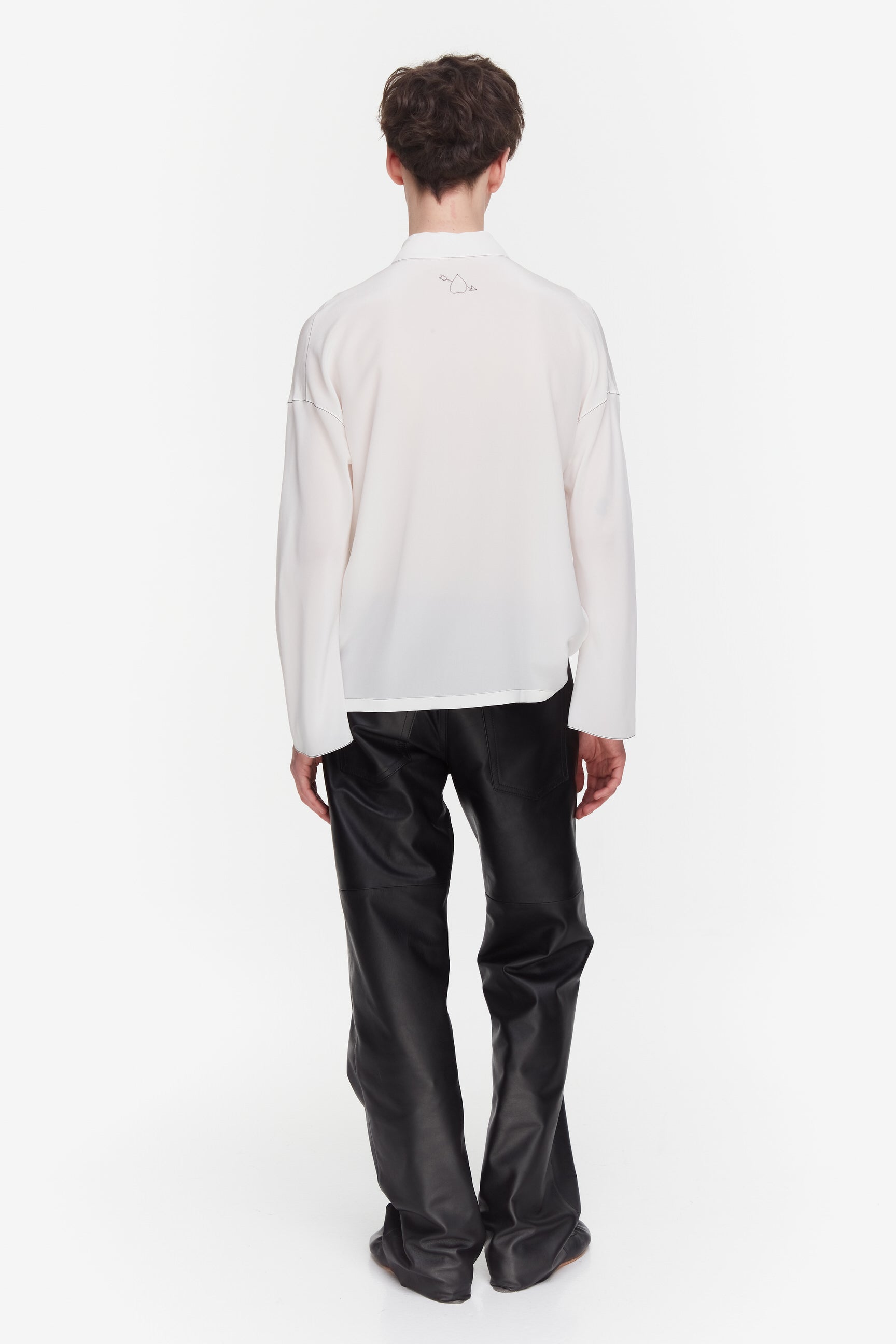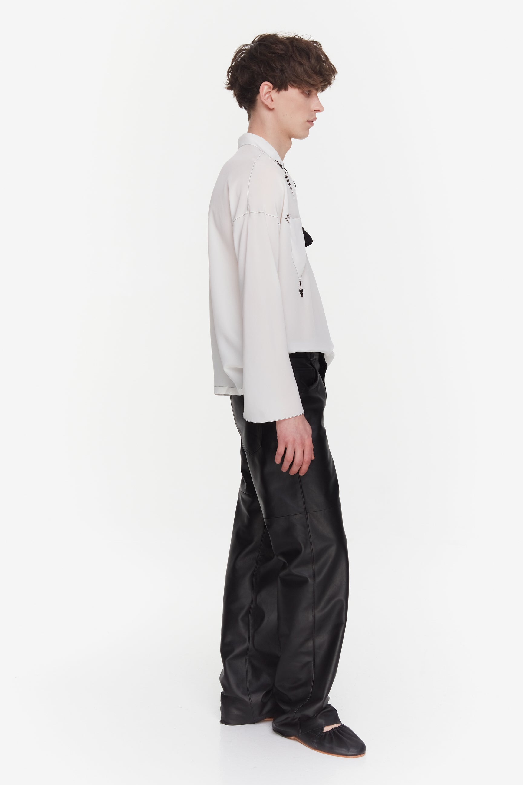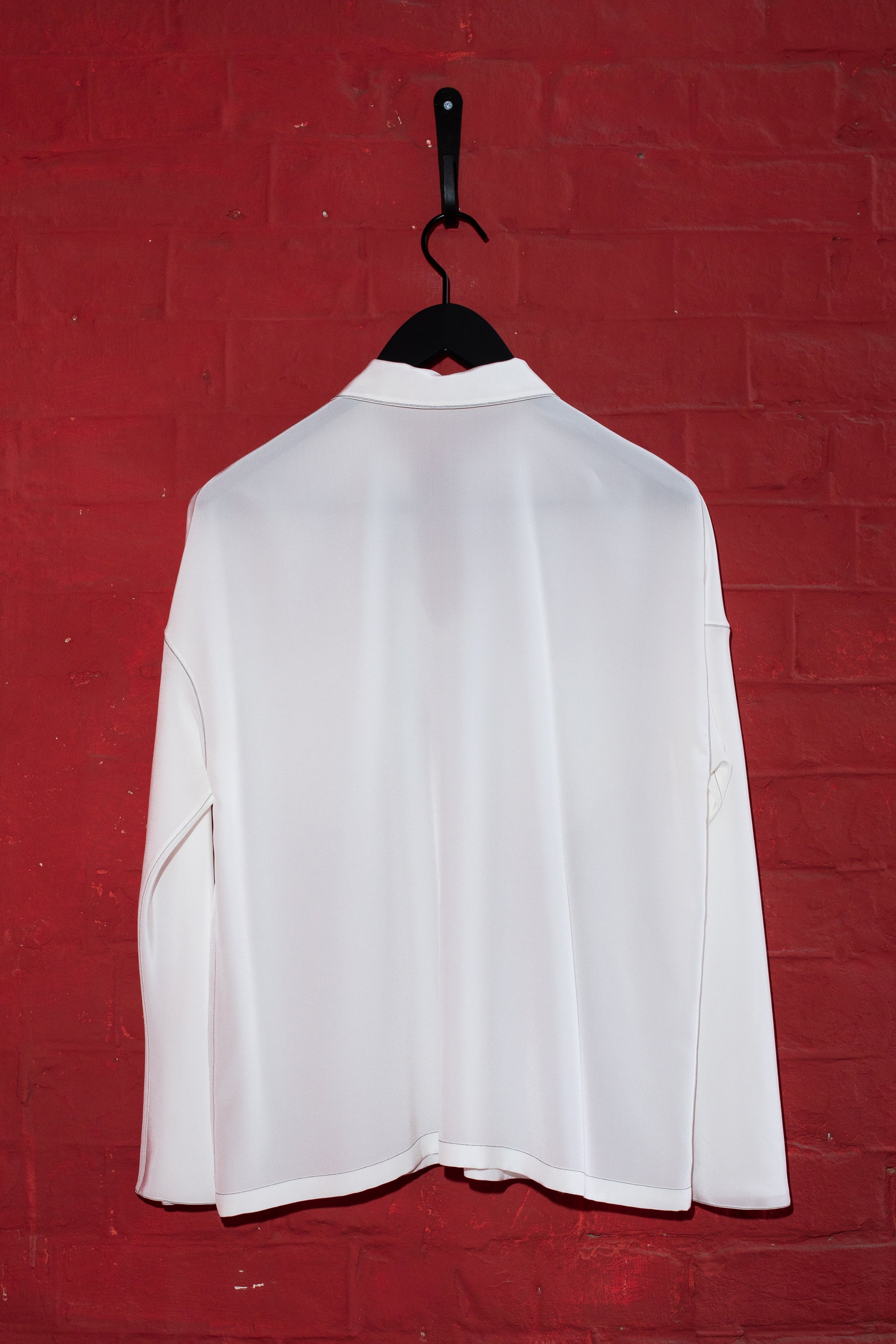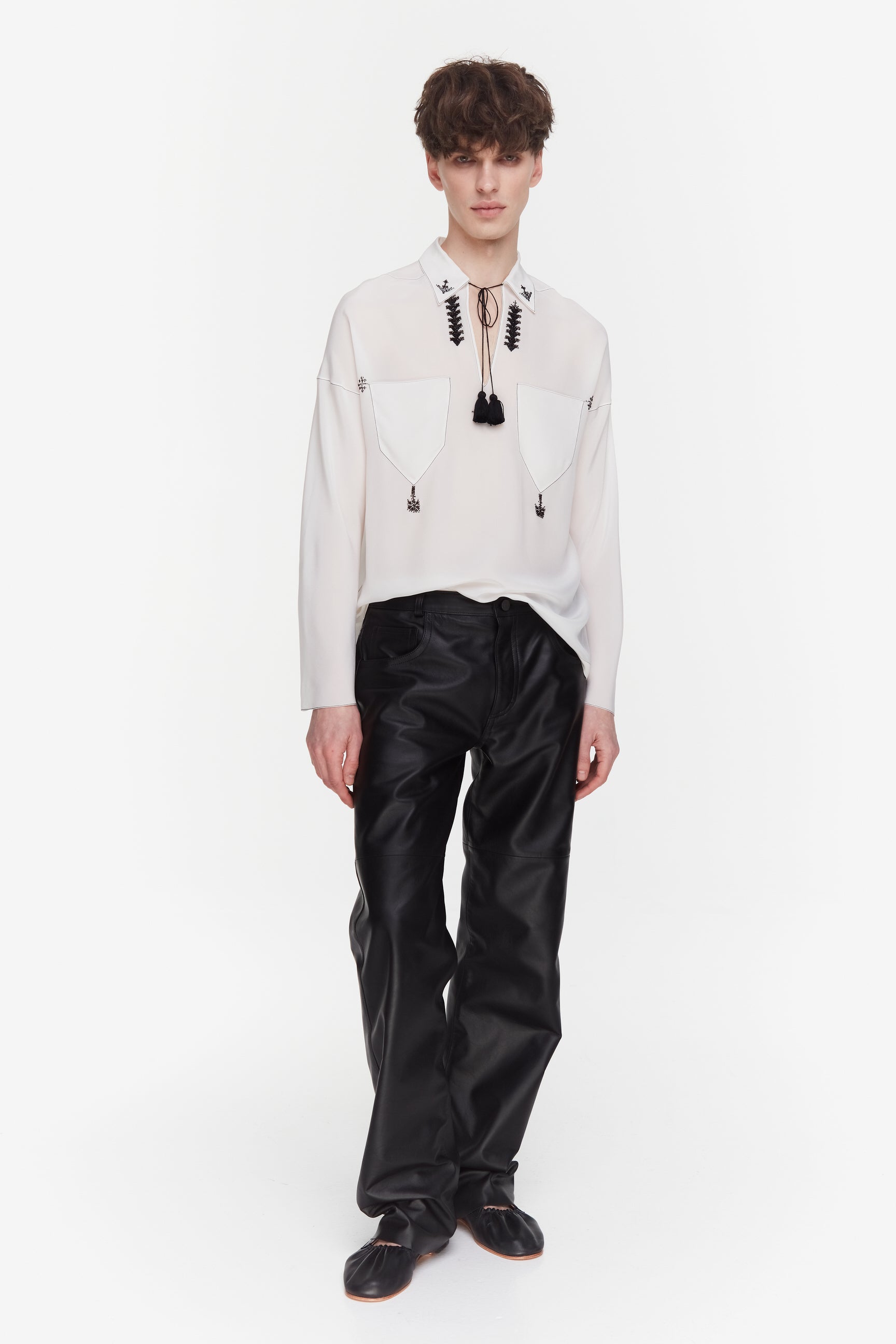 БІЛА ШОВКОВА СОРОЧКА З ДОВГИМ РУКАВОМ І ЗІ СПУЩЕНИМ ПЛЕЧЕМ. ВРУЧНУ ВИШИТА БІСЕРОМ. НАТХНЕННА ЕЛЕМЕНТАМИ ВИШИТОГО РУШНИКА (БОЖНИКА) З ХАРКІВЩИНИ.