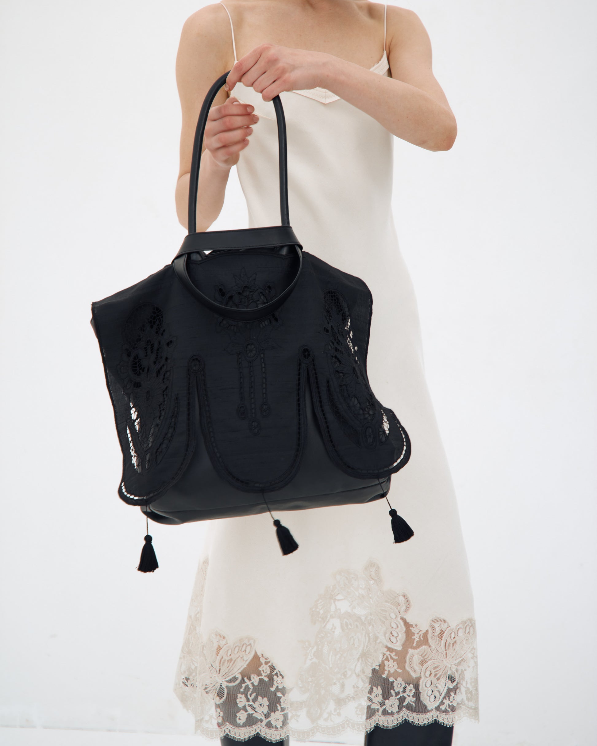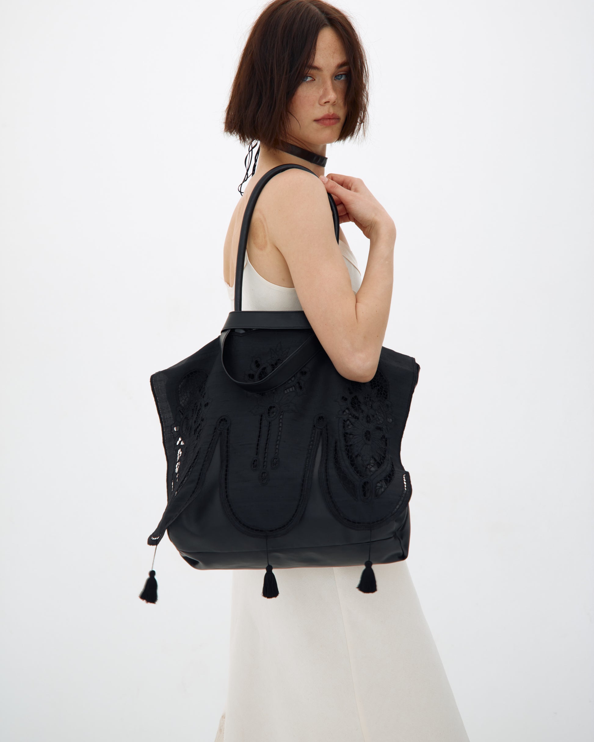 ШКІРЯНА СУМКА З ДЕКОРАТИВНОЮ СЕРВЕТКОЮ, НАТХНЕННОЮ ПРАВОСЛАВНОЮ ЦЕРКОВНОЮ «ХОРУГВОЮ», ЯКУ ВИКОРИСТОВУЮТЬ ПІД ЧАС ЛІТУРГІЙ. СУМКА НА ПІДКЛАДЦІ, МАЄ ШКІРЯНИЙ ВКЛАДИШ ІЗ ПОТАЄМНОЮ КИШЕНЕЮ.«ХОРУГВА» З ВИШИВКОЮ ВИКОНАНА ВРУЧНУ В ТЕХНІЦІ РІШЕЛЬЄ. З’ЄДНАНА З СУМКОЮ ЗСЕРЕДИНИ ЗА ДОПОМОГОЮ БЛИСКАВКИ. ЗА БАЖАННЯМ ЇЇ МОЖНА ВІДСТІБНУТИ.