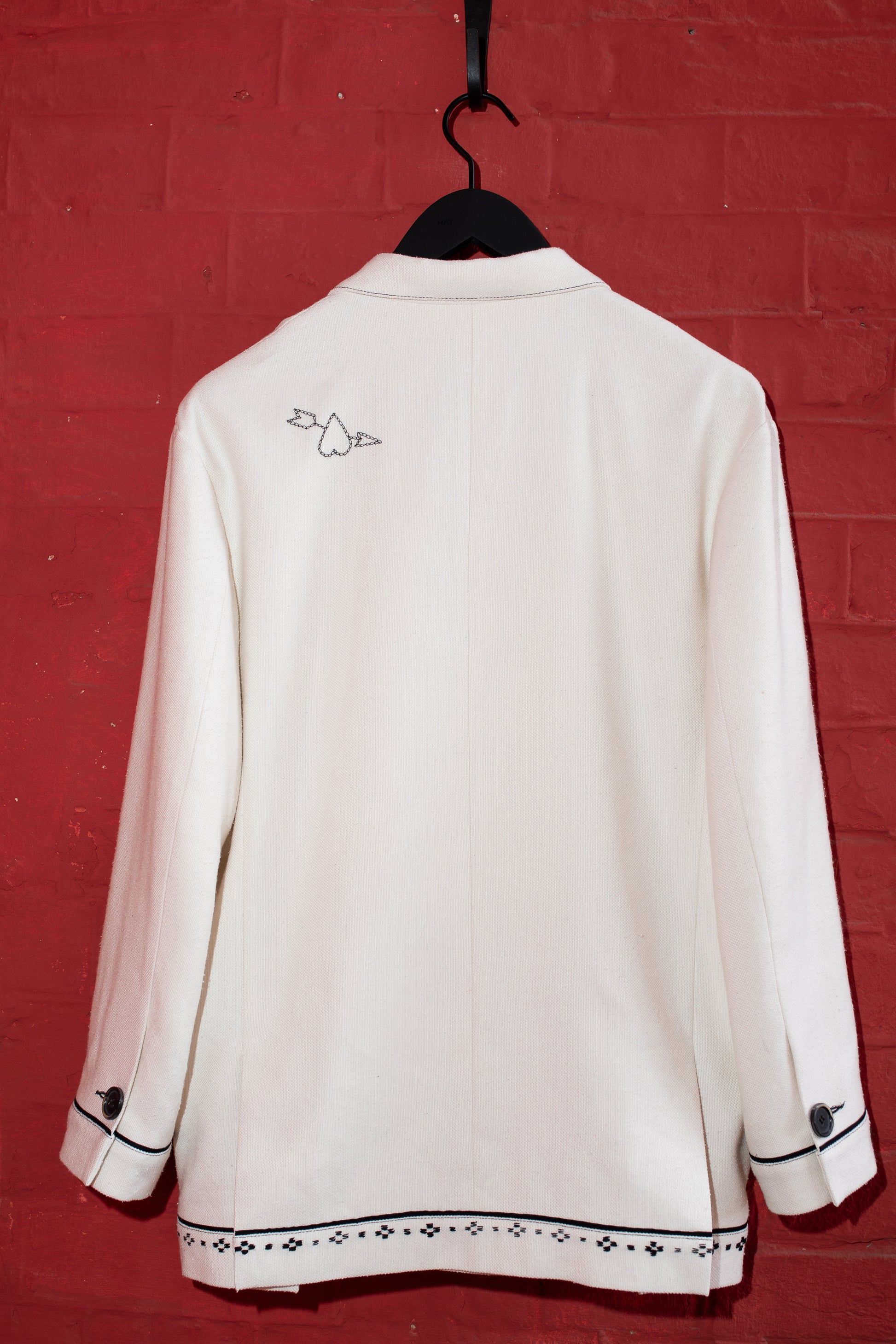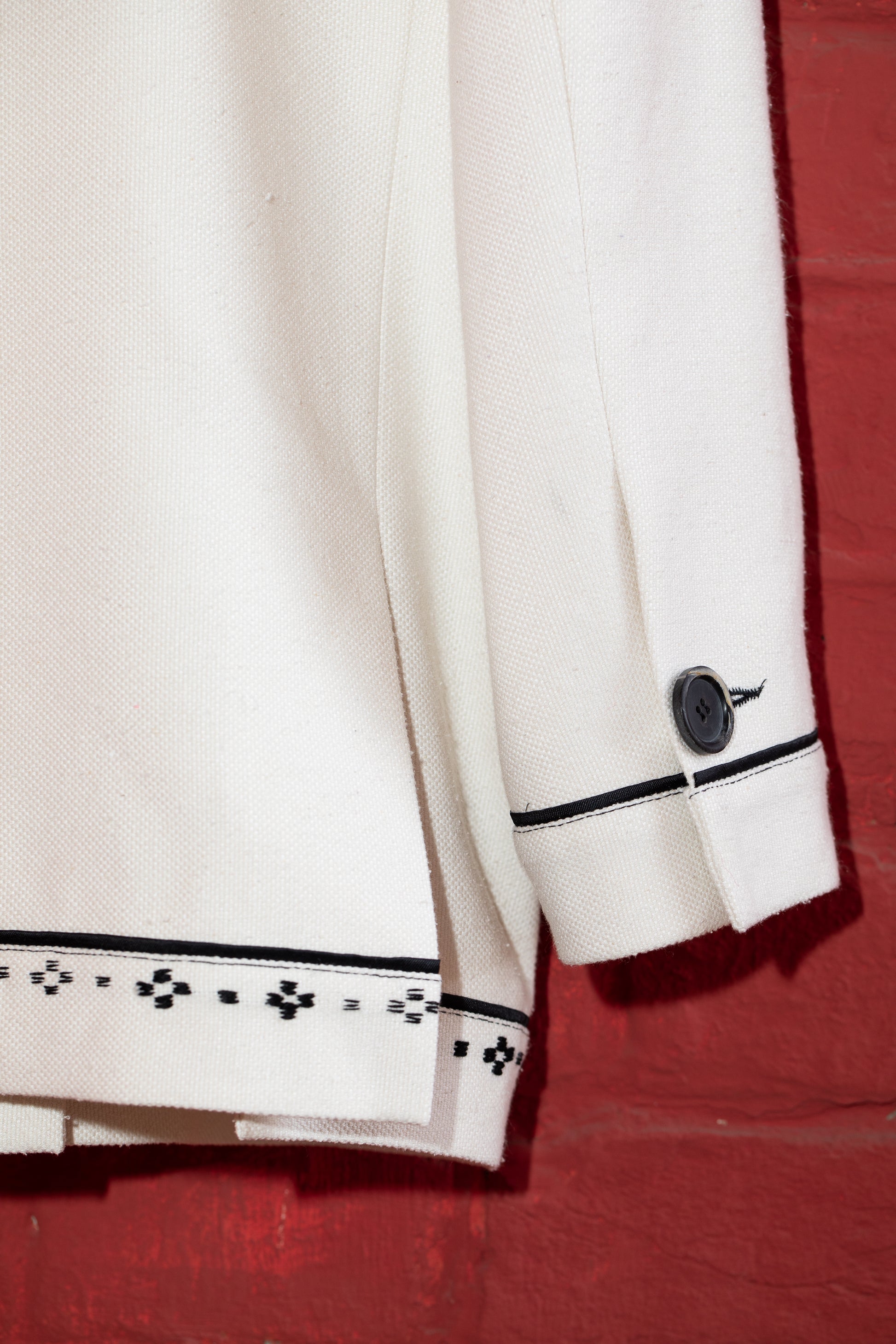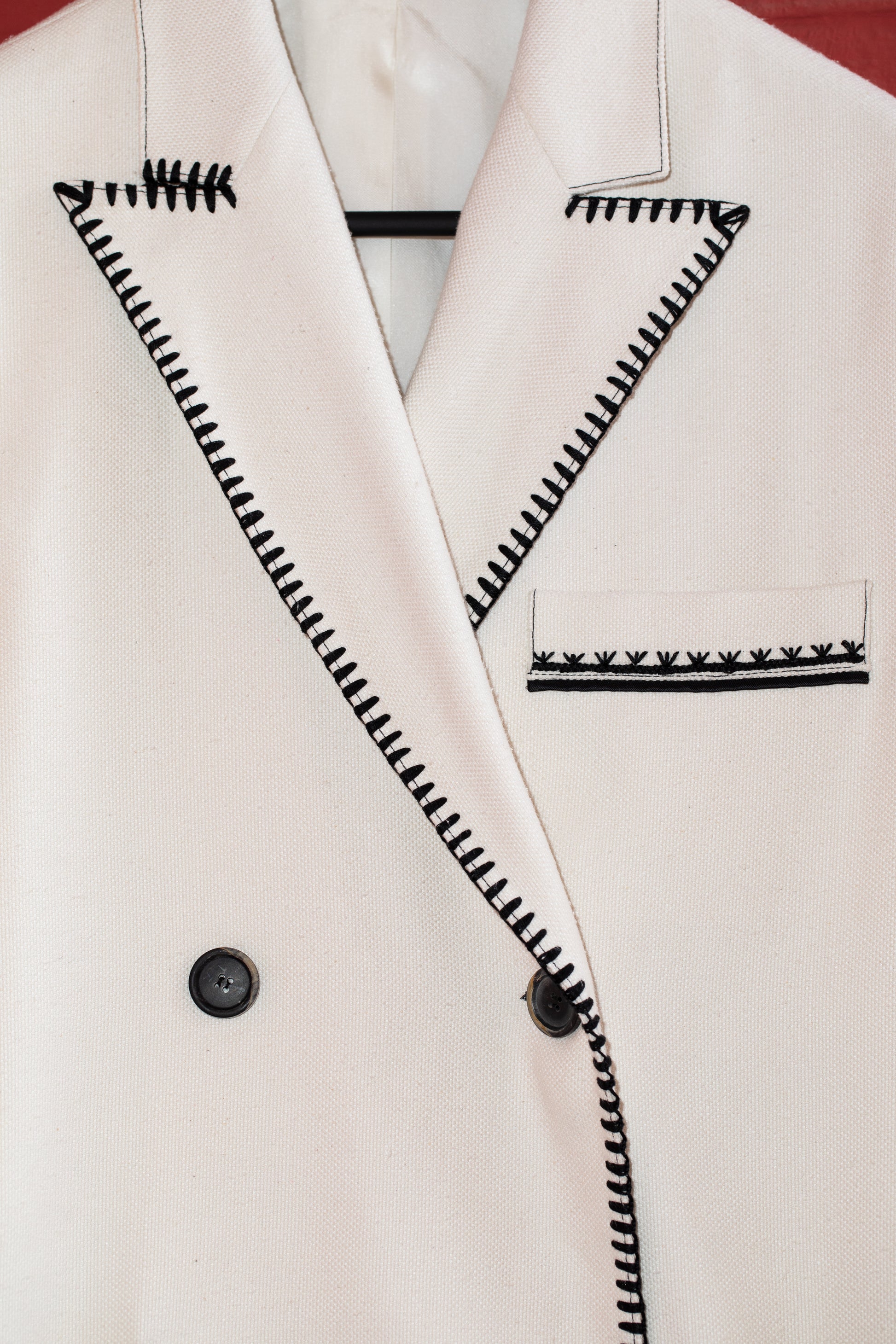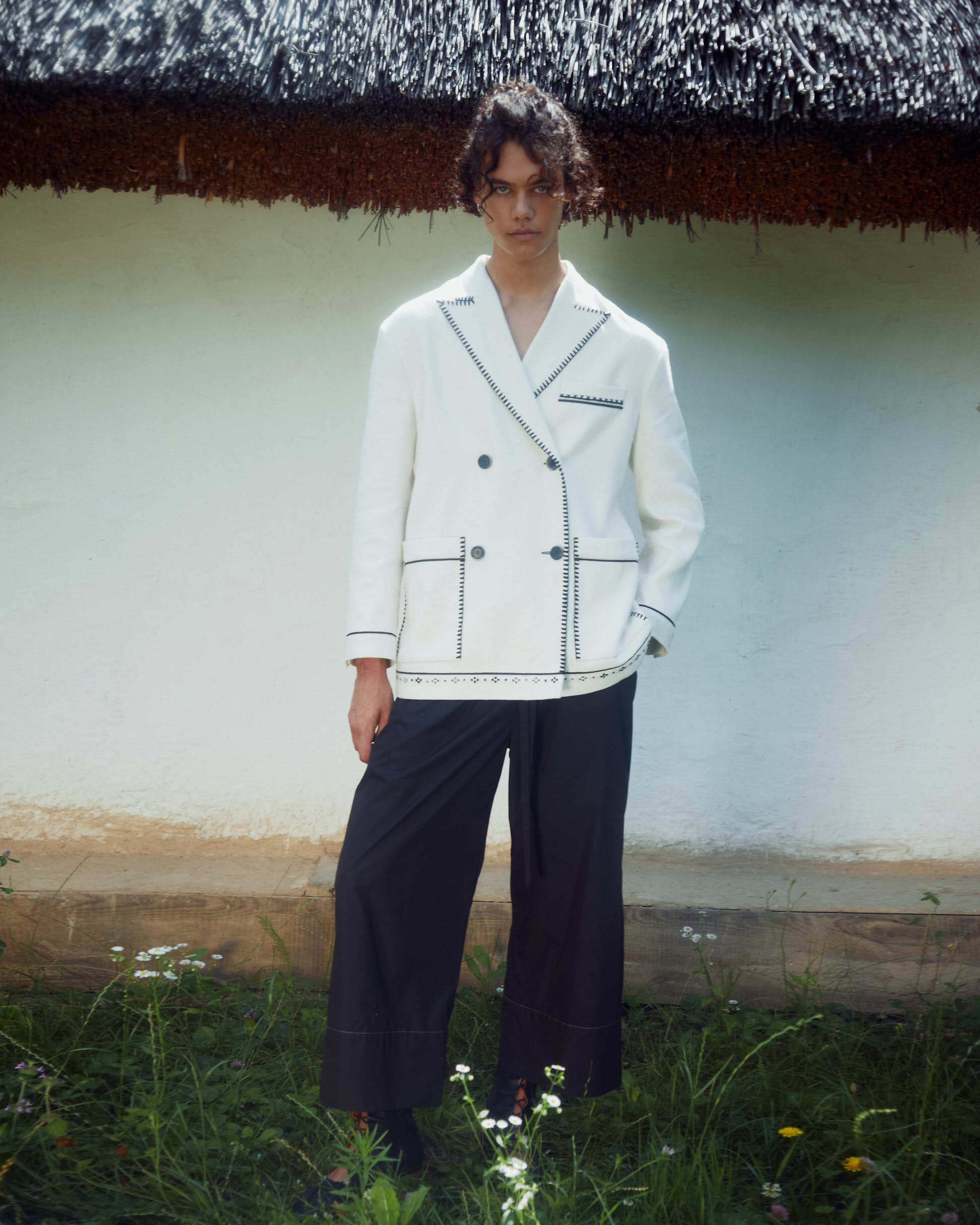 ПІДЖАК «ЛІТНИК» З БУРЕТНОГО ШОВКУ З ЧОРНОЮ ВИШИВКОЮ, В ЯКІЙ МИ СТВОРИЛИ ЕФЕКТ ПОТЕРТОСТІ – ПРИСВЯЧЕНИЙ ВІДПОЧИНКУ В КАРПАТАХ УКРАЇНСЬКОГО БОМОНДУ НА ПОЧАТКУ ХХ СТ.