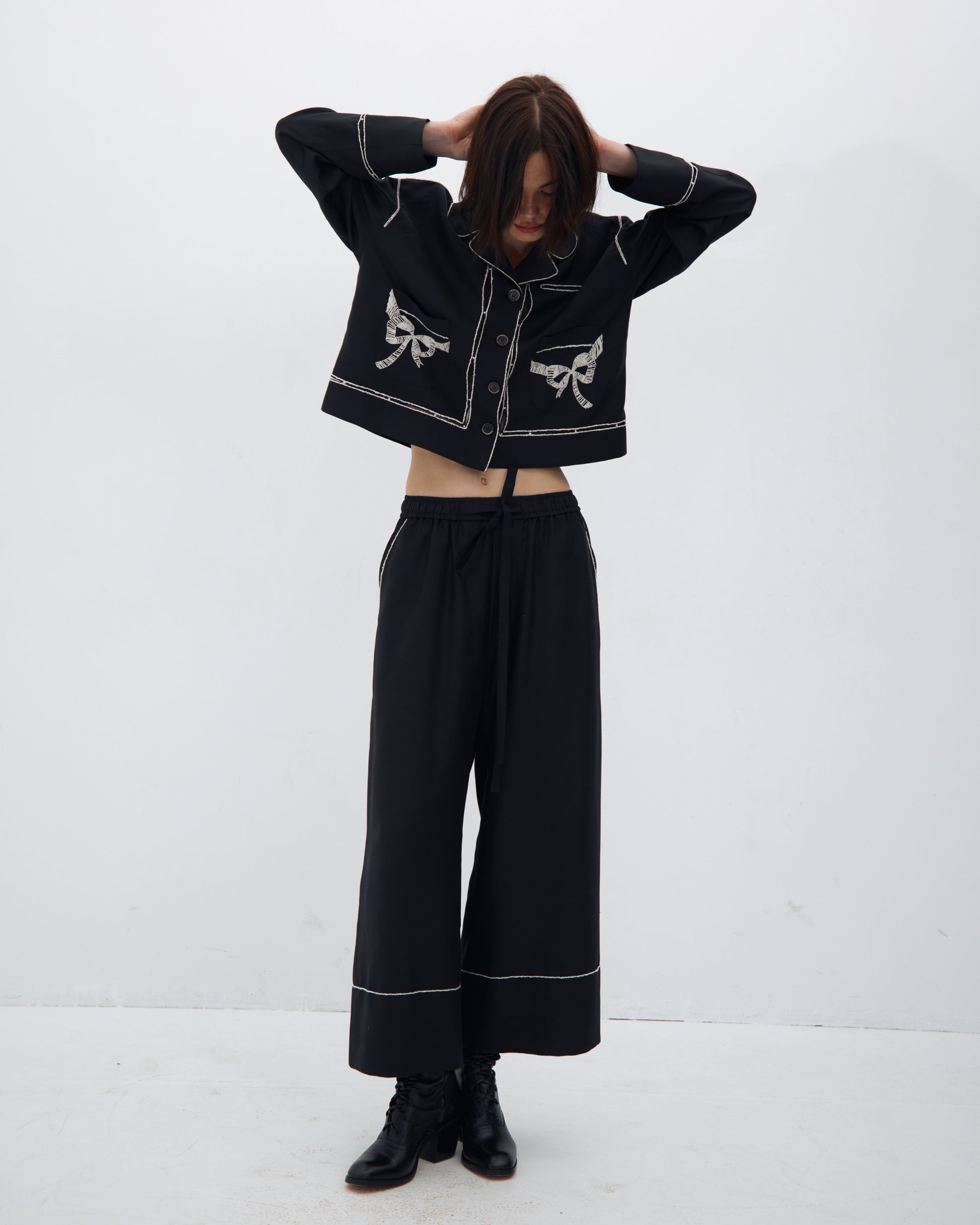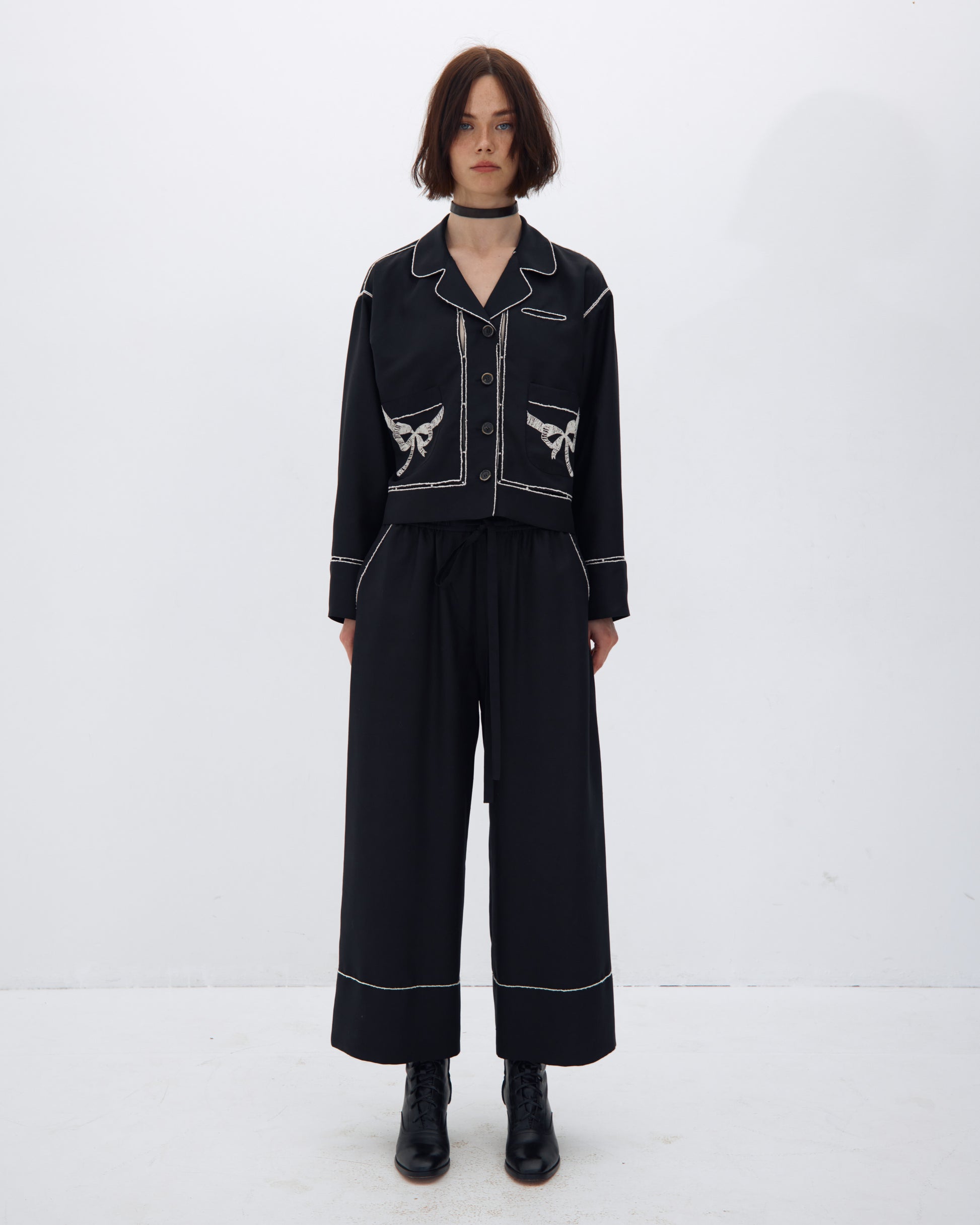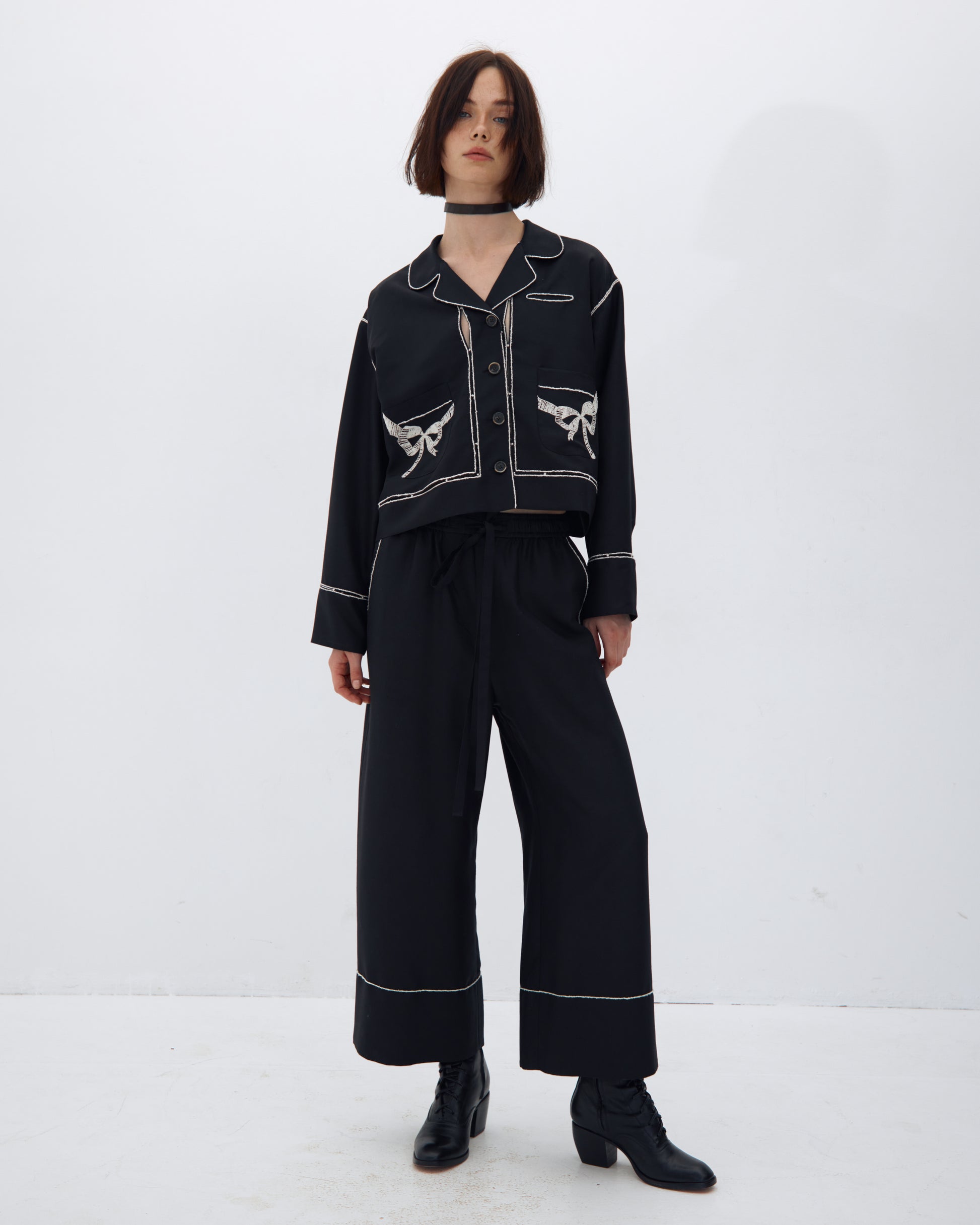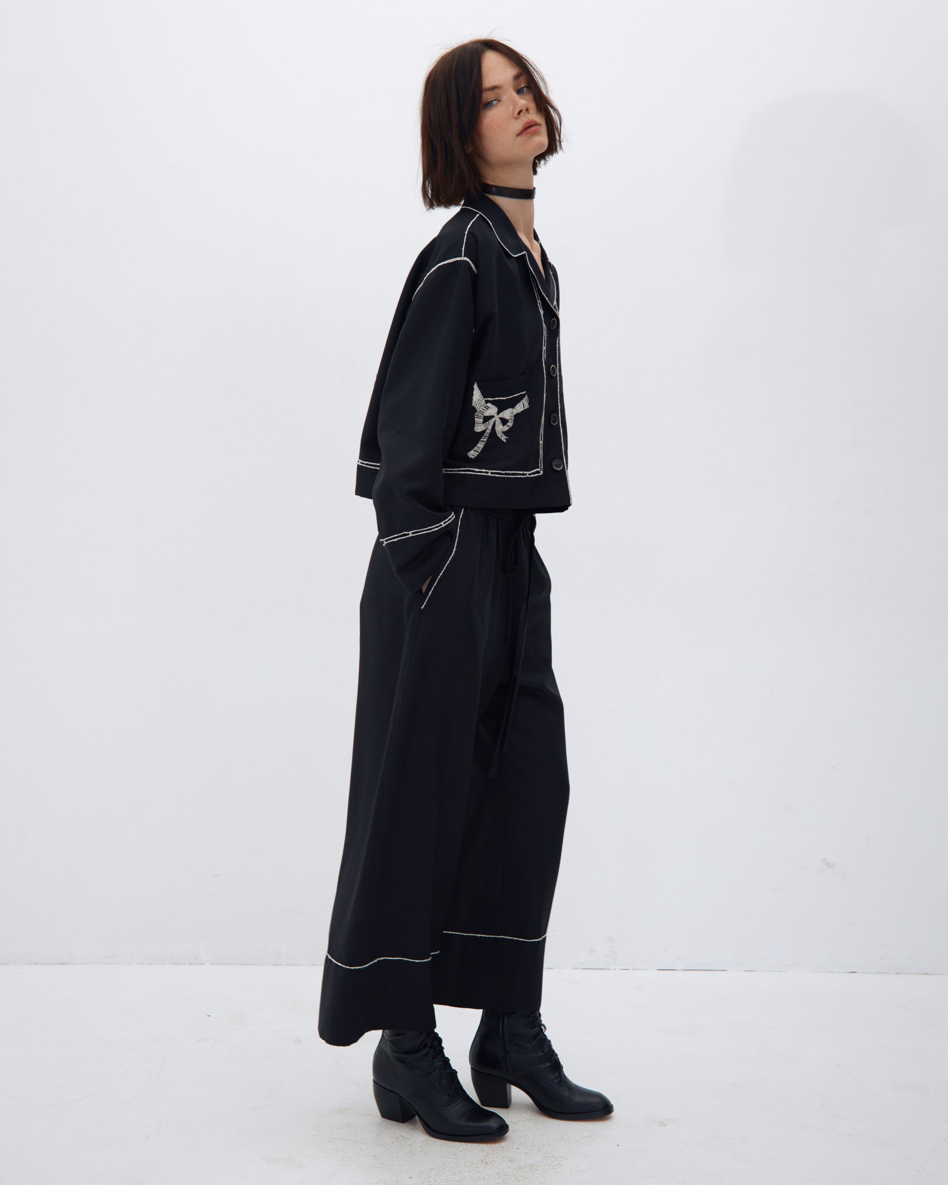 БРЮКИ ВІЛЬНОГО КРОЮ НА РЕЗИНЦІ. ОЗДОБЛЕНІ ВИШИВКОЮ У ВИГЛЯДІ КОНТРАСТНОЇ ДЕКОРАТИВНОЇ ОКАНТОВКИ.