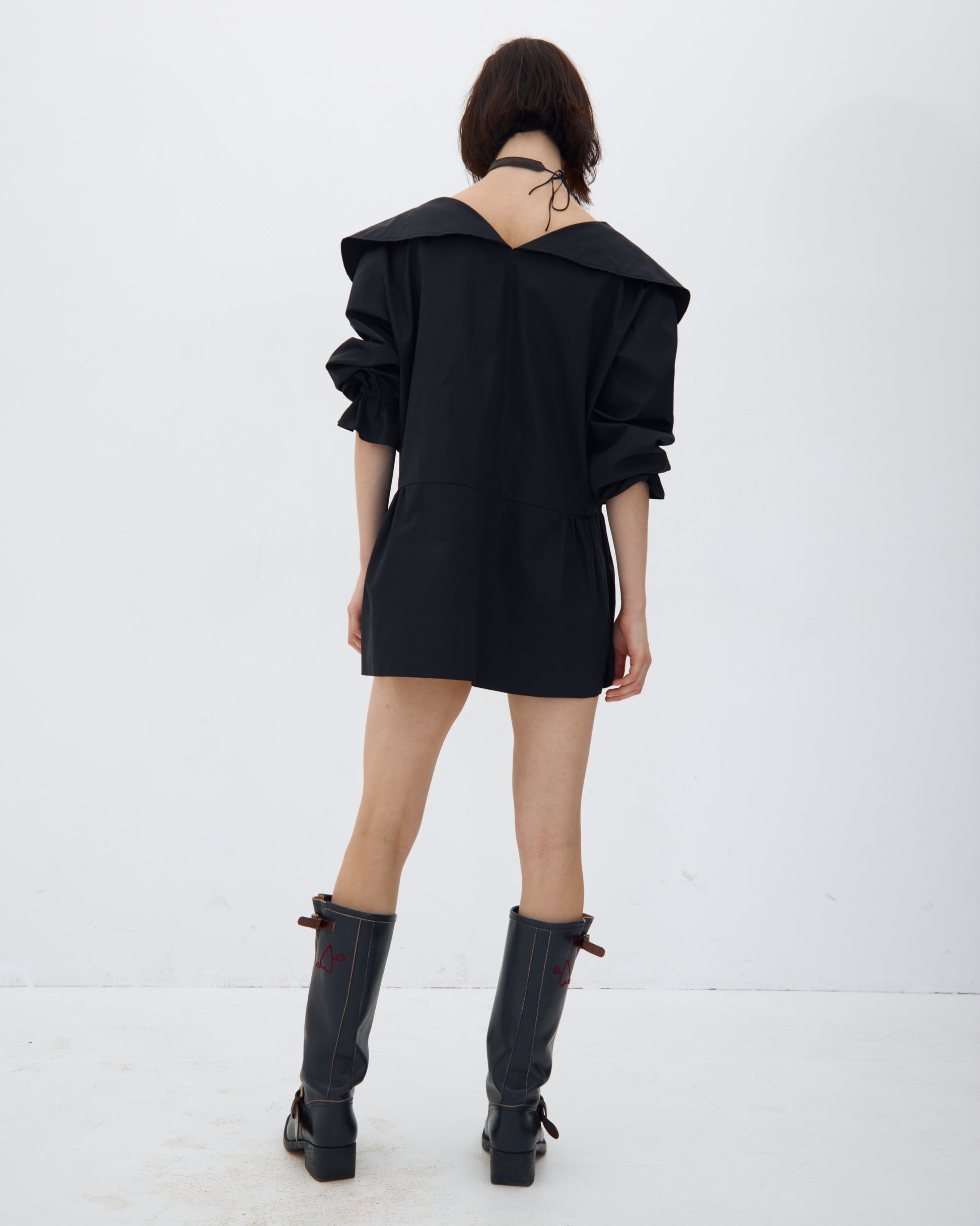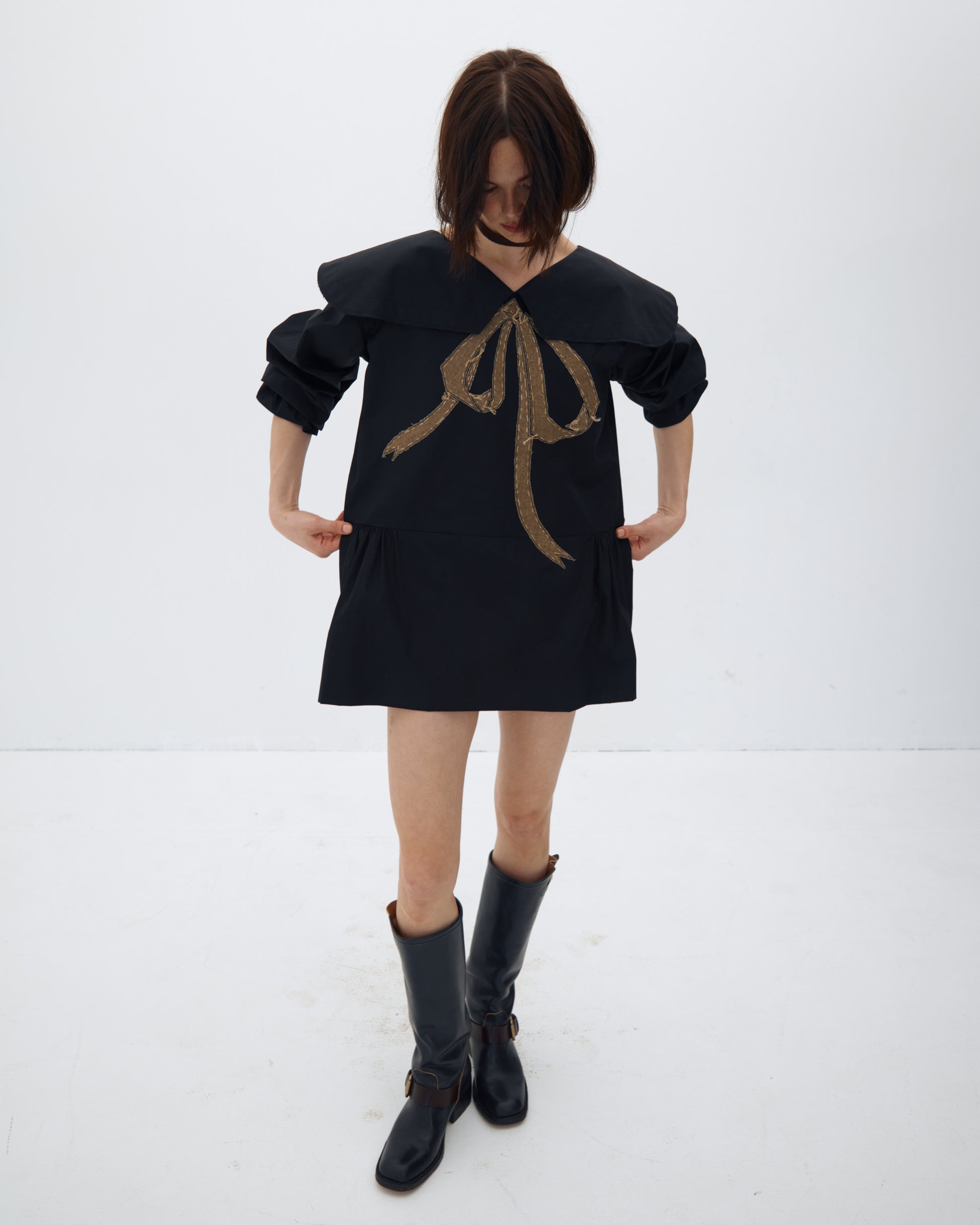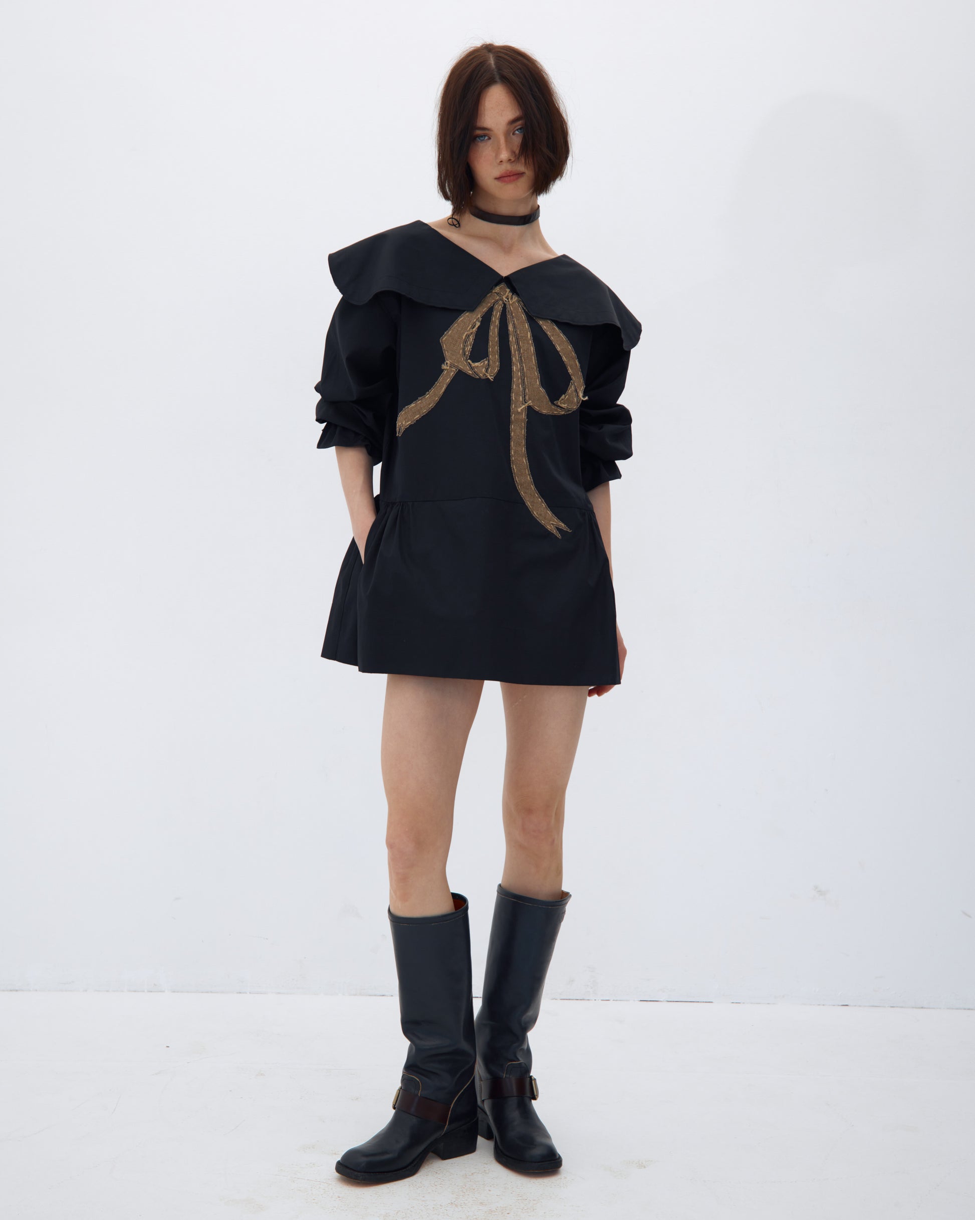КОТОНОВА СУКНЯ В СТИЛІ BABYDOLL З ШИРОКИМ ВІДКЛАДНИМ КОМІРОМ І ДОВГИМИ РУКАВАМИ НА РЕЗИНЦІ. ОЗДОБЛЕНА ДЕКОРАТИВНИМ БАНТОМ У ТЕХНІЦІ АПЛІКАЦІЇ. ДОВЖИНА — МІНІ.