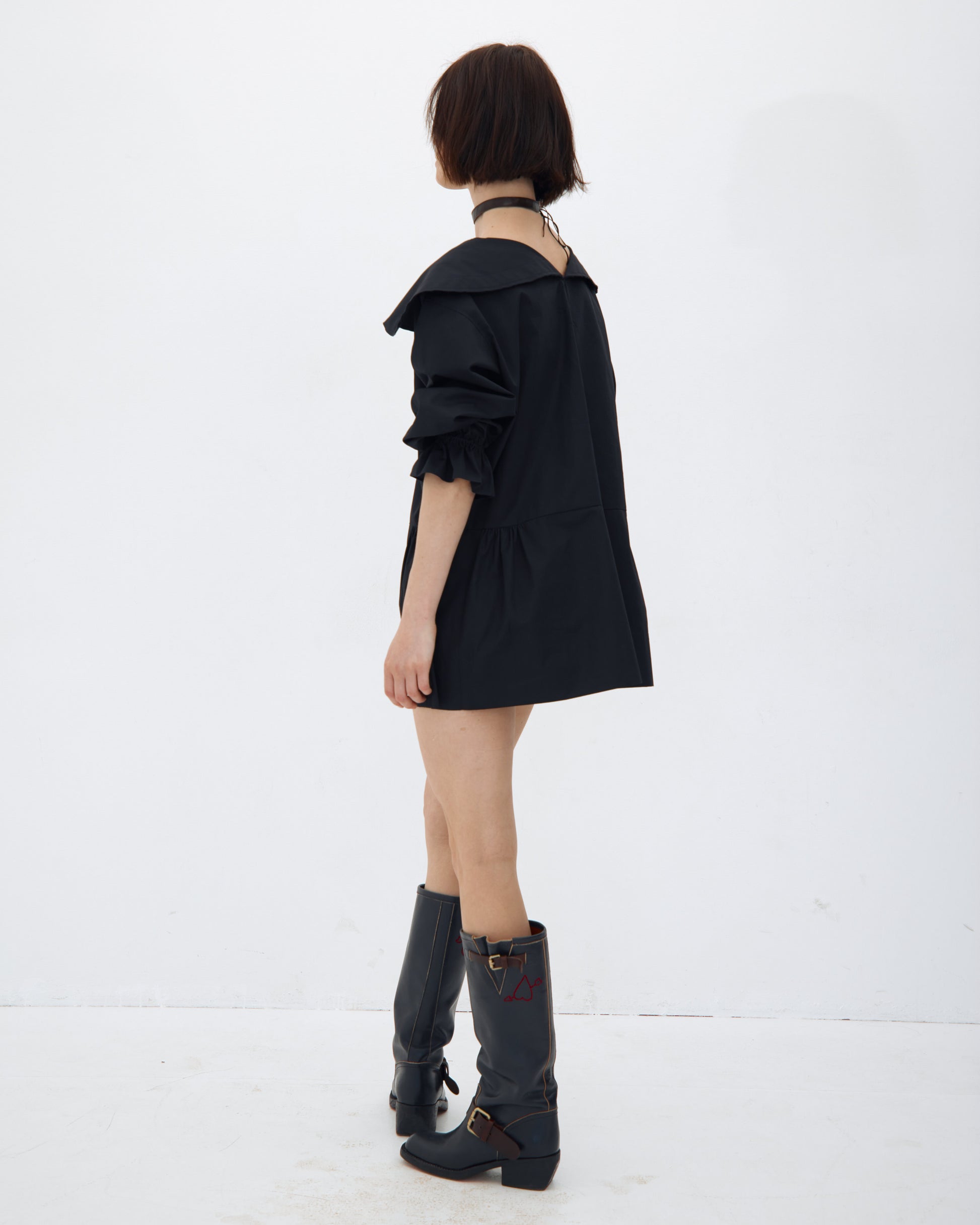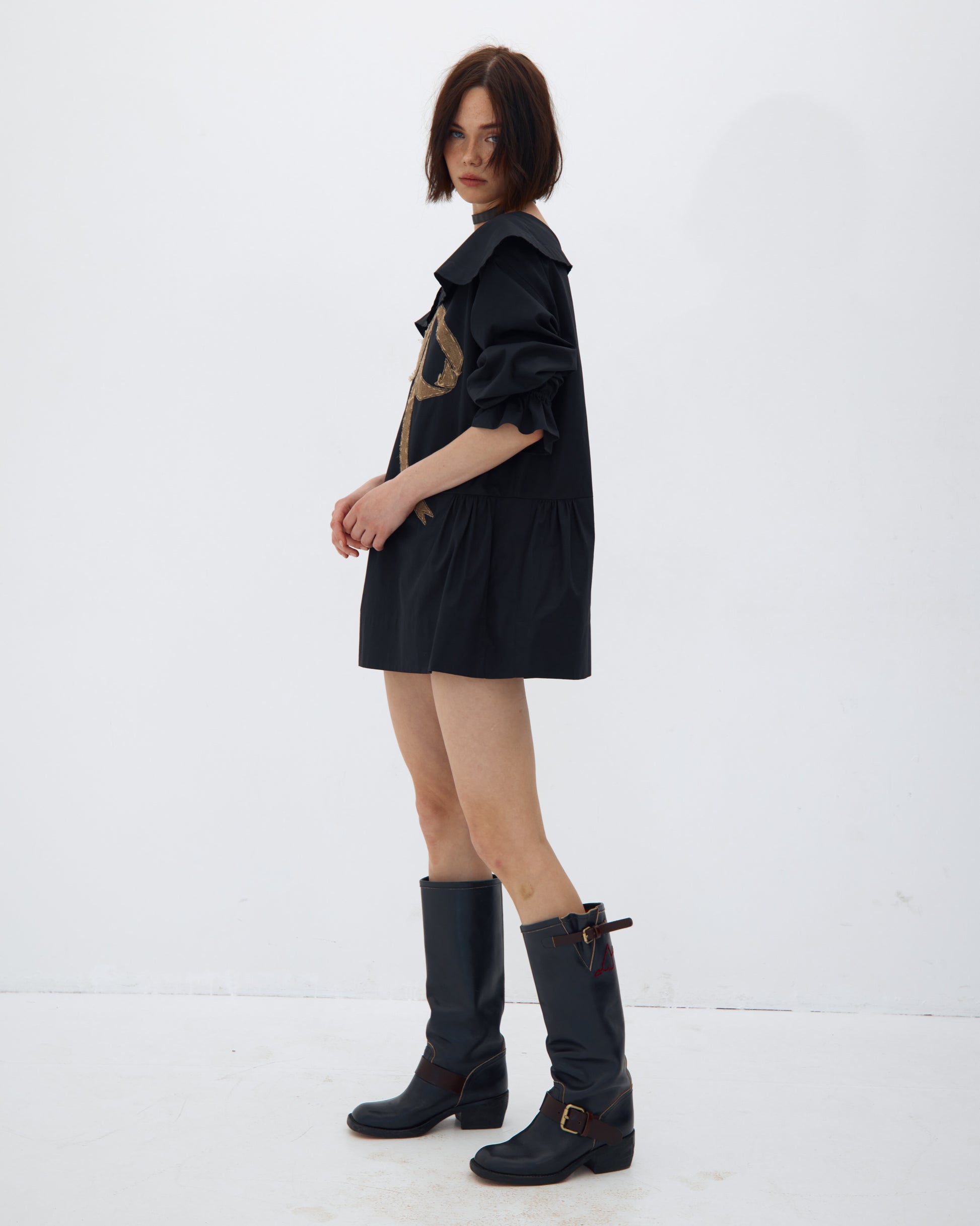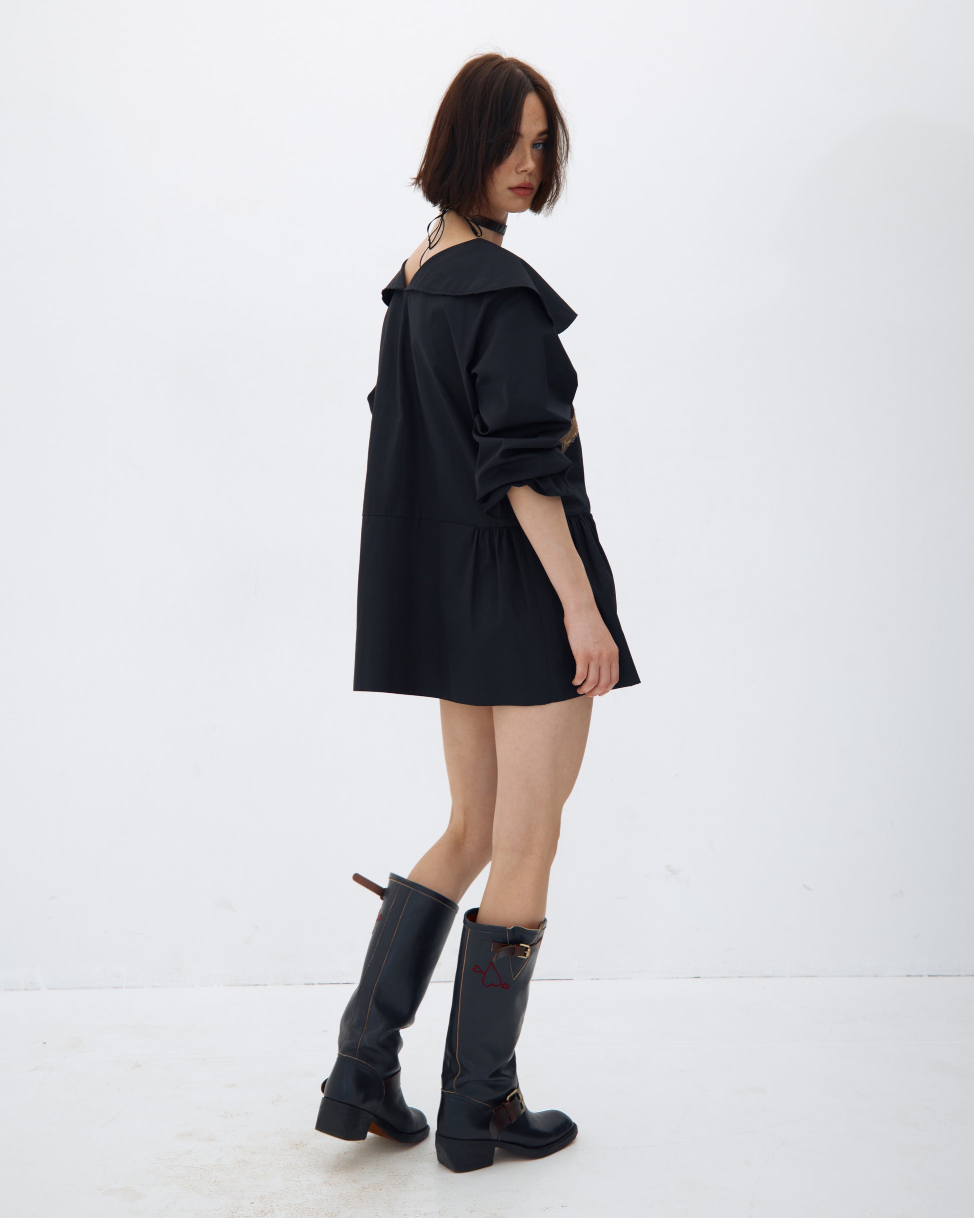 КОТОНОВА СУКНЯ В СТИЛІ BABYDOLL З ШИРОКИМ ВІДКЛАДНИМ КОМІРОМ І ДОВГИМИ РУКАВАМИ НА РЕЗИНЦІ. ОЗДОБЛЕНА ДЕКОРАТИВНИМ БАНТОМ У ТЕХНІЦІ АПЛІКАЦІЇ. ДОВЖИНА — МІНІ.