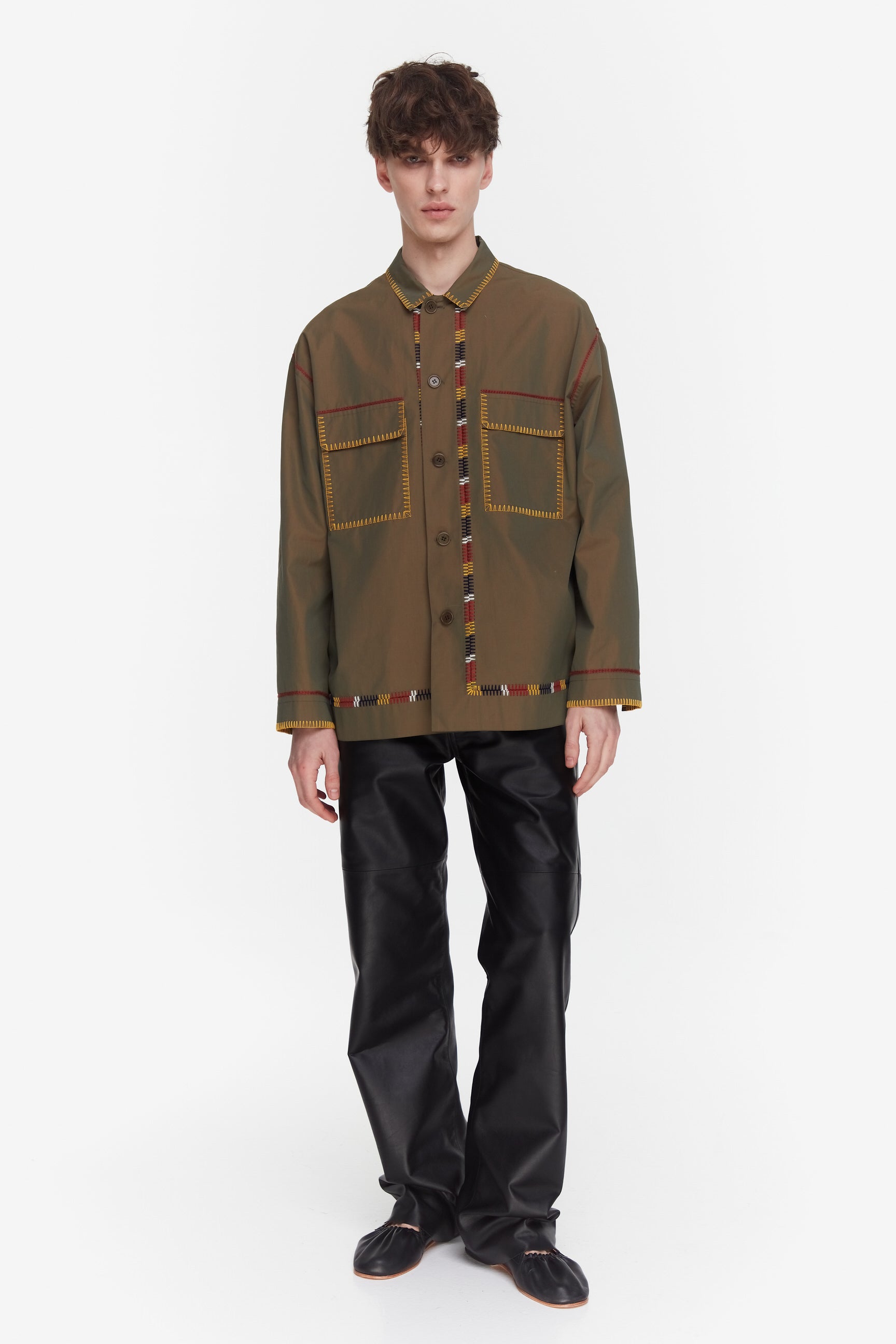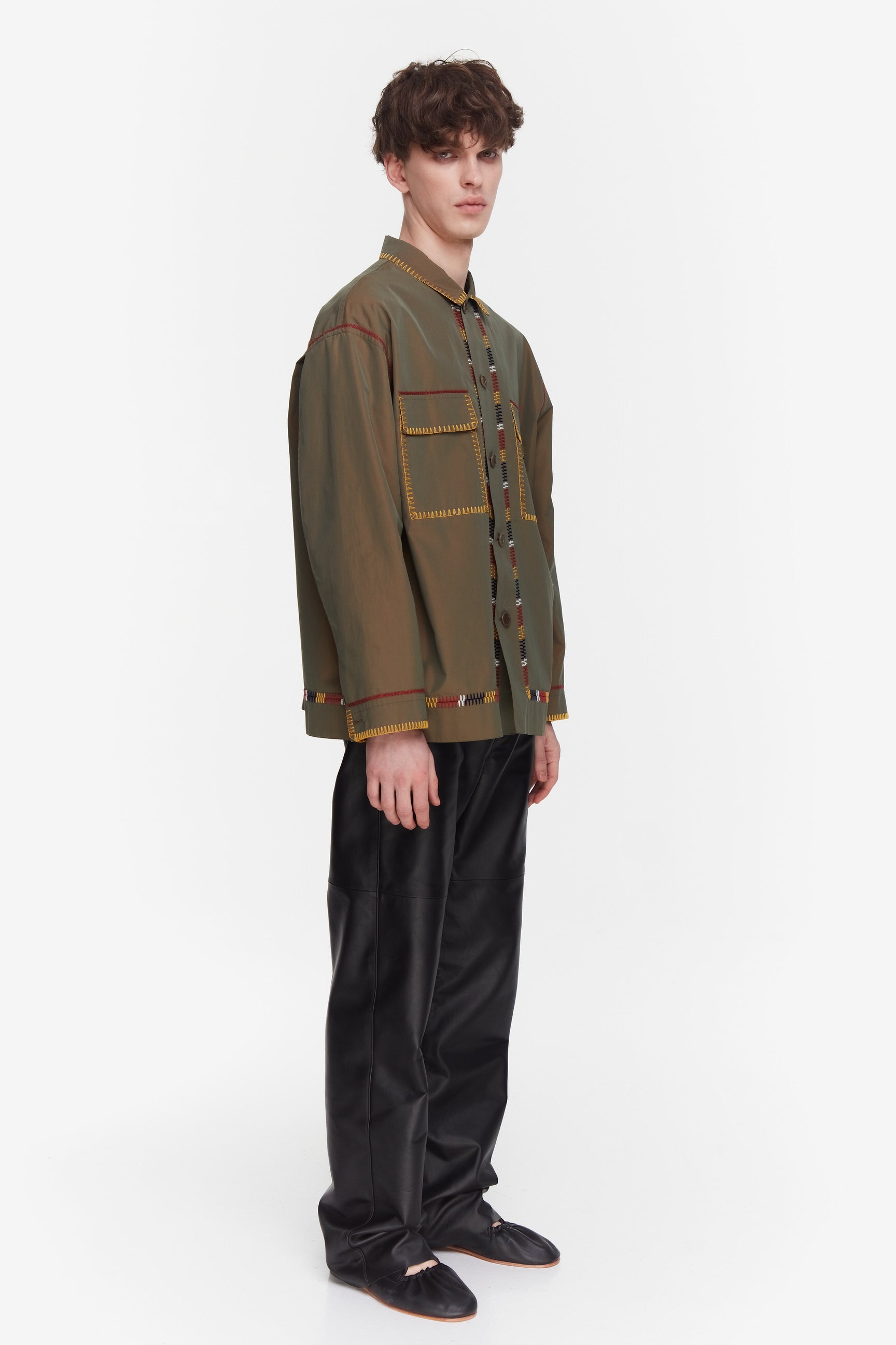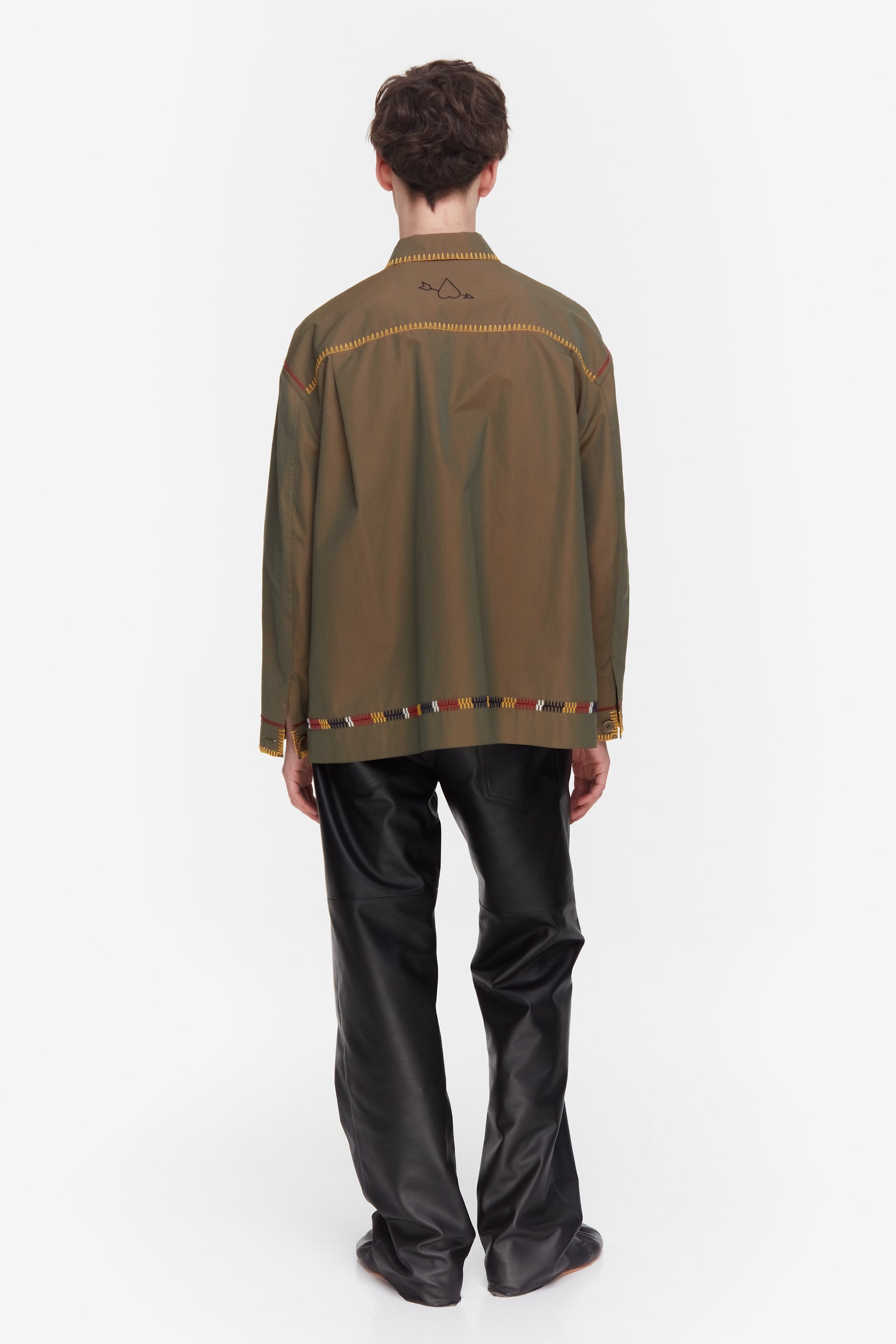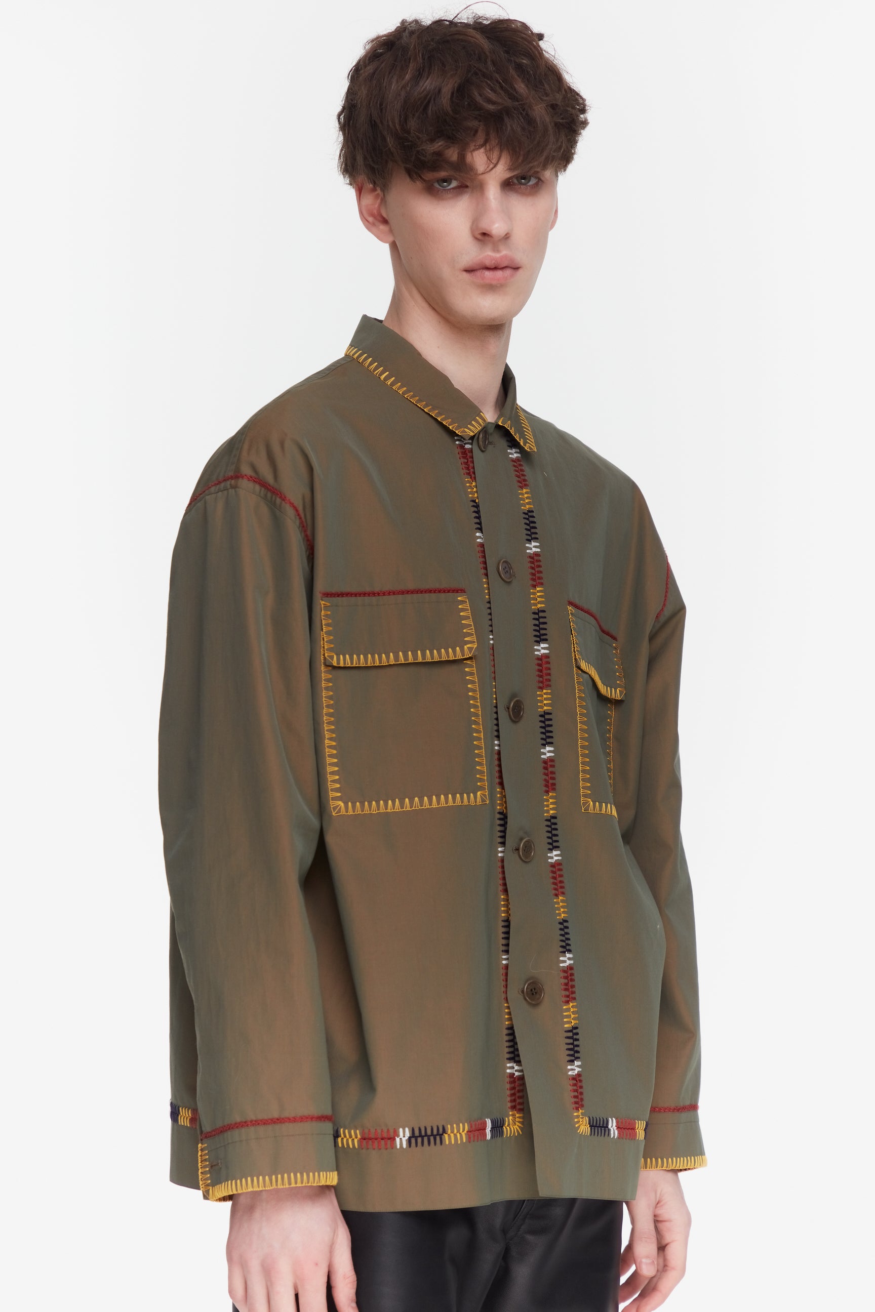СОРОЧКА В СТИЛІ МІЛІТАРІ З ЕЛЕМЕНТАМИ УКРАЇНСЬКОЇ НАРОДНОЇ ВИШИВКИ. КОЖНА ДЕТАЛЬ ЦІЄЇ СОРОЧКИ ВРУЧНУ ЗІБРАНА З'ЄДНУВАЛЬНИМ ШВОМ, НАДАЮЧИ ЇЙ ОСОБЛИВИЙ ХАРАКТЕР.