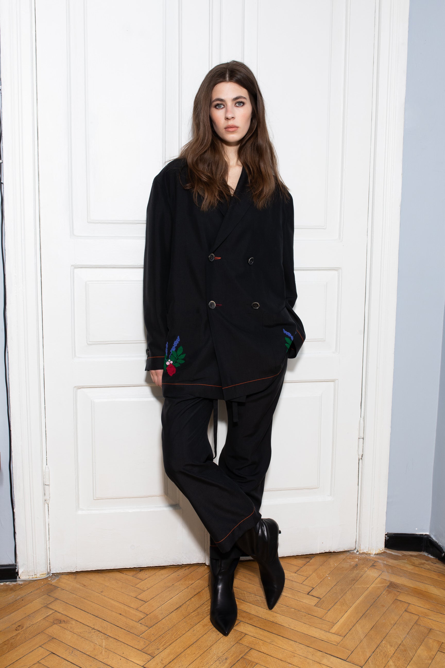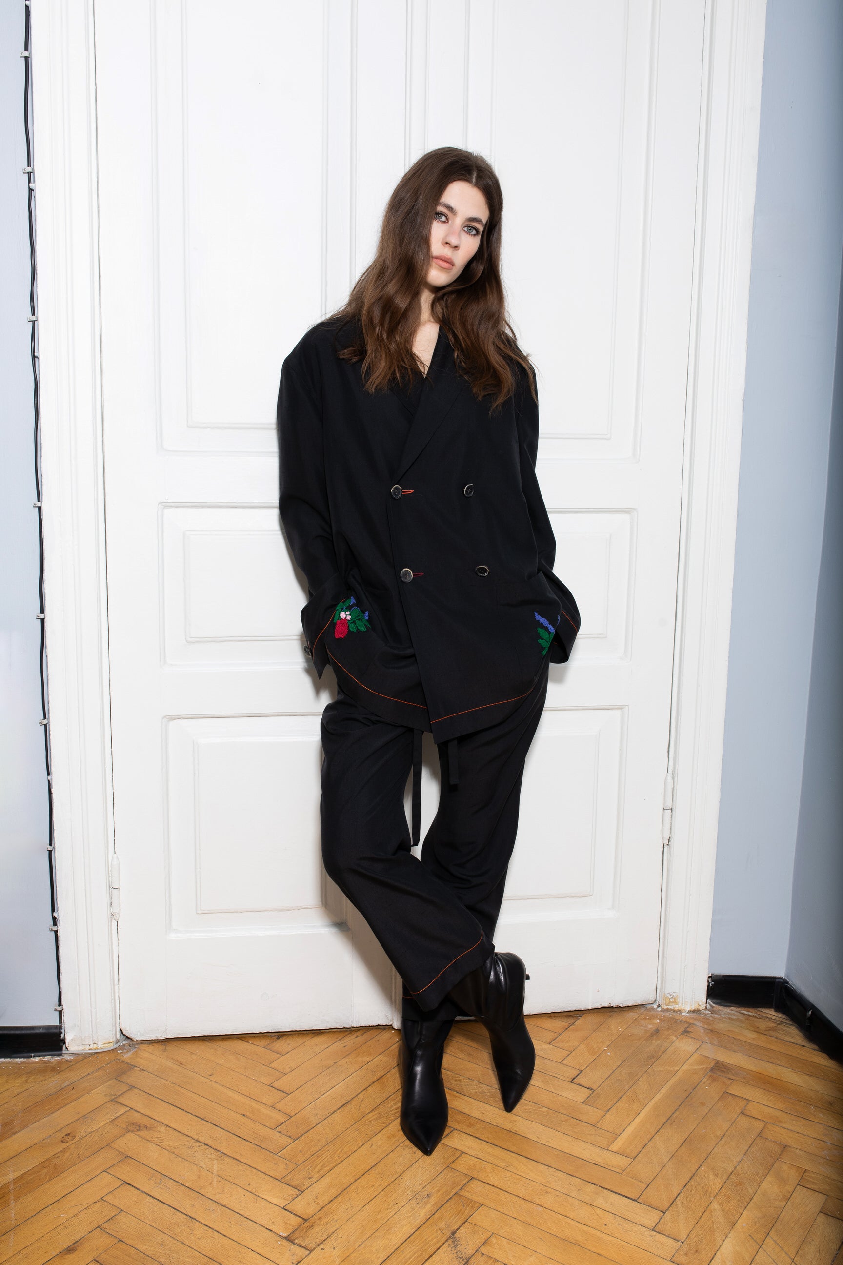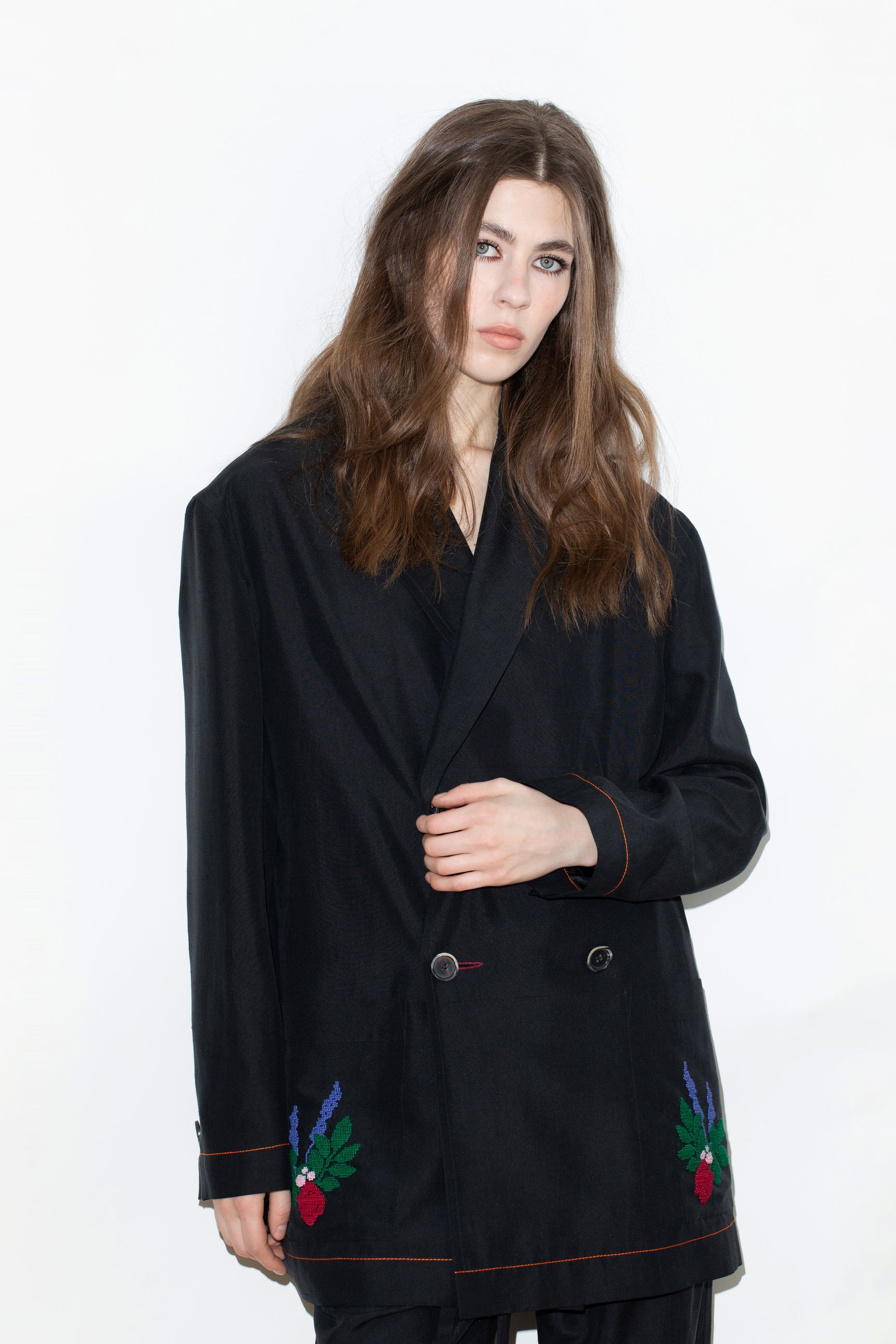 ТАКИЙ ПІДЖАК МИ ЗРОБИЛИ І В БЛІДО-ЖОВТІЙ ВЕРСІЇ З ШОВКОВОЇ ТАФТИ. ЦІ ПІДЖАКИ СИМВОЛІЗУЮТЬ ДЕНЬ І НІЧ – ХОЧ І МАЮТЬ ОДНУ Й ТУ САМУ ВИШИВКУ, ПРОТЕ У КОМБІНАЦІЇ З КОЛЬОРОМ СКЛАДАЮТЬ ВРАЖЕННЯ СОНЯЧНОГО ДНЯ І ТЕМНОЇ НОЧІ ПІД МІСЯЧНИМ СЯЙВОМ."