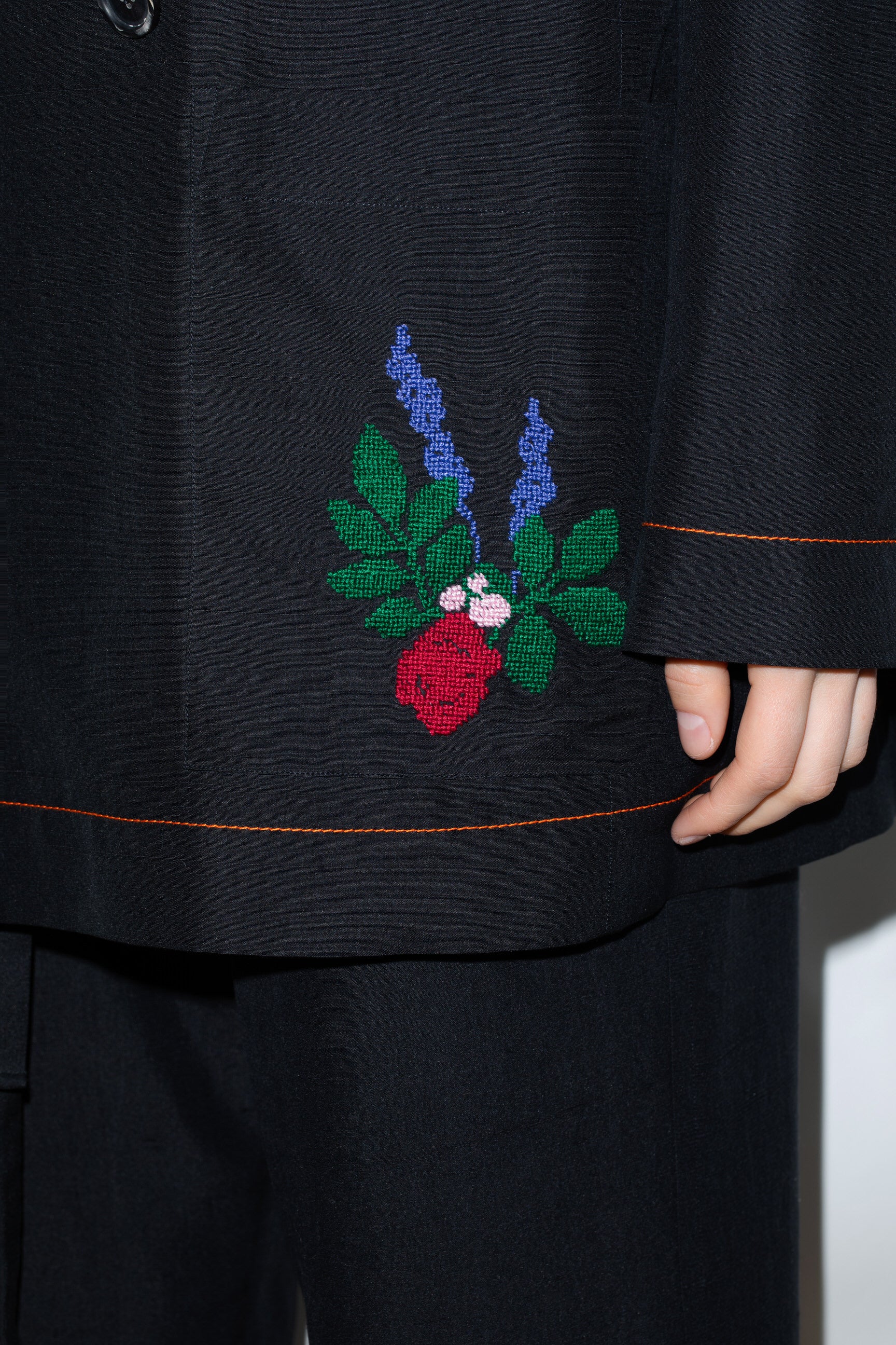 "ЦЕЙ ПІДЖАК ОЗДОБЛЕНИЙ КОНТРАСТНИМИ ДЕРЕВ'ЯНИМИ ҐУДЗИКАМИ ТА ВИШИВКОЮ НА КИШЕНЯХ. МАЛЮНОК ВИШИВКИ МИ ПІДГЛЕДІЛИ НА ФОТО ГАГАУЗЬКОЇ ЦЕРКВИ В БЕССАРАБІЇ У ПЕРІОД СВЯТА ТРІЙЦІ – НА ПІДЛОЗІ БУЛИ ПОКЛАДЕНІ БУКЕТИ КВІТІВ, ТАК ПАРАФІЯНИ ПРИКРАШАЮТЬ ЦЕРКВУ. ЦЕ БУЛО ТАК ГАРНО, ЩО МИ ВИРІШИЛИ ЗАПОЗИЧИТИ СОБІ ТОЙ БУКЕТИК ЗА КОЛЬОРОМ І ЗАЛИШИТИ САМЕ ЦІ КВІТИ. РОЖЕВА І ТЕМНО ЧЕРВОНА ТРОЯНДА, ГОРІХОВЕ ЛИСТЯ І ДЕЛЬФІНІУМ.