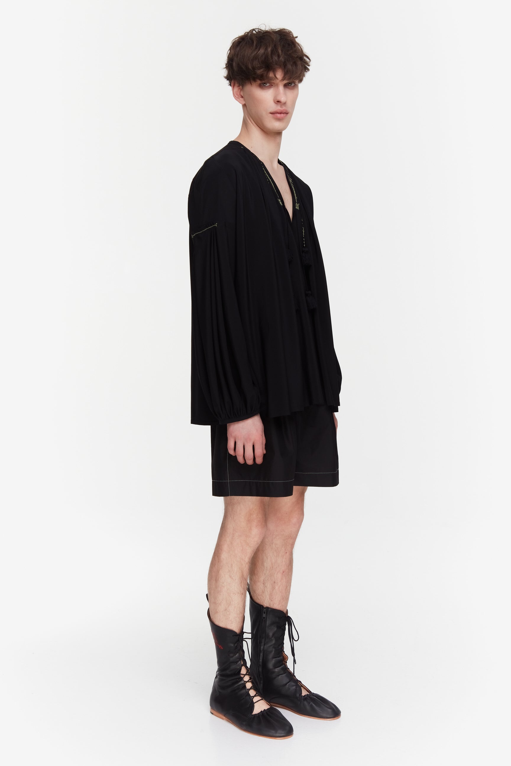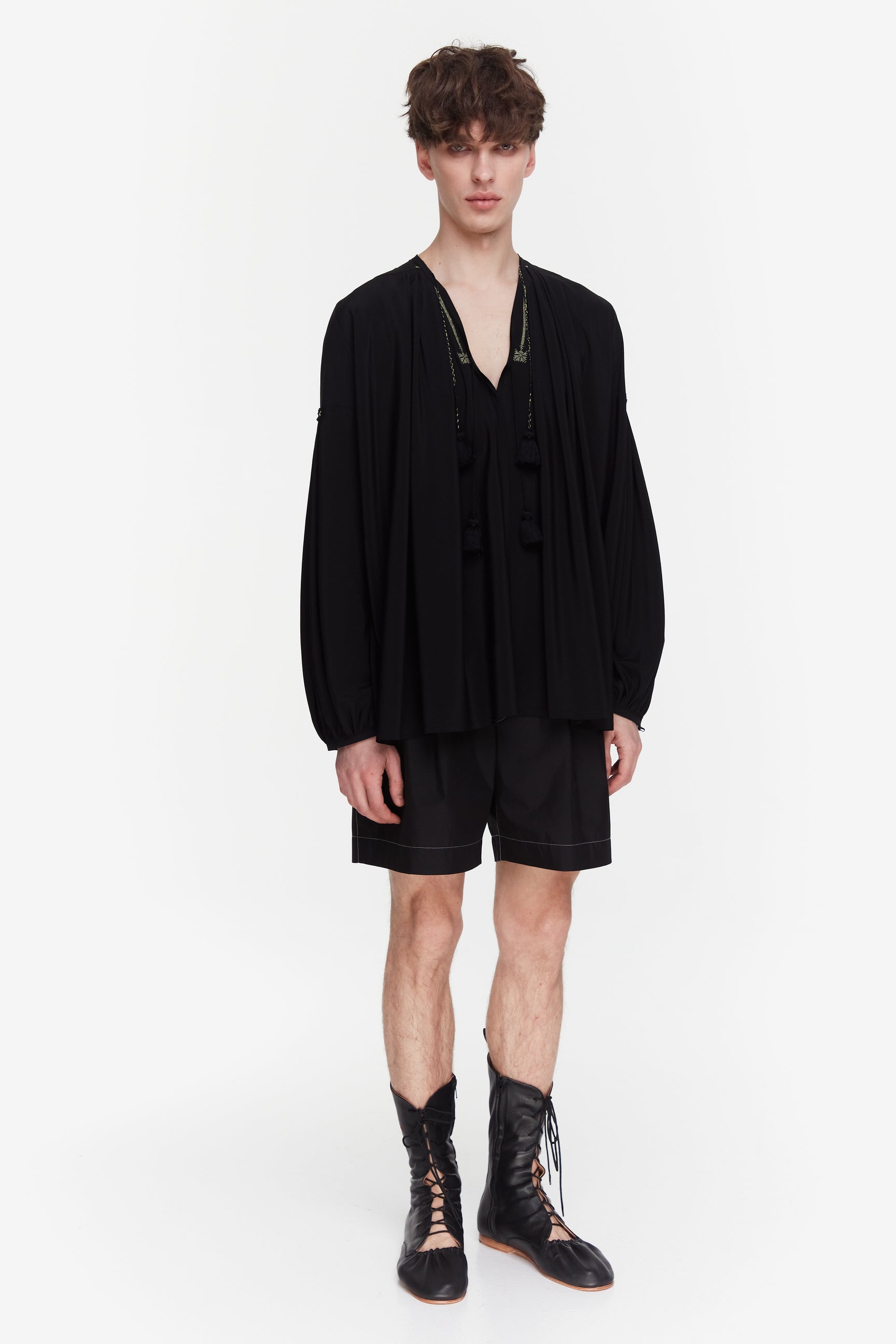ЛЕГКА СОРОЧКА, ОБ’ЄМНОГО КРОЮ. ОЗДОБЛЕНА КОНТРАСТНИМ КВІТКОВИМ ОРНАМЕНТОМ ТА АКЦЕНТНИМИ КУТАСИКАМИ.