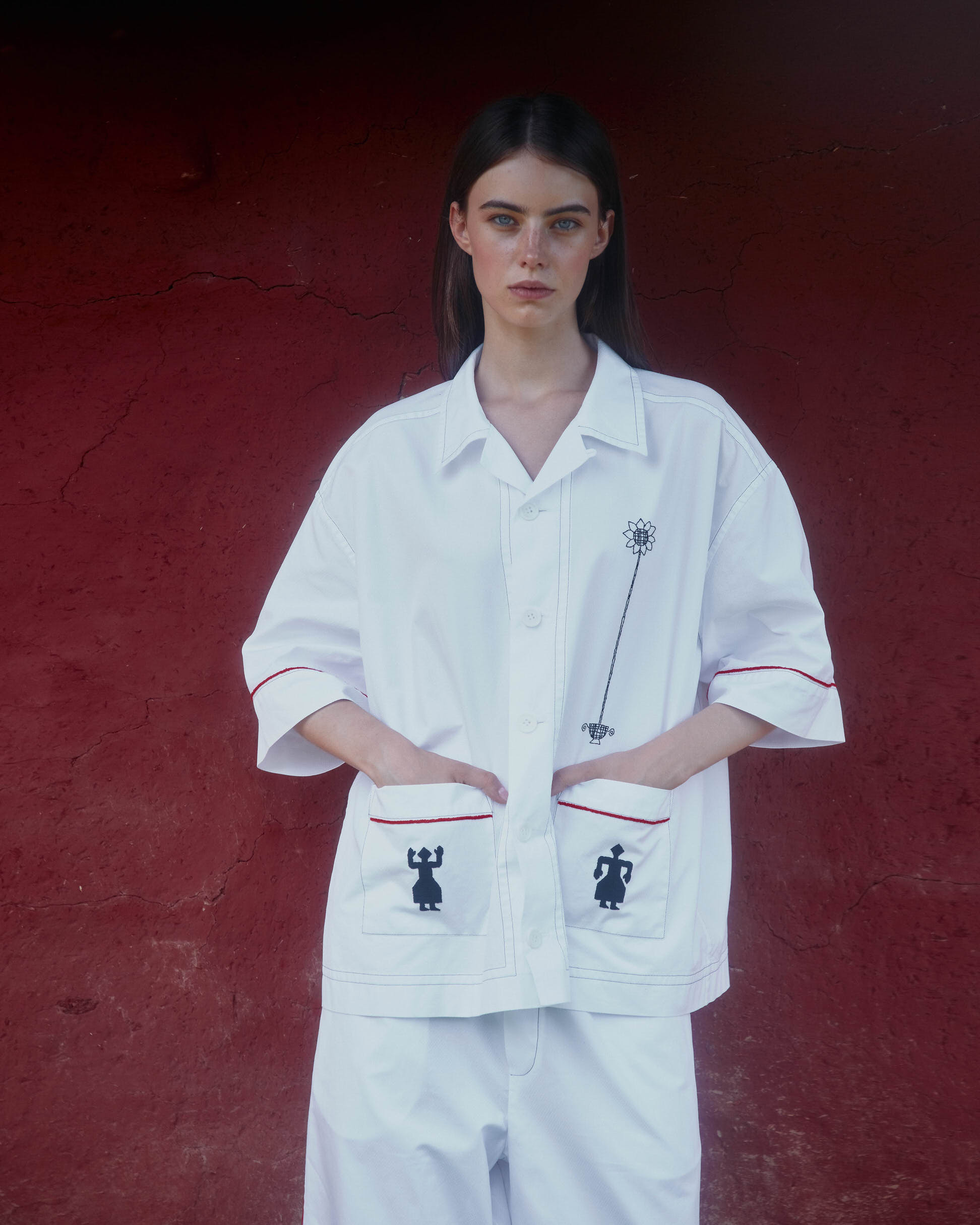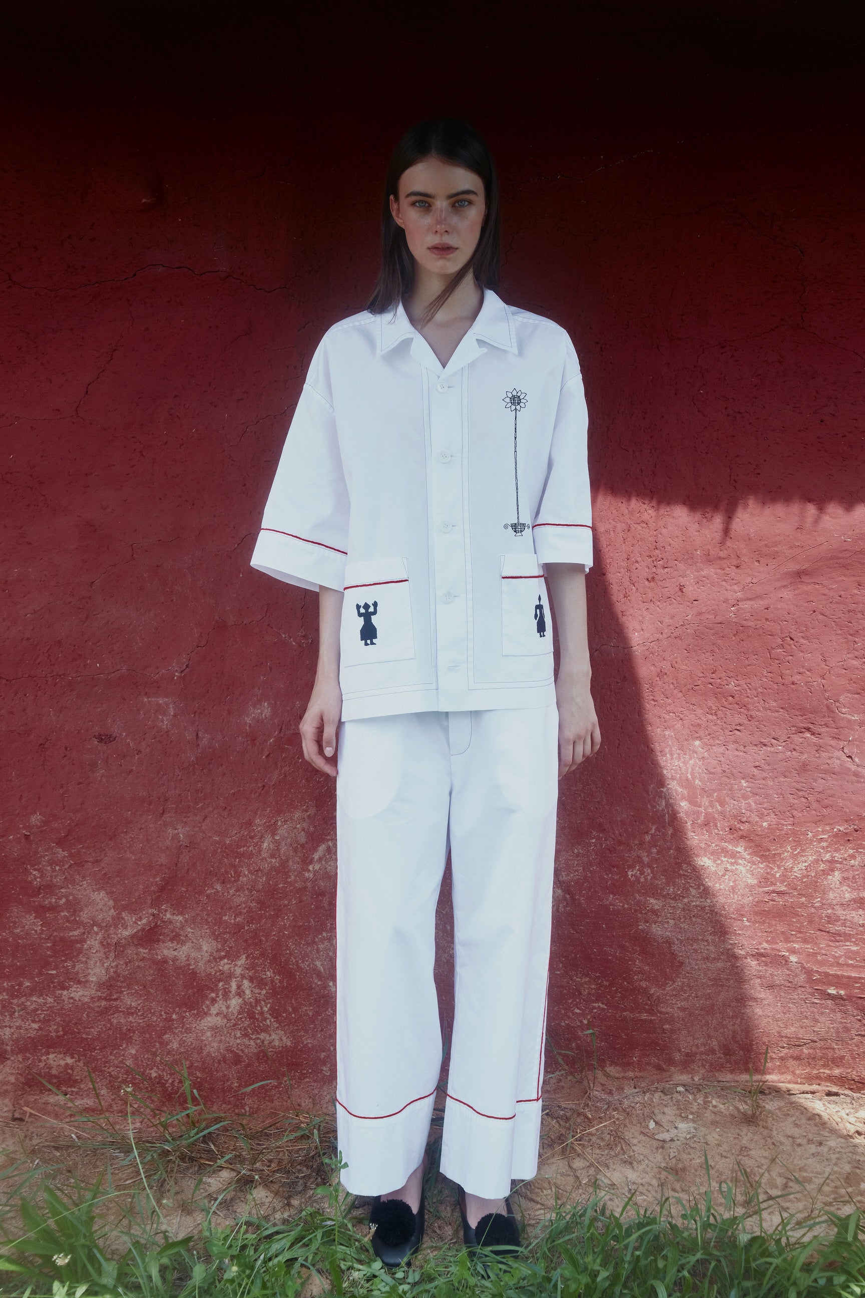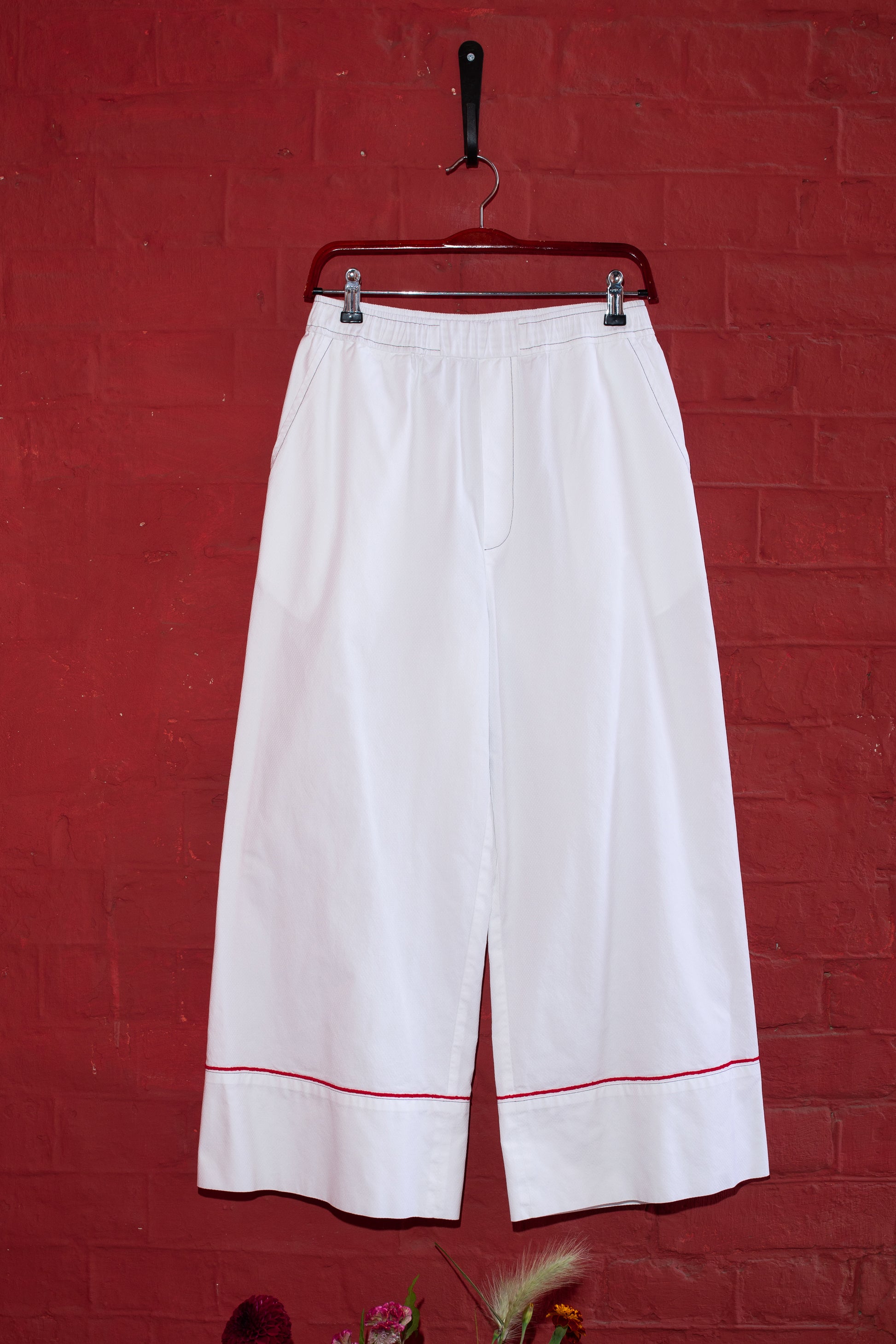 БІЛІ ПІЖАМНІ БАВОВНЯНІ ШТАНИ З ВИШИТИМИ ВРУЧНУ КОНТРАСТНИМИ КАНТАМИ.