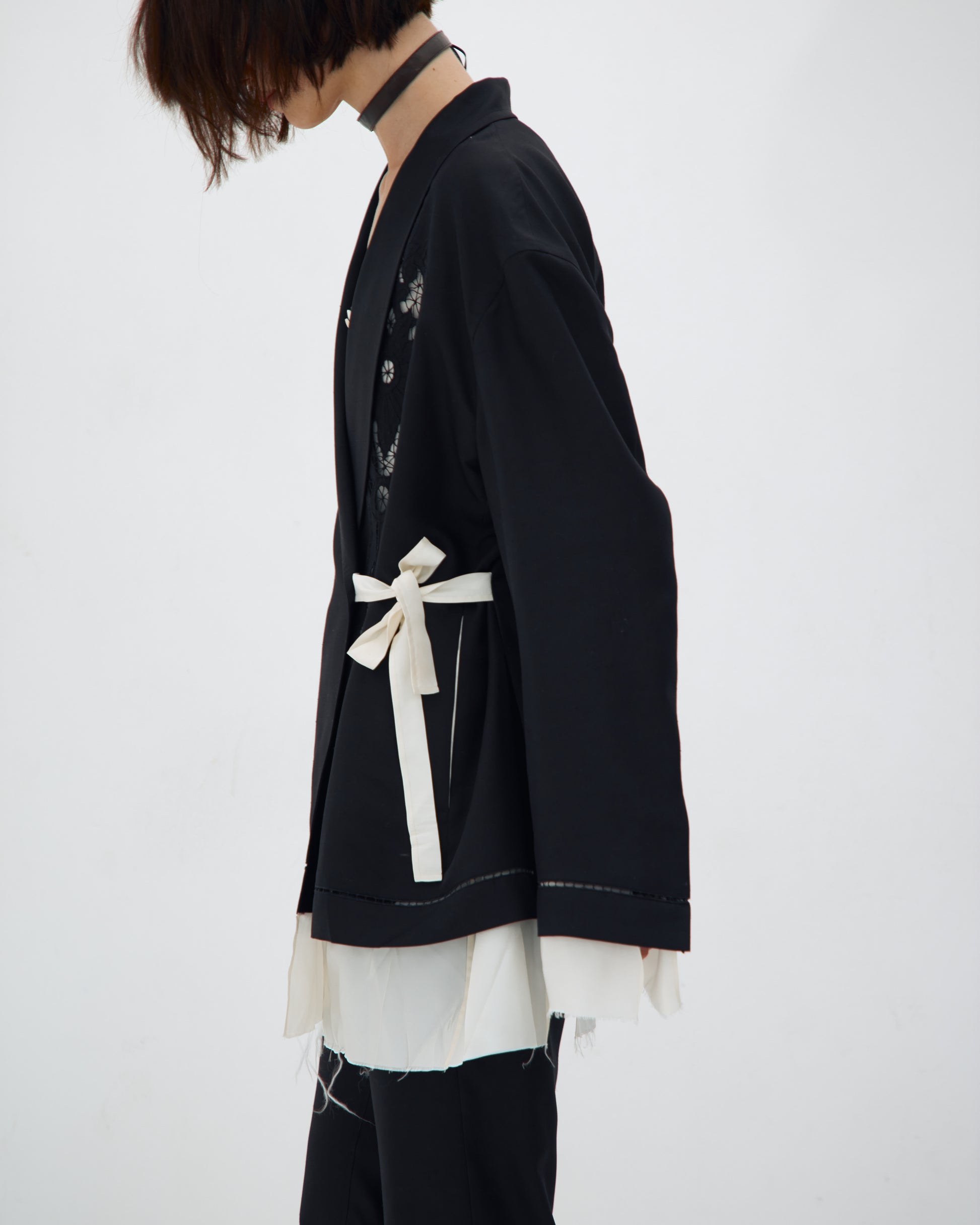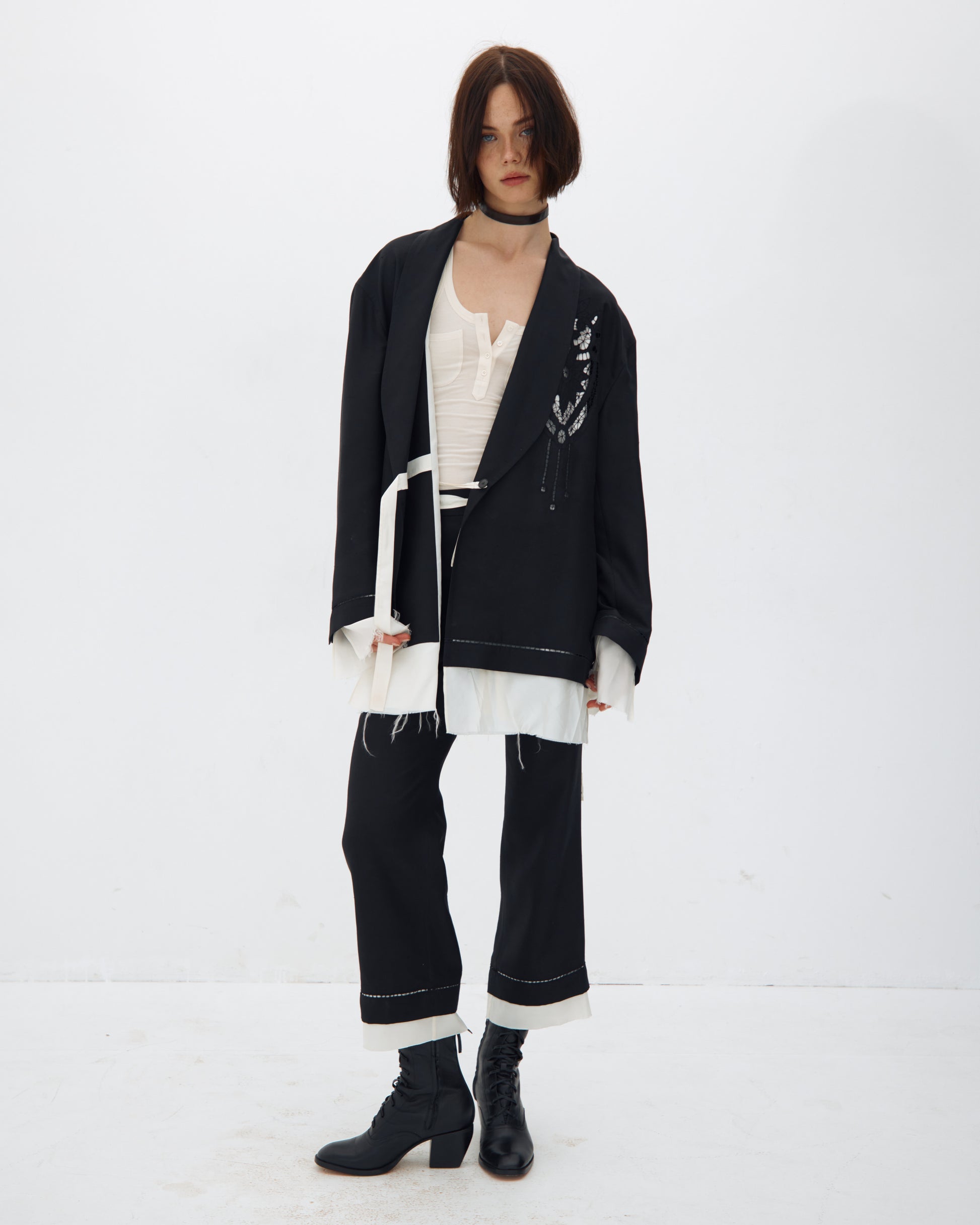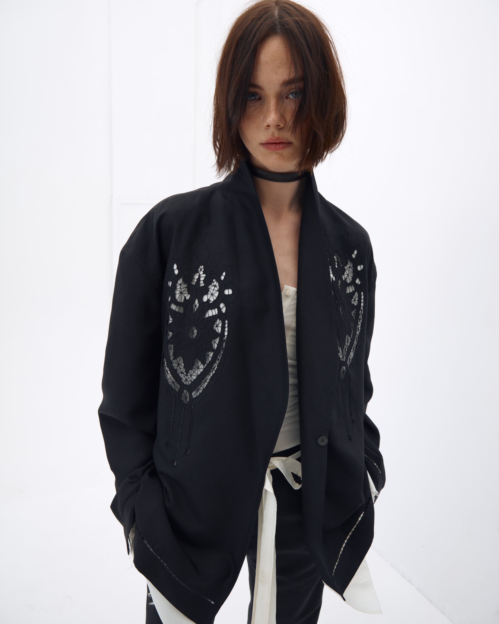 ПІДЖАК ВІЛЬНОГО КРОЮ З ЗАПАХОМ. ВИКОНАНИЙ ІЗ 100% ШОВКОВОЇ ЧІСУЧІ, НА ПІДКЛАДІ КОНТРАСТНОГО КОЛЬОРУ. ПІДКЛАД ВИПУЩЕНИЙ ПО НИЗУ І МАЄ НЕОБРОБЛЕНИЙ КРАЙ. МОДЕЛЬ ПРЯМОГО СИЛУЕТУ, ТРОХИ НАГАДУЄ КІМОНО. МАЄ СПУЩЕНУ ЛІНІЮ ПЛЕЧА ТА ВНУТРІШНЮ ЗАВ’ЯЗКУ. ОЗДОБЛЕНИЙ ВИШИВКОЮ РІШЕЛЬЄ РУЧНОЇ РОБОТИ.