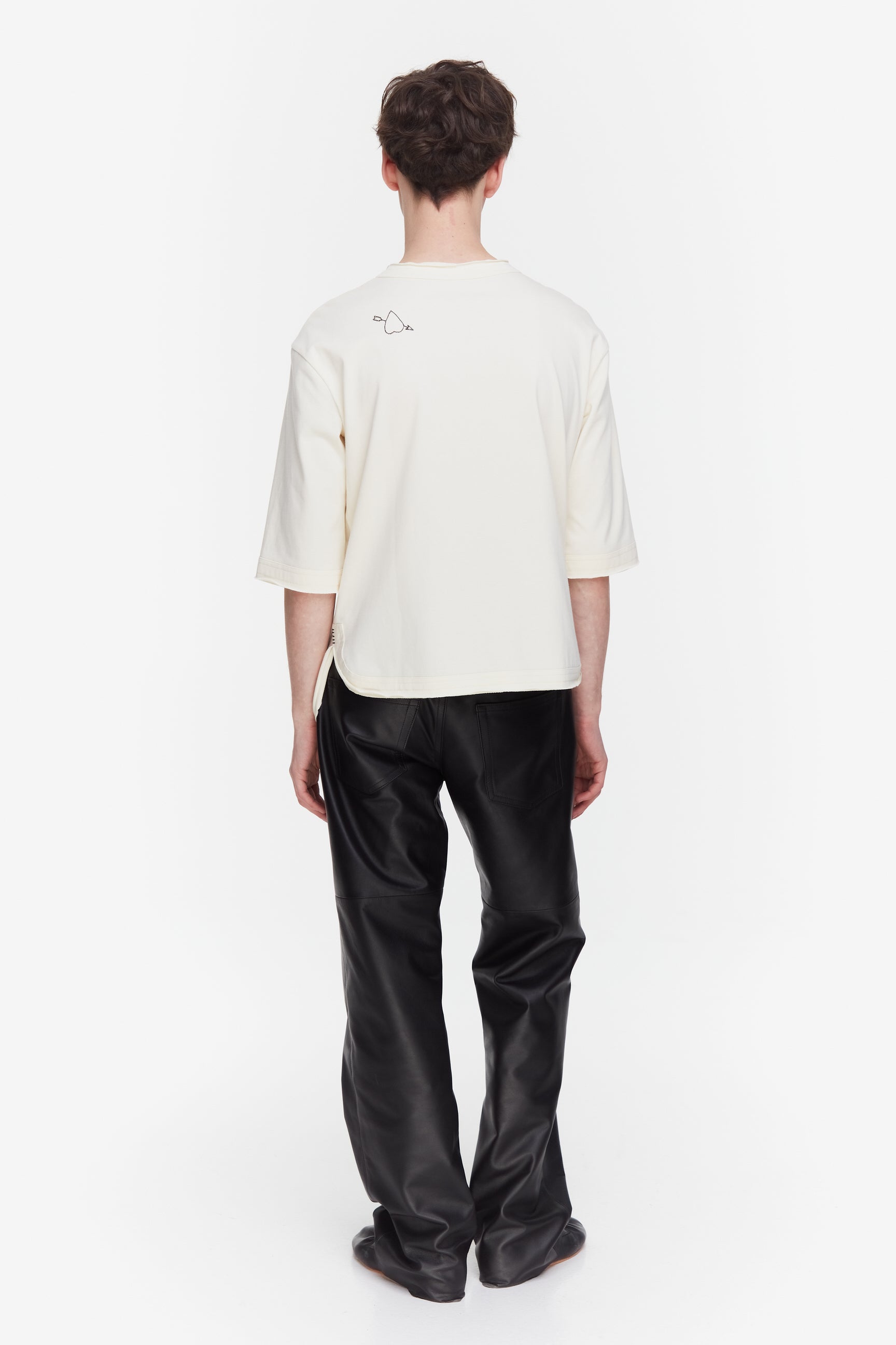 ФУТБОЛКА З РУКАВОМ ТРИ ЧВЕРТІ Й ОВАЛЬНИМИ ОБЛЯМІВКАМИ У МІНІМАЛІСТИЧНОМУ ДИЗАЙНІ. СПЕРЕДУ ДОВЖИНА БІЛЬША, НІЖ НА СПИНЦІ.